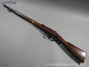 This is an 18 Bore single shot, black powder, breech loading M1859 Army pattern rifle made at Kongsberg in 1860. Only 1300 unconverted original M1859 Pattern rifles were made. The breech opening is activated by a side lever with an eccentric cam which when lifted upwards opens the rear pivoted breech which takes a Minie ball in a paper cartridge. This is a ‘under-hammer’ rifle with the curved hammer guard actually being the main spring for the hammer, the hammer can be moved downwards once the breech is opened to place the percussion cap on the nipple. The rifle is extensively marked, the breech with 1860/crown/K