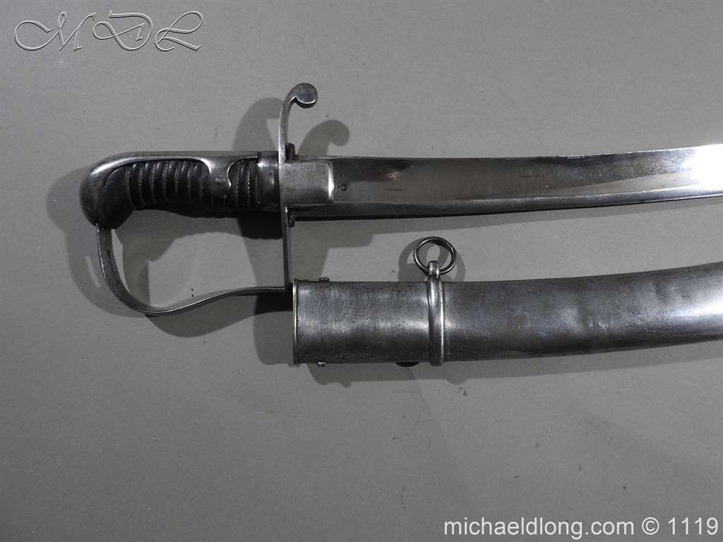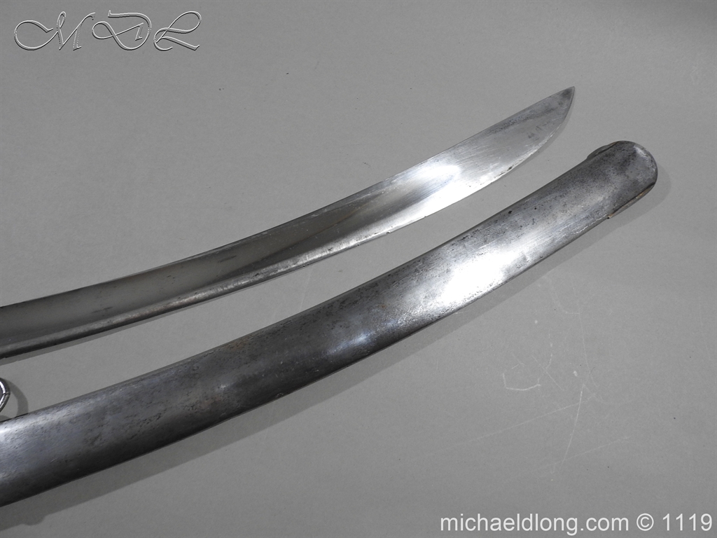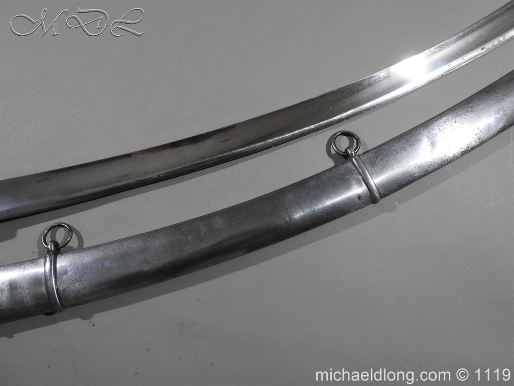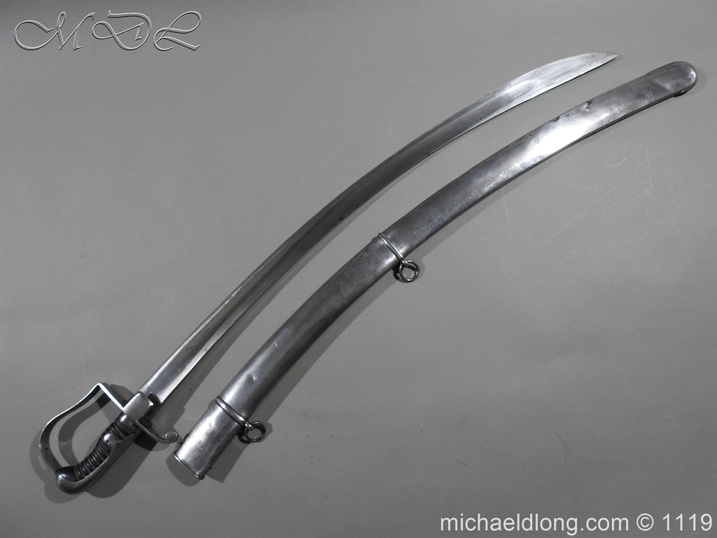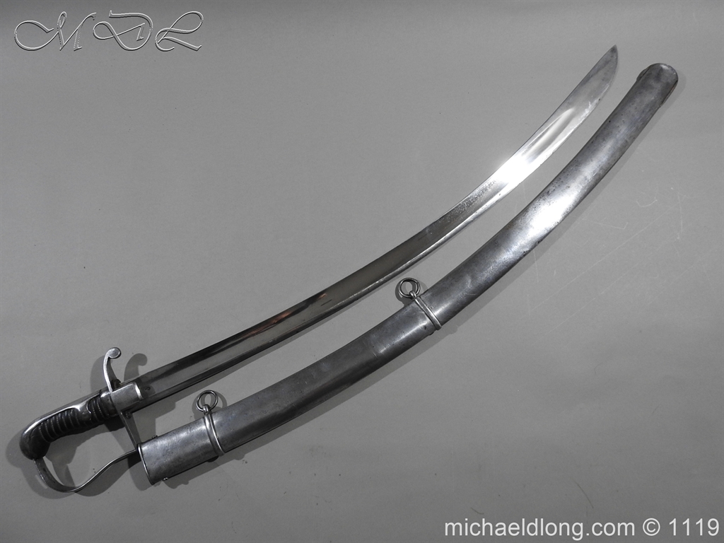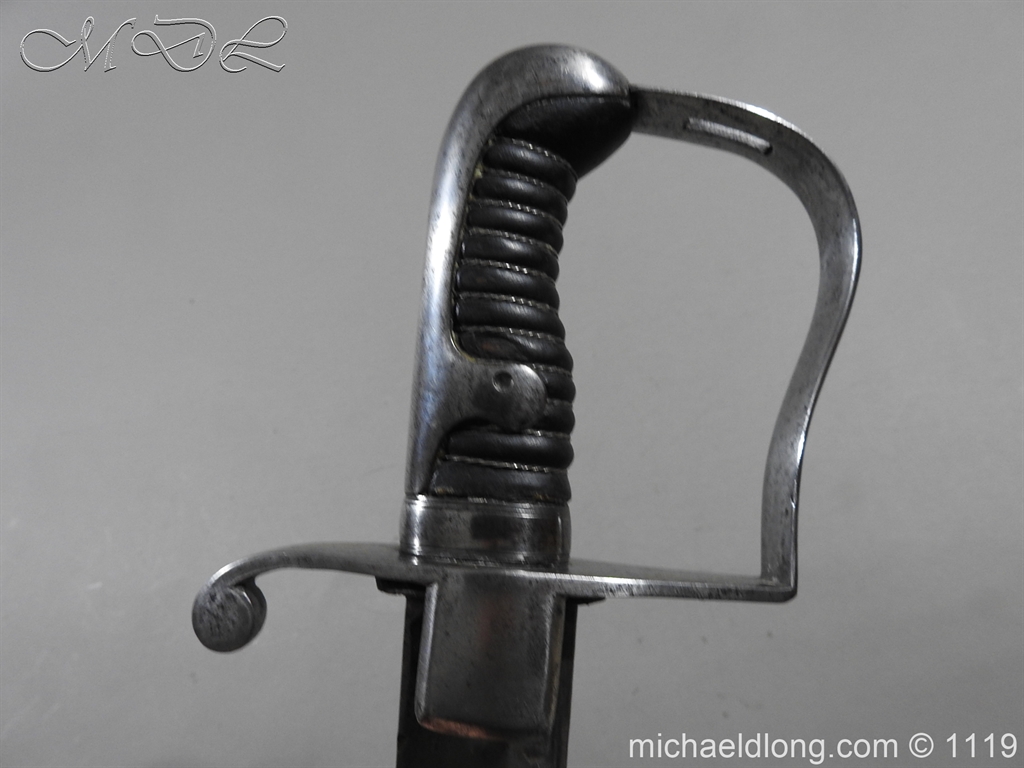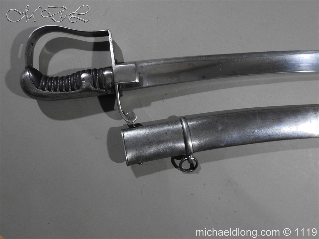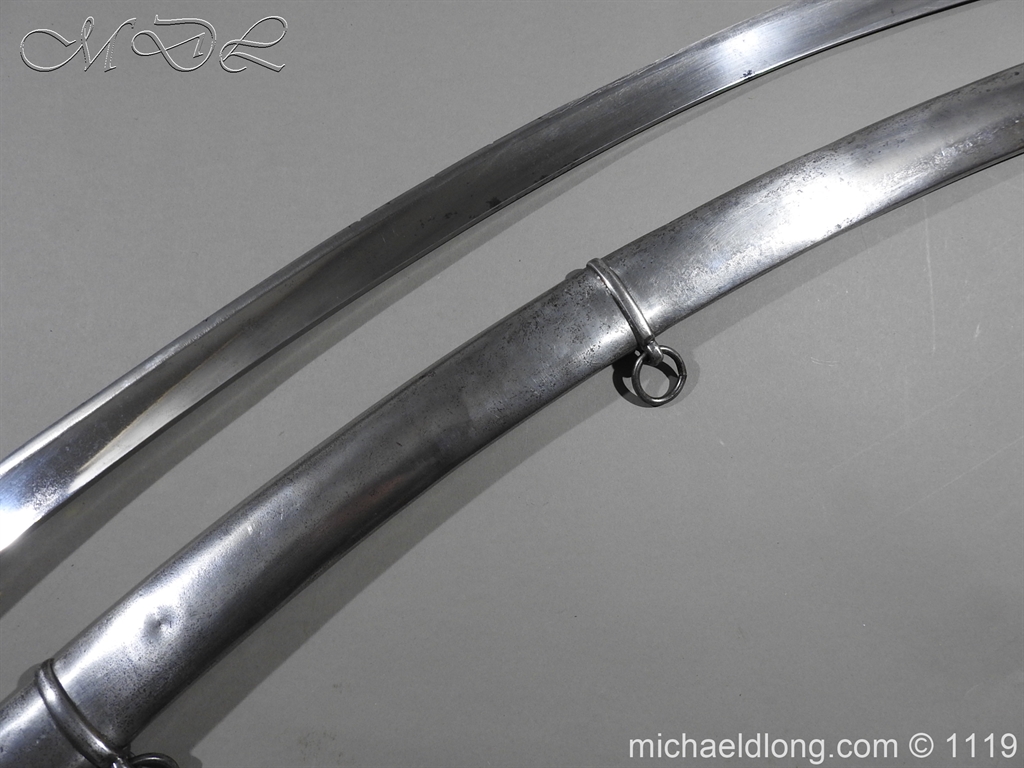 1796 Light Cavalry officer’s fighting sword, steel regulation hilt but with square langets with leather bound with twisted silver wire. The curved blade in very good condition with inspection mark crown over 1 it is complete with original scabbard with 2 loose rings overall length 95cm blade 82cm
