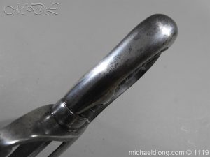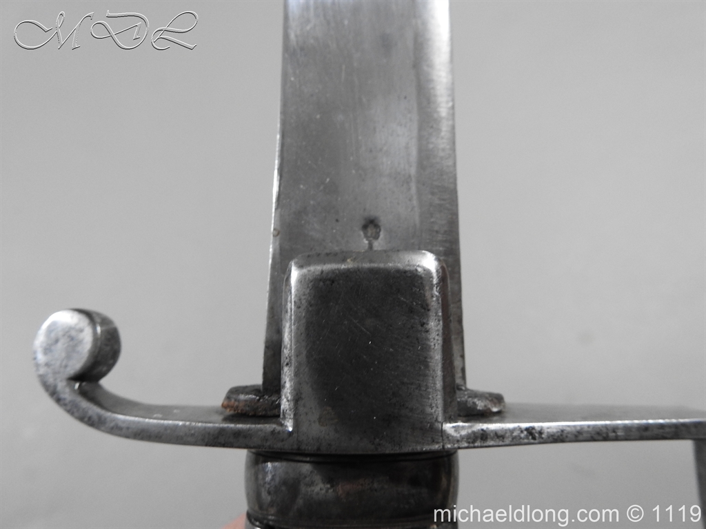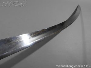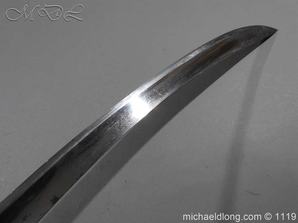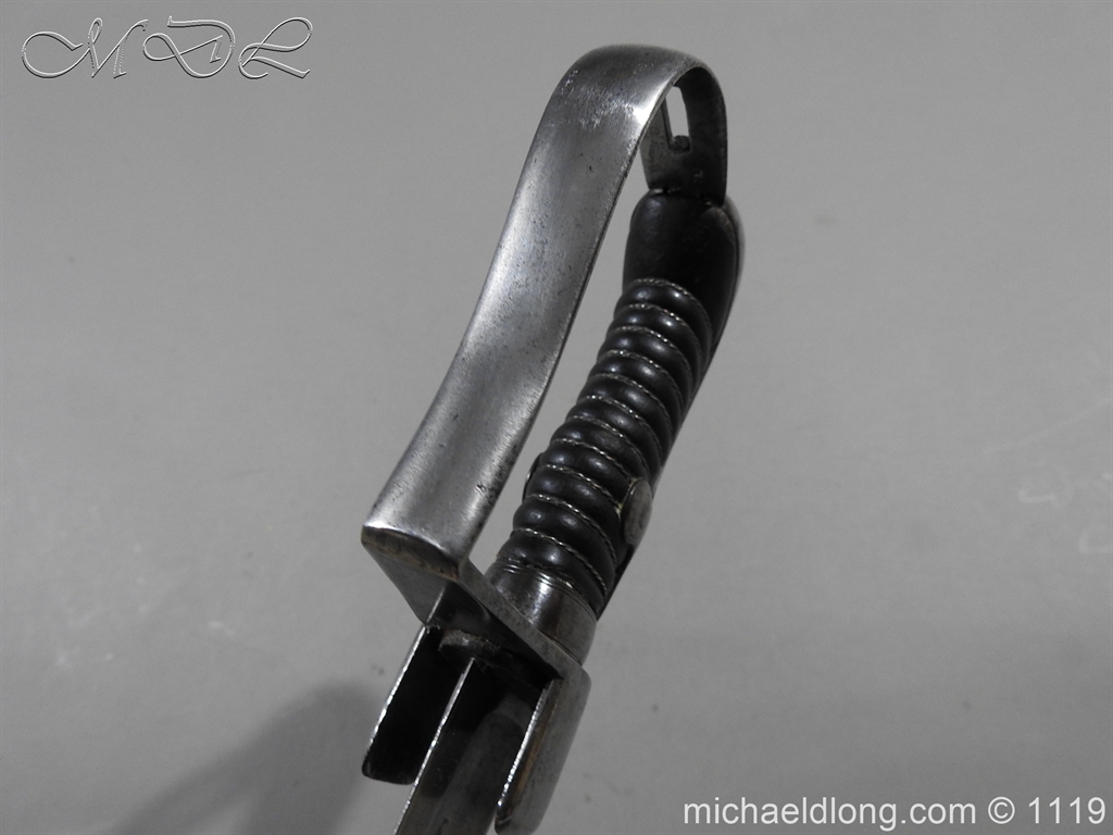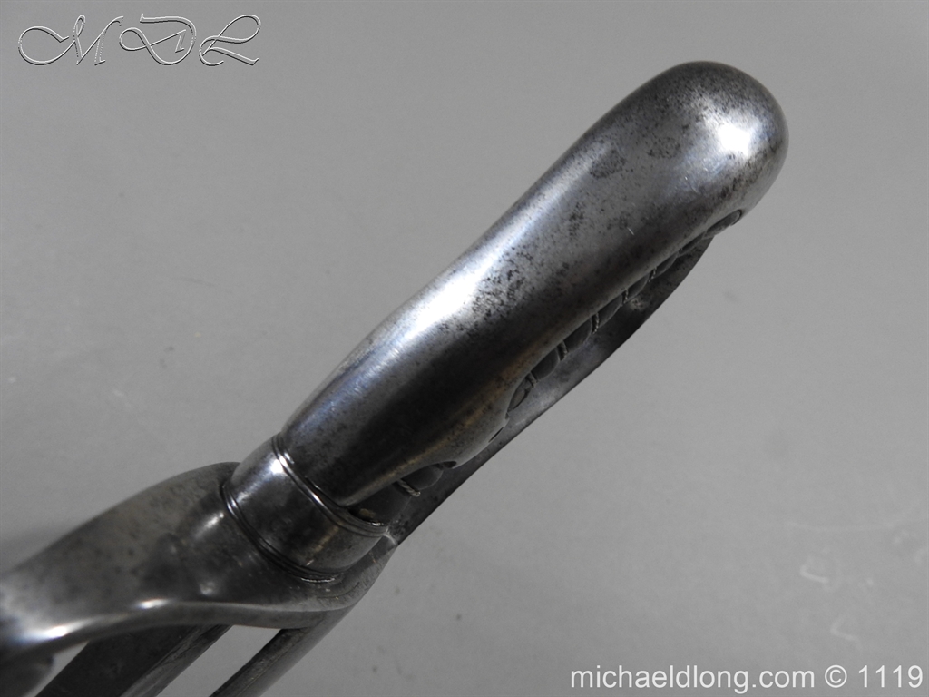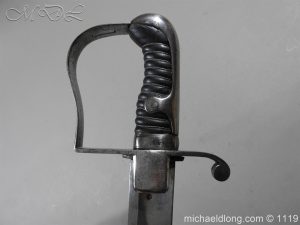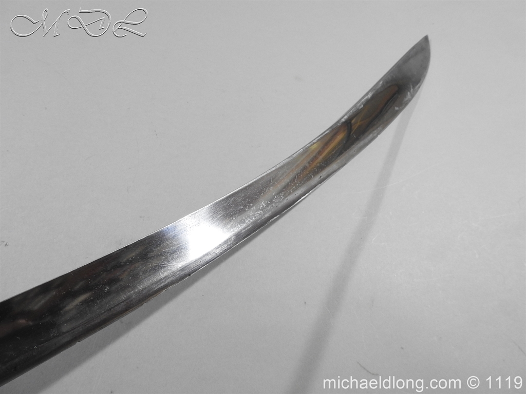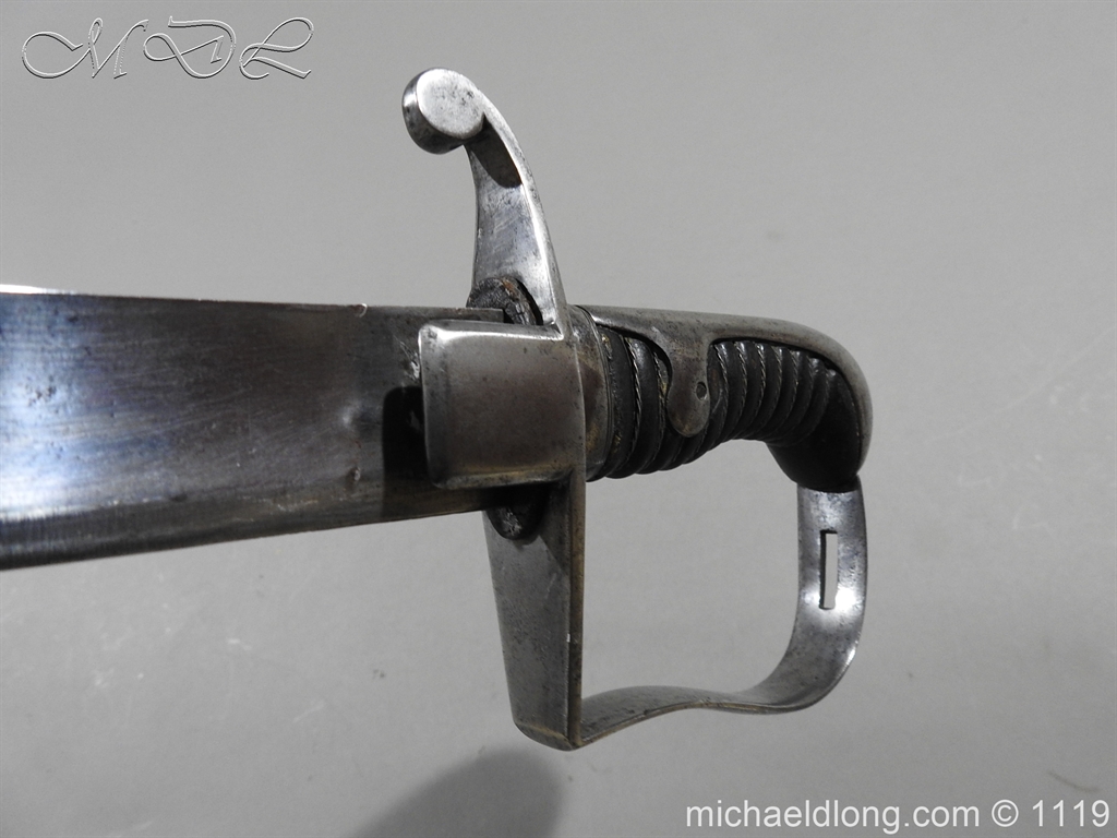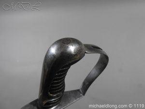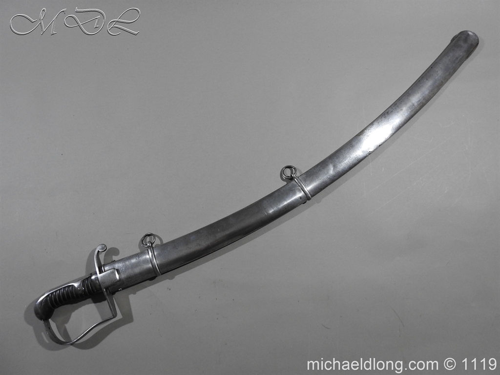1796 Light Cavalry officer’s fighting sword, steel regulation hilt but with square langets with leather bound with twisted silver wire. The curved blade in very good condition with inspection mark crown over 1 it is complete with original scabbard with 2 loose rings overall length 95cm blade 82cm