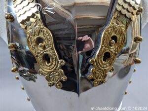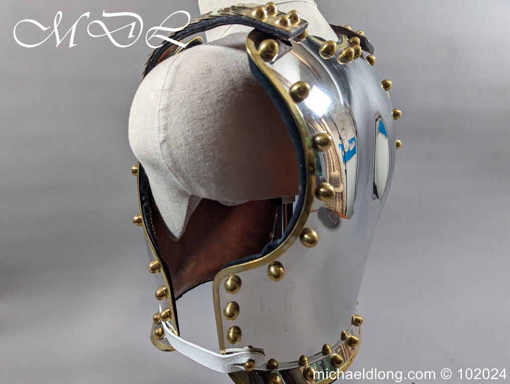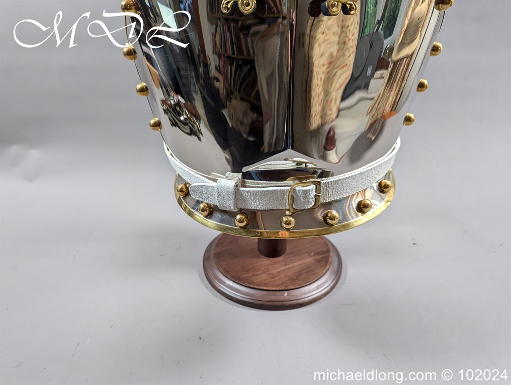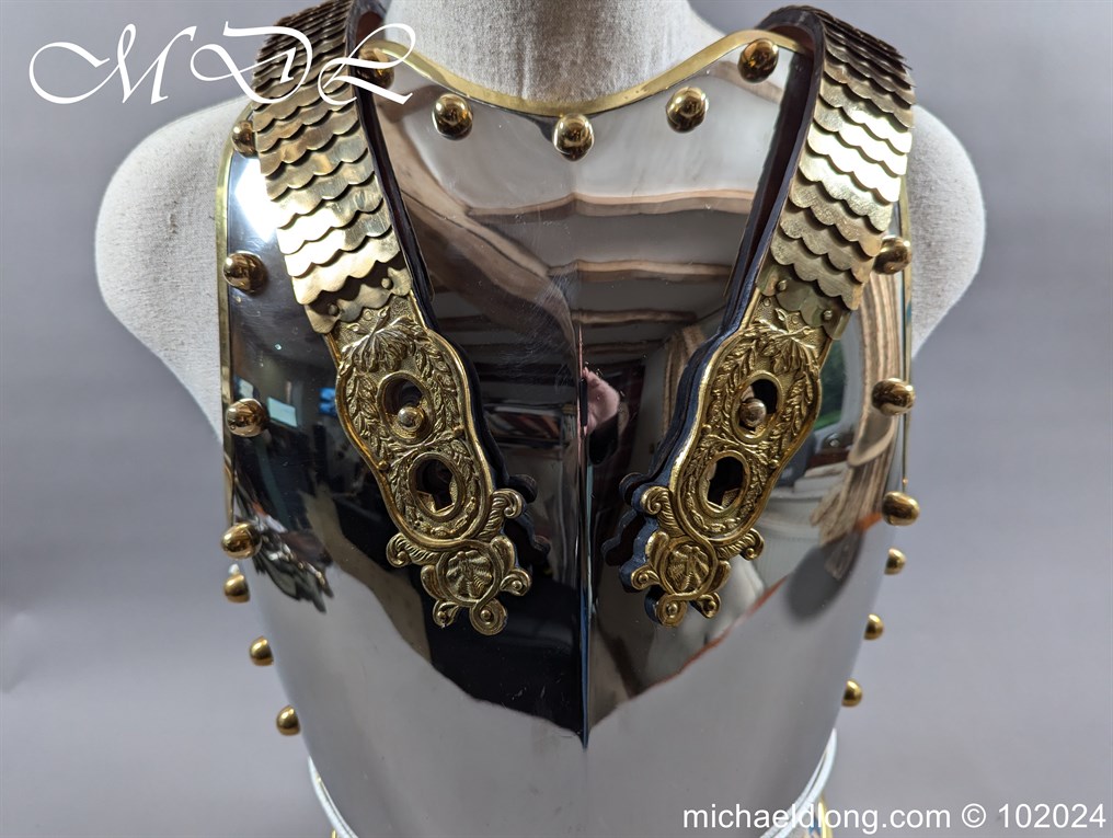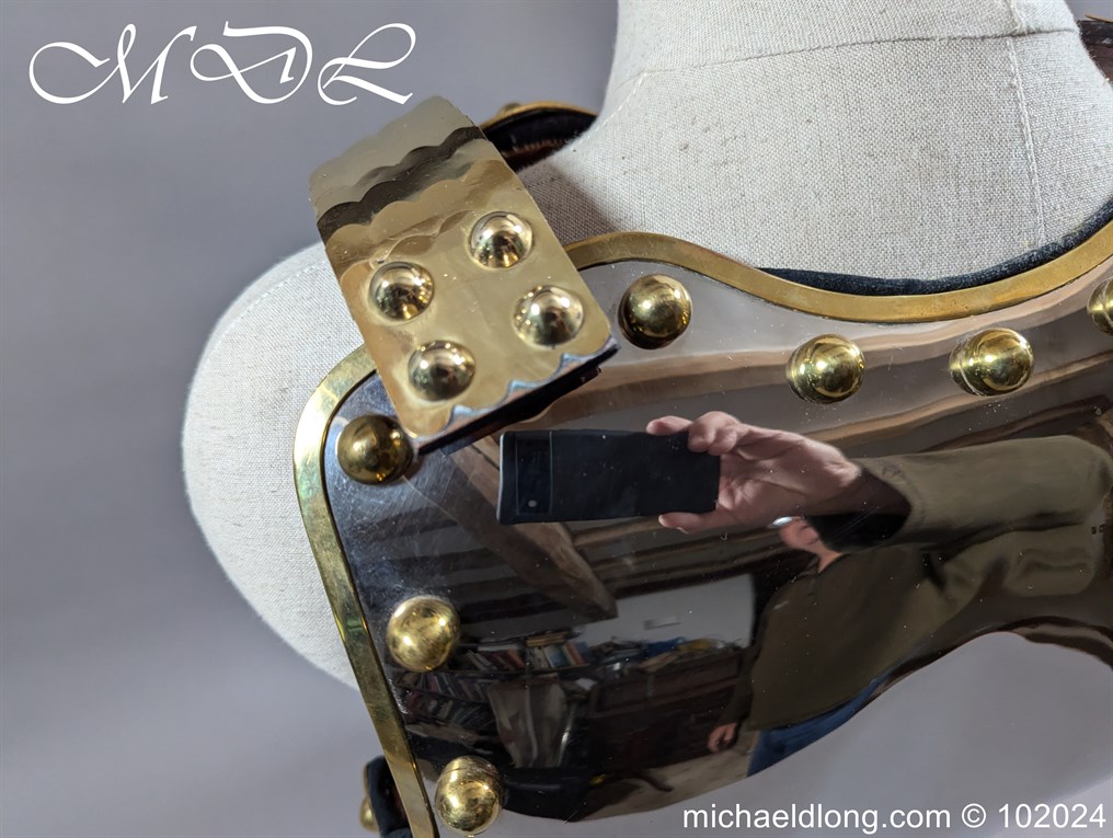 Household Cavalry Cuirass comprising plated steel breast and back plates with brass trim and studs both with original leather lining and complete with shoulder straps and buff white waist strap all in excellent condition