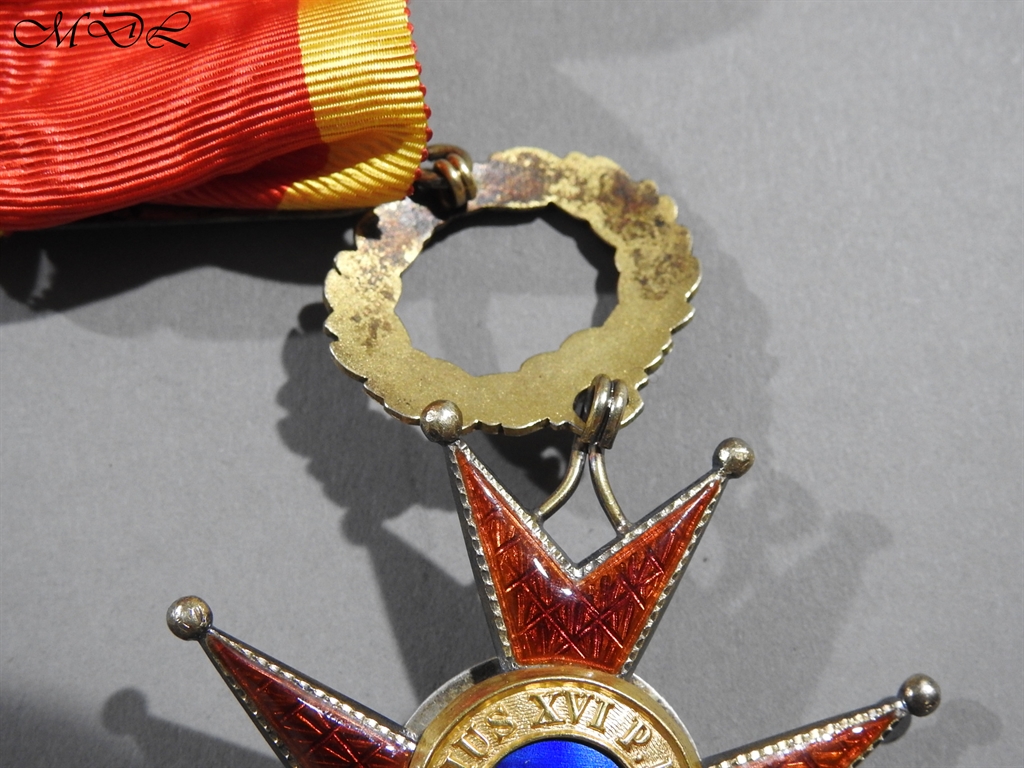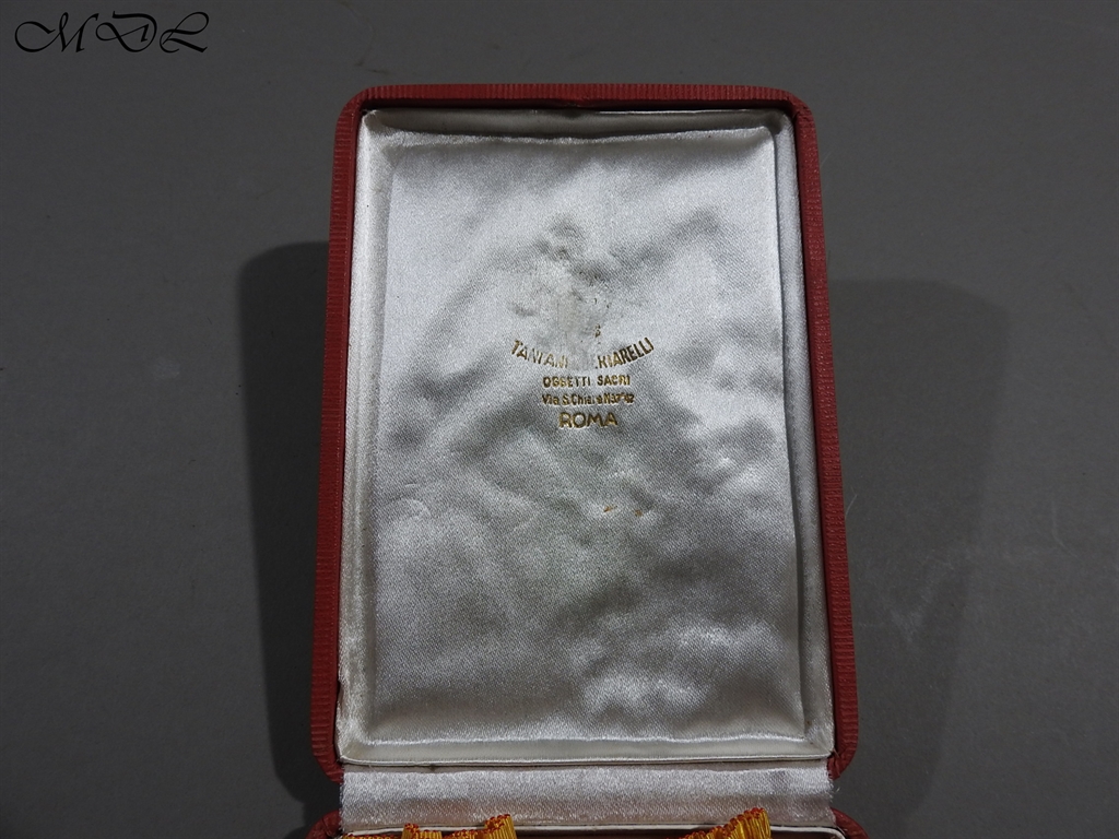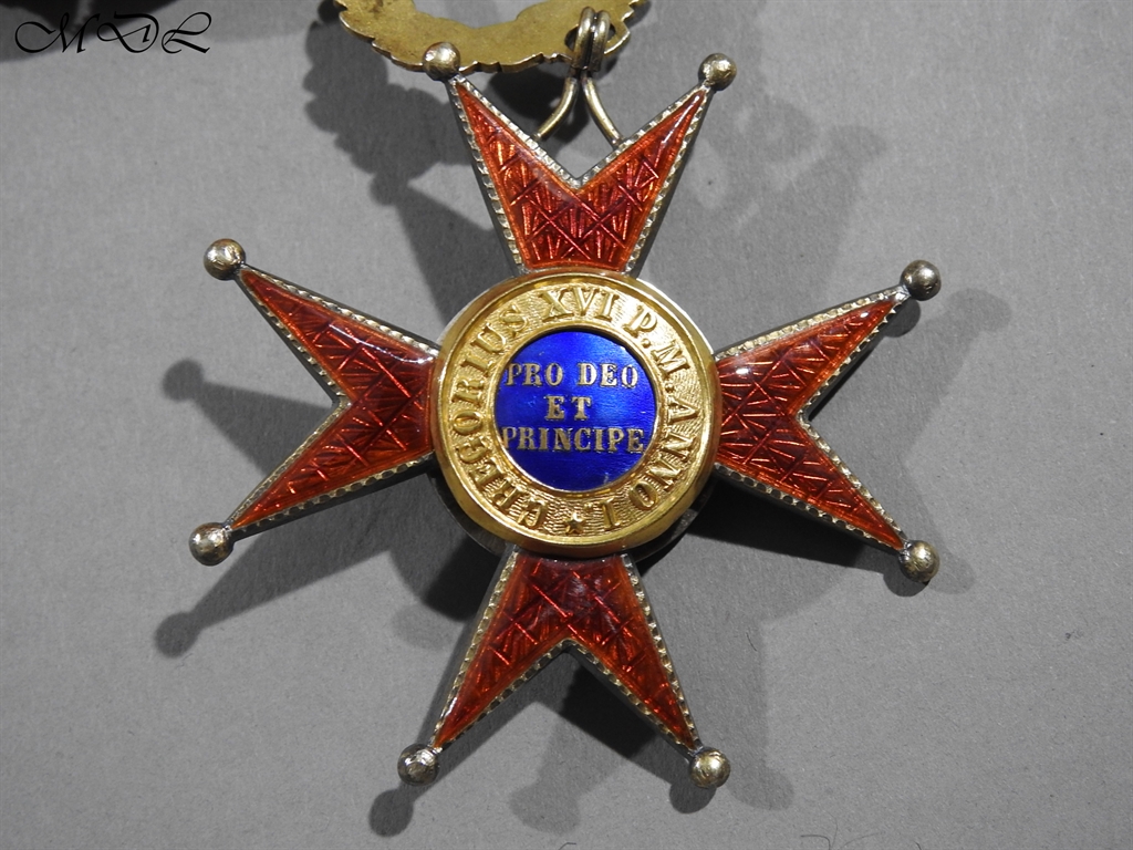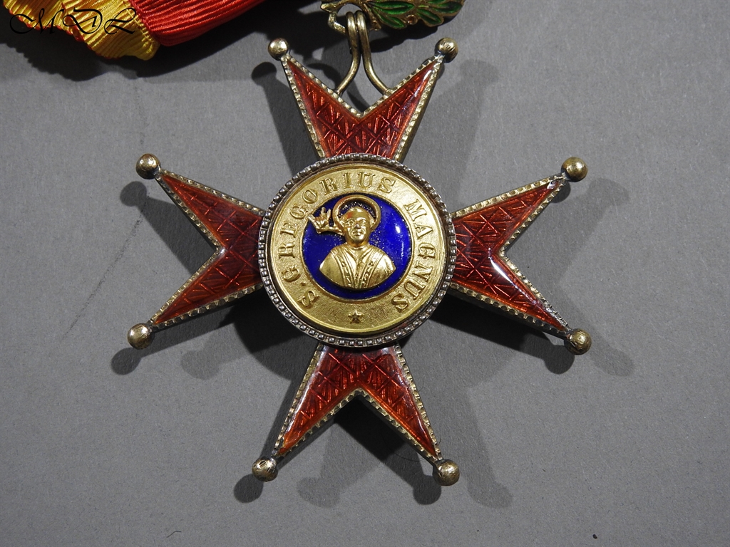 An Order of St. Gregory the Great; Commander’s Cross – Silver gilt and enamels, ball finials on all eight cross points, 58 mm x 84 mm inclusive of its wreath suspension, on full-length neck ribbon with elasticized bands and clip closure in original case no damage age wear to box.