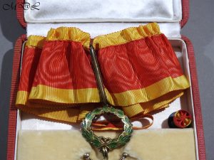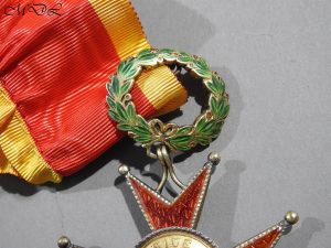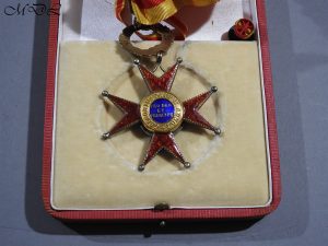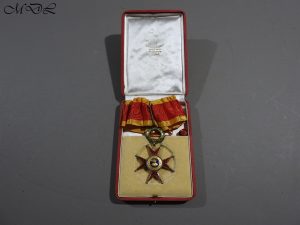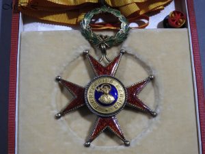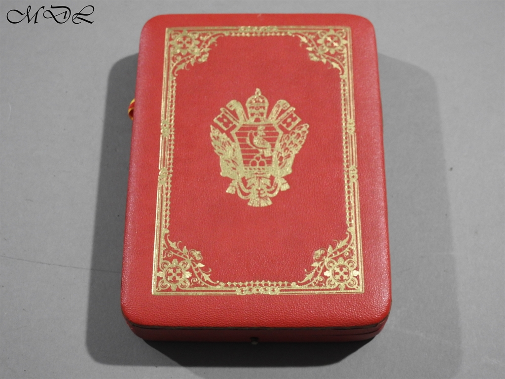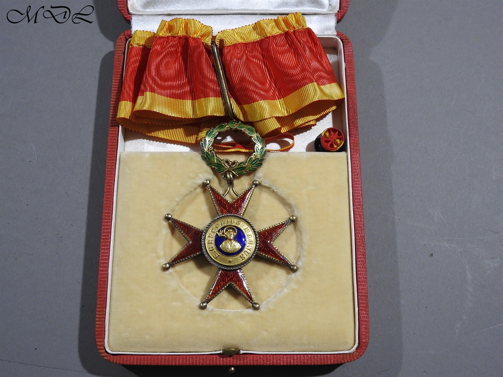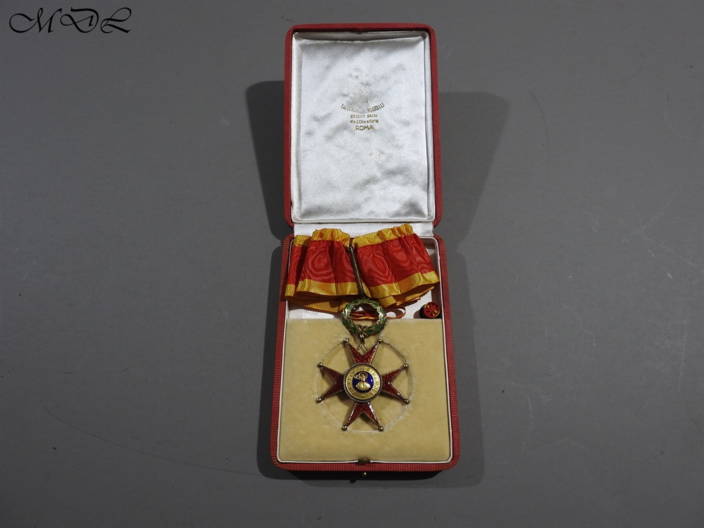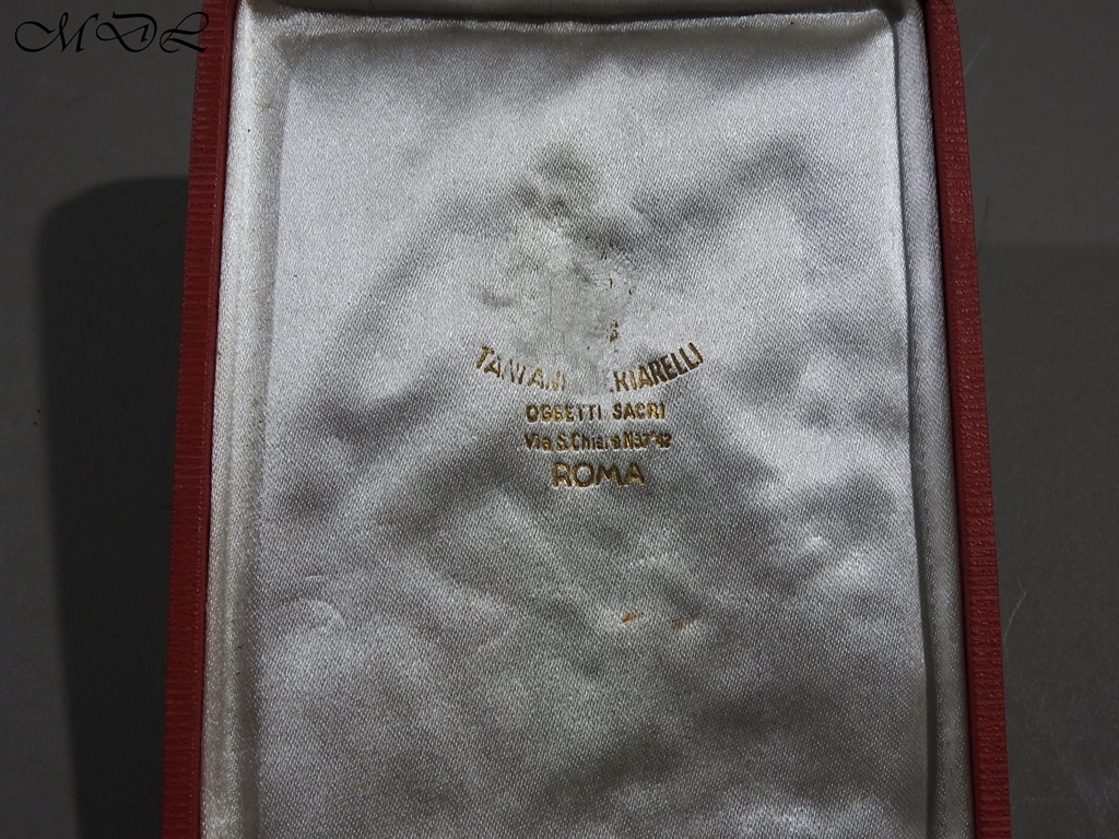 An Order of St. Gregory the Great; Commander’s Cross – Silver gilt and enamels, ball finials on all eight cross points, 58 mm x 84 mm inclusive of its wreath suspension, on full-length neck ribbon with elasticized bands and clip closure in original case no damage age wear to box.