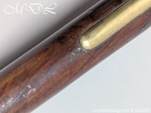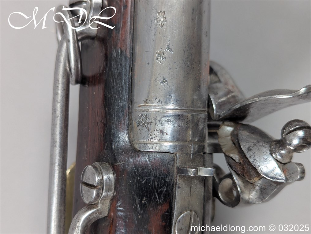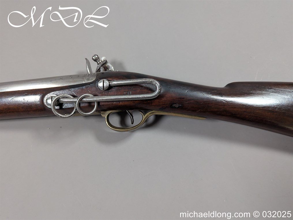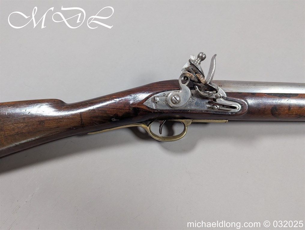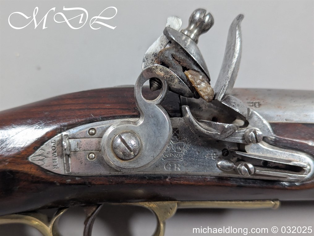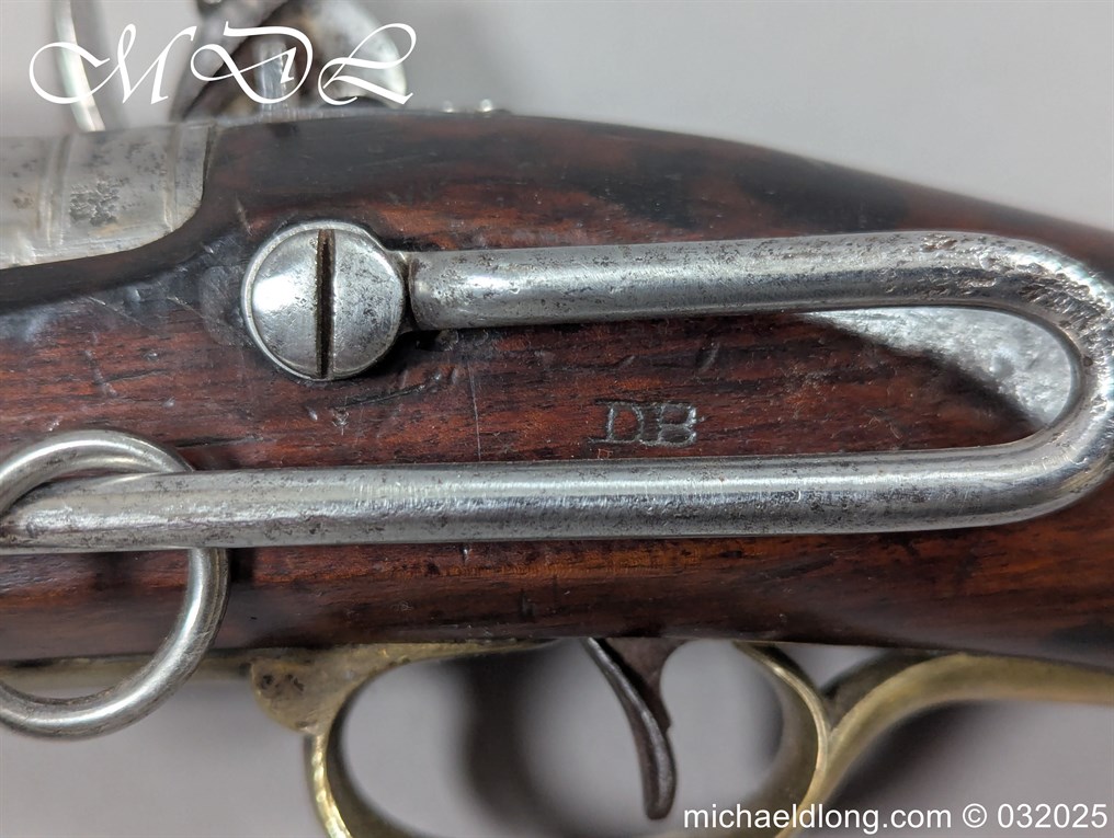 Paget 16-Bore Flintlock Cavalry Carbine, the barrel with brass fore-sight, stamped with Tower proofs and crowned N inspection mark, plain tang with inspection mark, flat engraved lock with GR crowned and TOWER across the tail, figured full stock stamped with Board of Ordnance ownership mark on one side of the butt, initials DB under the saddle ring, two inspection marks behind the tang of the trigger guard, and with regulation brass mounts, saddle-bar and ring, and stirrup ramrod. UK shipping Free – Rest of the World at cost