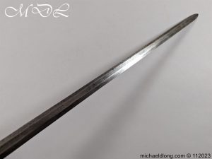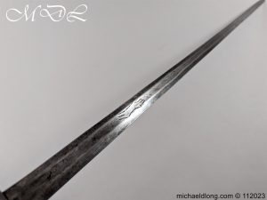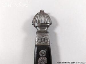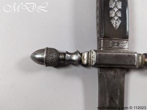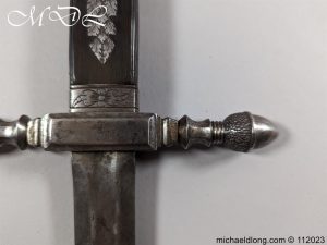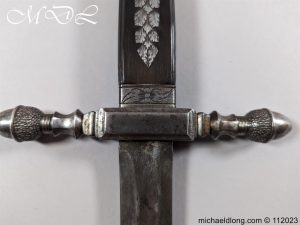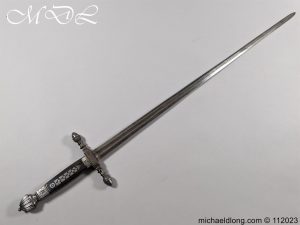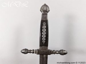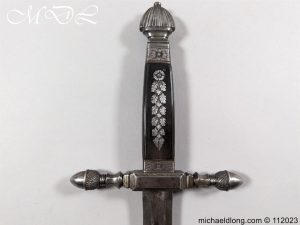 Papal Chamberlains 18th Century Sword steel hilt of excellent quality with ebony grip inlaid with chiseled iron plates to both sides, complete with shell pommel and cross guard with acorn quillons. The blade much earlier 17th century marked with running wolf of Solingen and Passau, couple edged with central fuller, overall length 97 cm the blade 80cm: Papal Chamberlains, basically Chamberlain of the Sword and Cape were appointed from the nobility and high ranking clergy.