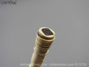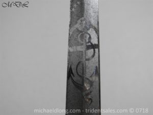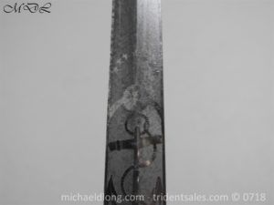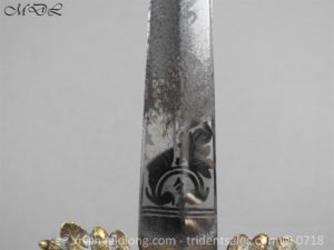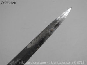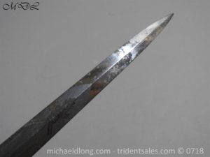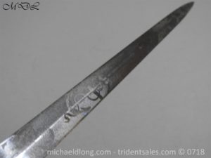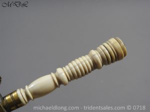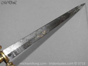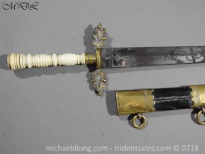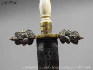 Early Victorian period Peninsular and Oriental Steam Navigation Company Officer’s Dirk, Supplies by Curney and Co London. Turned bone grip with gilt oak leak crossguard and fittings, please not the pommel cap is missing. The blade double edged with frosted engraving with fouled anchor below company crest – logo with floral decoration, complete with leather scabbard with gilt mounts, bottom mount missing. Overall length 43.5cm blade 33cm Notes: P&O (formerly the Peninsular and Oriental Steam Navigation Company) was a British shipping and logistics company dating from the early 19th century