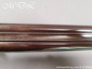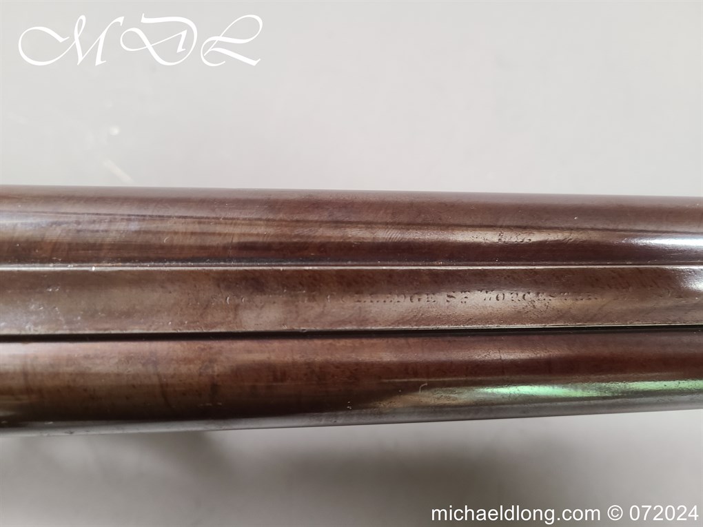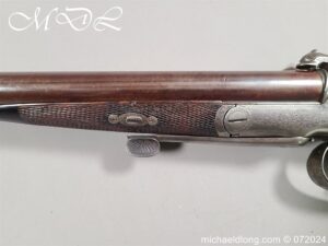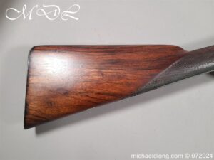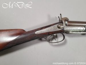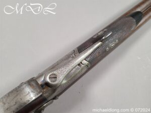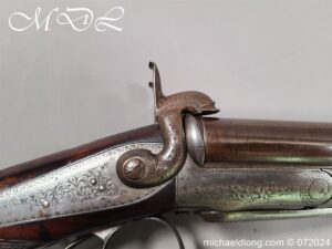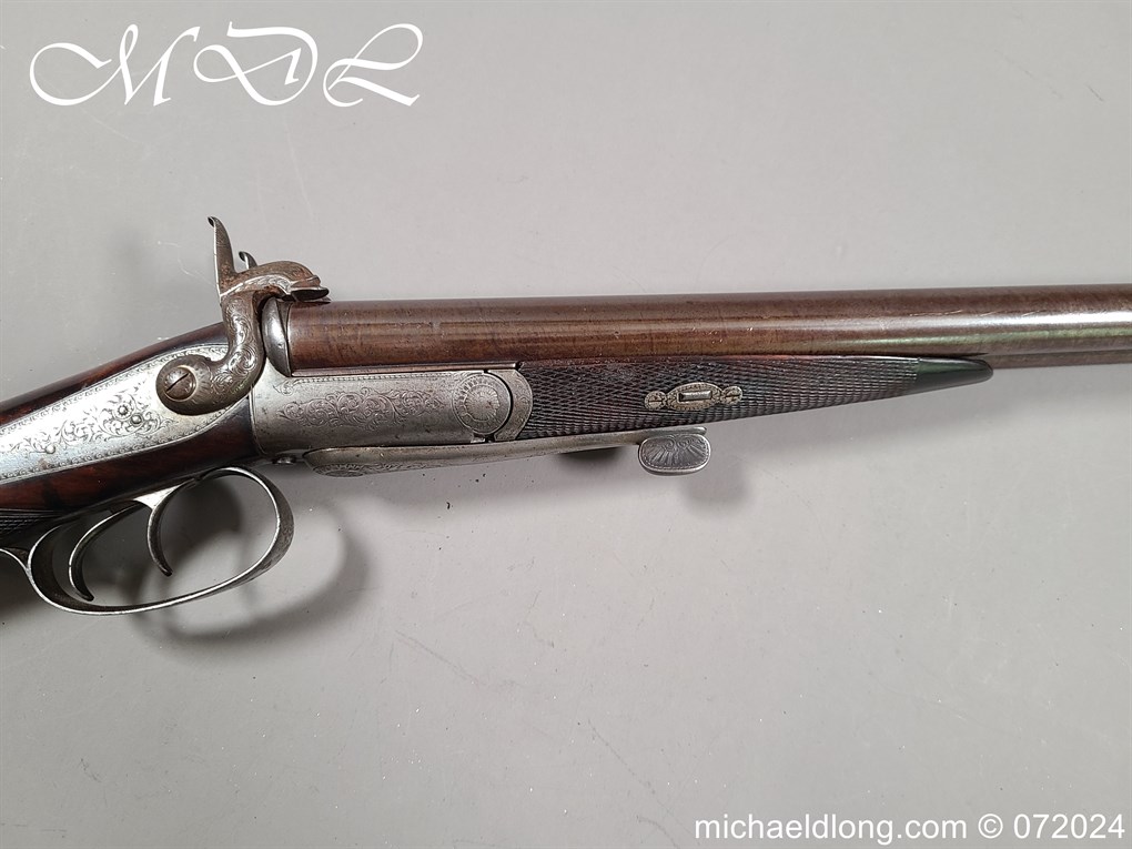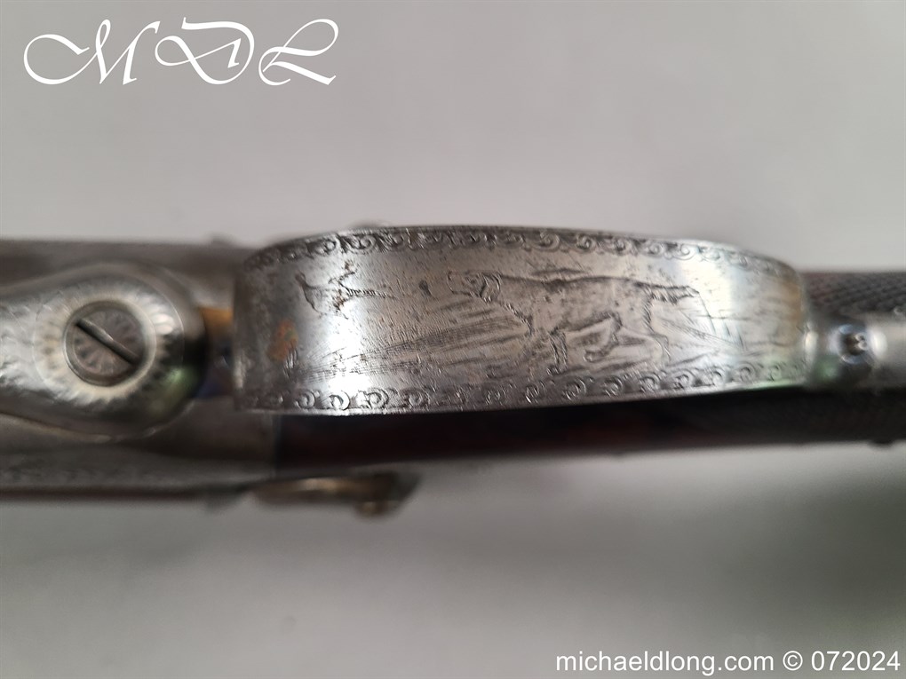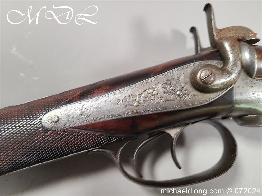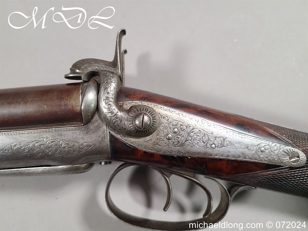 Pinfire 19th Century Sporting Gun by R Scott College Street Worcester No 594. Nice quality with browned barrels chequered for end with underlever action. The lock plates, hammers and side plates all well engraved with floral decoration, the trigger guard with hunting scene all done to a very high standard. The walnut butt with matching fittings and both mechanisms in good working order, no license require, delivery to UK address only