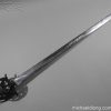 Polish or Hungarian horsemans sword, traditional formed hilt leather bound ribbed hilt with brass decorative back strap and pommel, straight cross guard with large matching langets running both ways. The curved blade is multi fullered which is correct for the blade and style of sword becoming double edged towards tip. The black leather scabbard with brass and what seems to be bronze fittings forming the 2 upper loose rings and securing the lower witting which has an additional ring for use when on horse back The top mount being dated 1651 Overall length 99cm blade 83cm