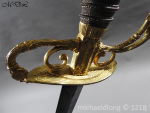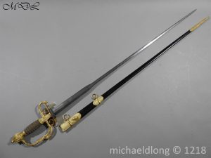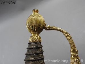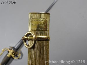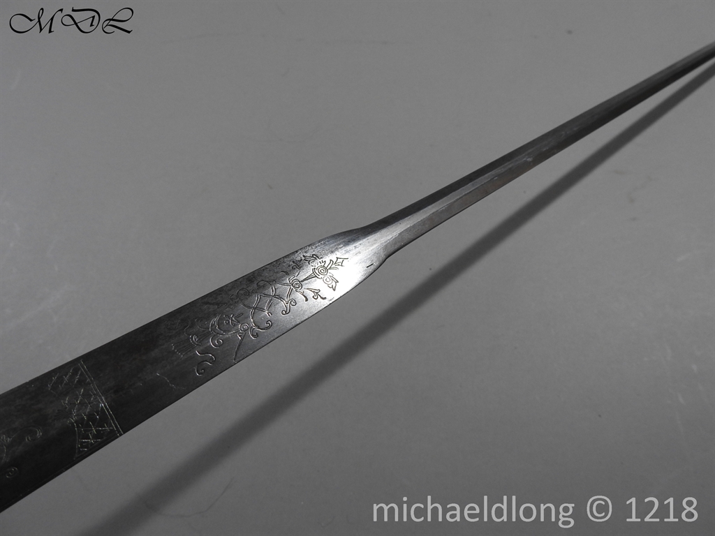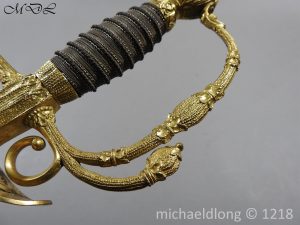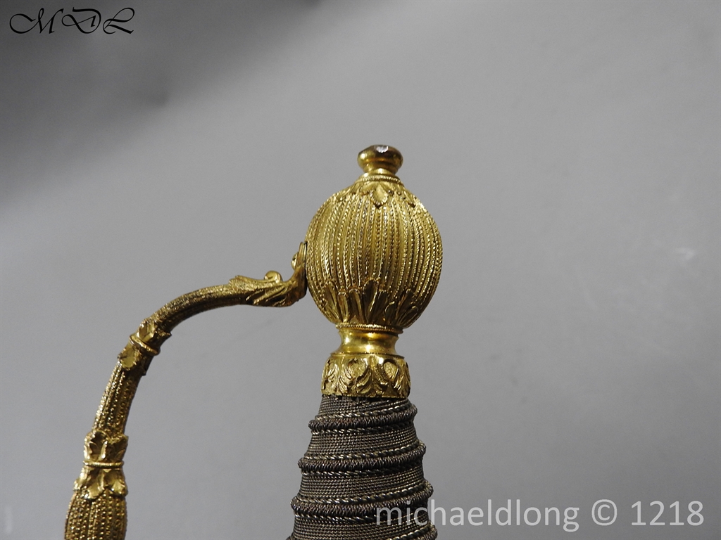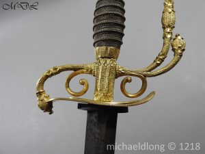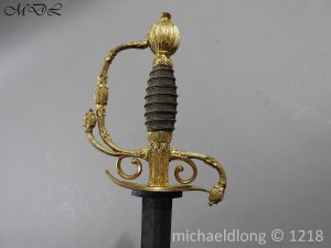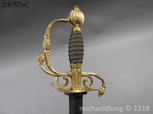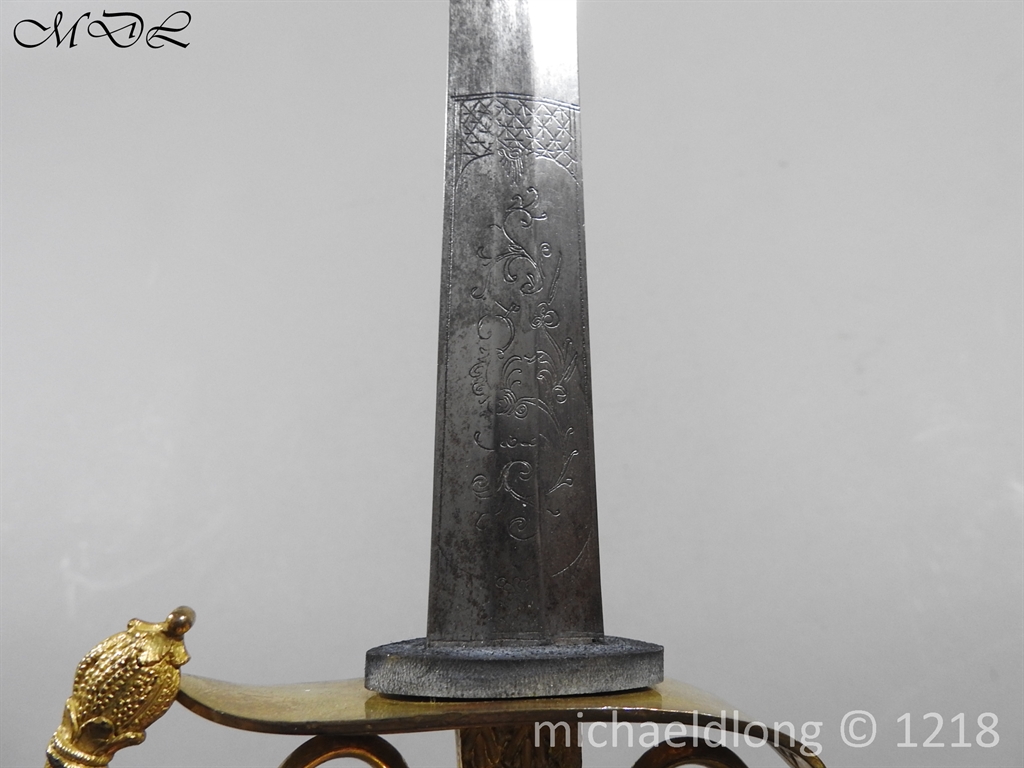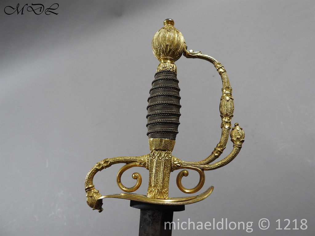 A stunning Georgian sword by Prosser Charring Cross London c1800 ornate gilt hilt with raised wire bound grip and small decorative guard. The blade is of a colichemarde style with engraved decoration and is 32.5 inches in length and is complete with matching black leather scabbard with gilt mounts the top one being maker marked. Please note we are informed but have no reference in writing that a small number of this style of sword were commisioned by the King as presentation swords to be given as gifts