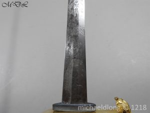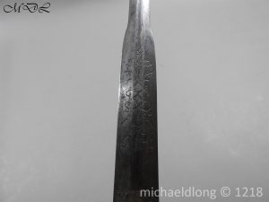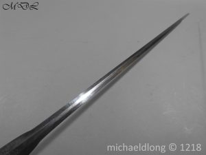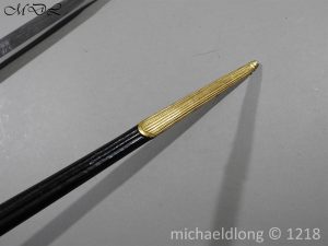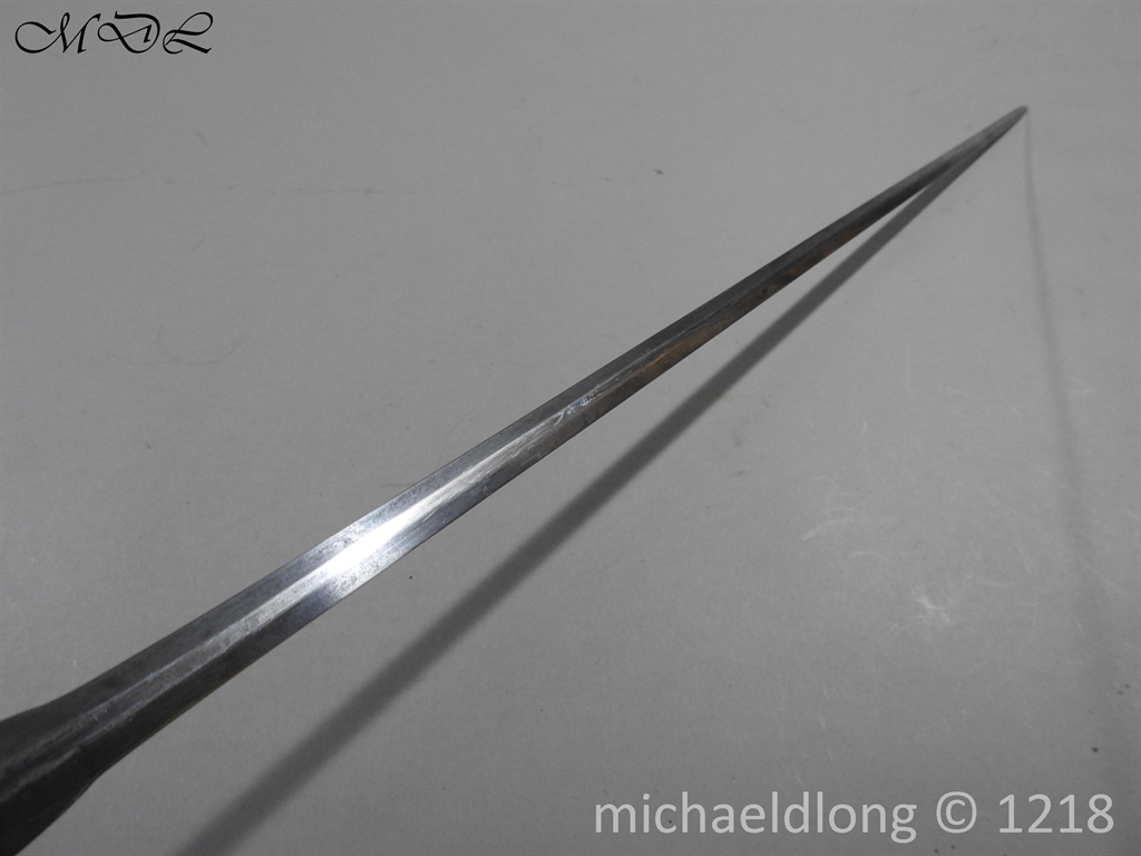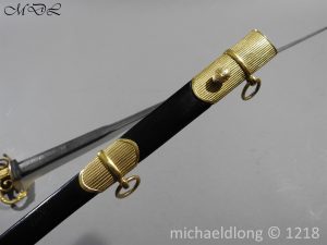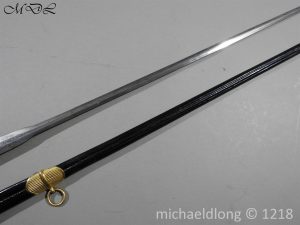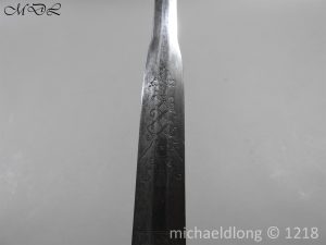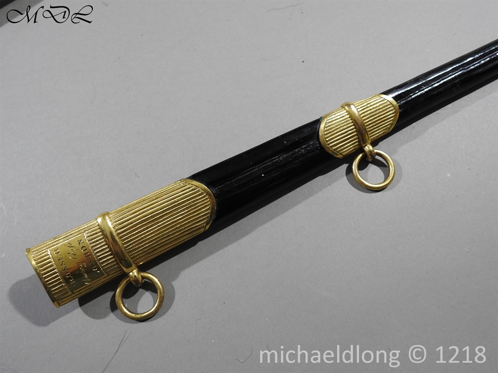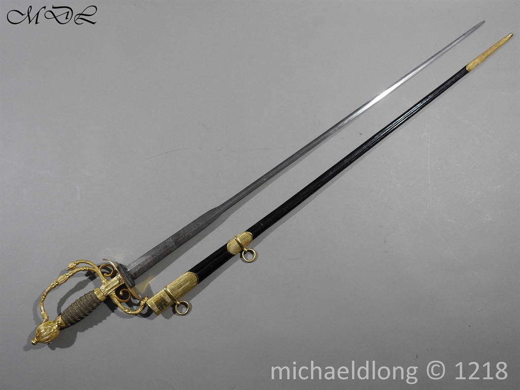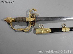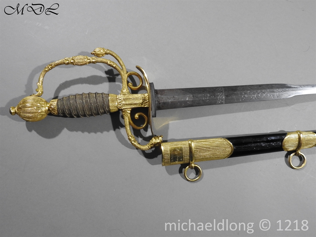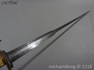 A stunning Georgian sword by Prosser Charring Cross London c1800 ornate gilt hilt with raised wire bound grip and small decorative guard. The blade is of a colichemarde style with engraved decoration and is 32.5 inches in length and is complete with matching black leather scabbard with gilt mounts the top one being maker marked. Please note we are informed but have no reference in writing that a small number of this style of sword were commisioned by the King as presentation swords to be given as gifts