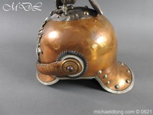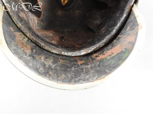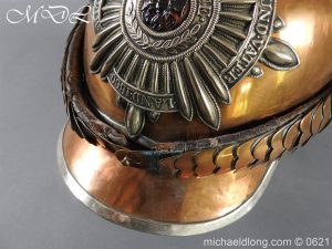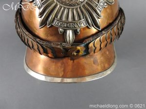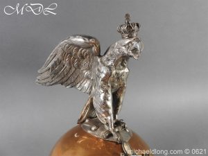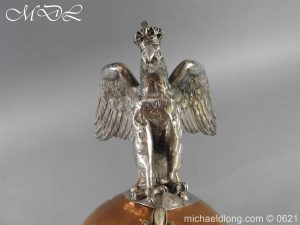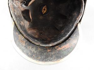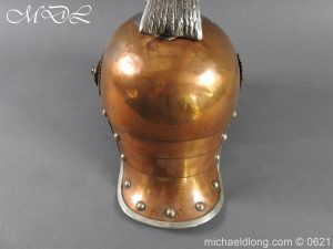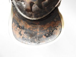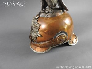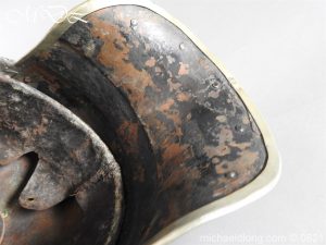 Prussian Garde Du Corps Other Ranks Parade Helmet with mounted eagle. The large front silver plate with black eagle to centre with SUUM CUIQUE above and laurel leaves below. The skull peak and lobster tail are of tomback which is edged with white metal. Black leather liner complete with chin scales and cockades. The base of the lobster tail is stamped G.K.R. 3.E and the inner silver edge with 54 B The helmet stands 33.5cm in height and weighs 1.3 KG
