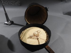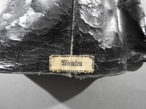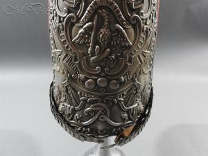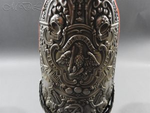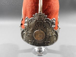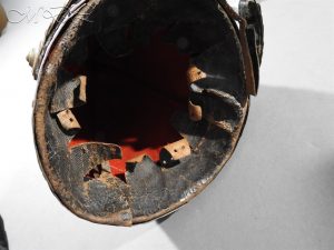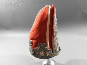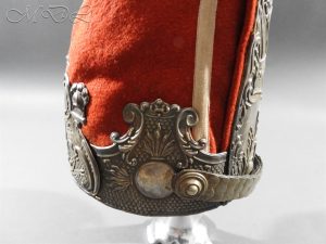 Other ranks 1st foot guards mitre cap with white metal front plate elaborately decorated with grenades and trophies of arms. At the top of the plate is a large crown and in the center the eagle of Frederick The Great with a ribbon above the eagle bearing the motto Semper talis. Around the base of the cloth portion od the cap is a wide metal band with matching decoration to the mitre plate. The cloth is red with 3 white lines and is in very good condition. It is complete with chin strap and leather liner plus storage case with cover with name badge to the rear. The 1st guard regiment of foot was the most elite regiment in the Imperial German Army sometimes known as The First Regiment.