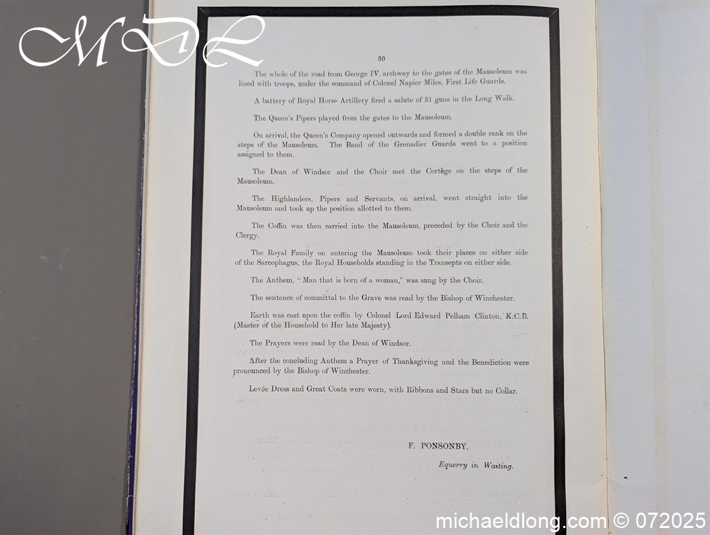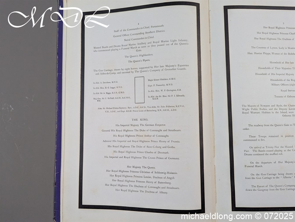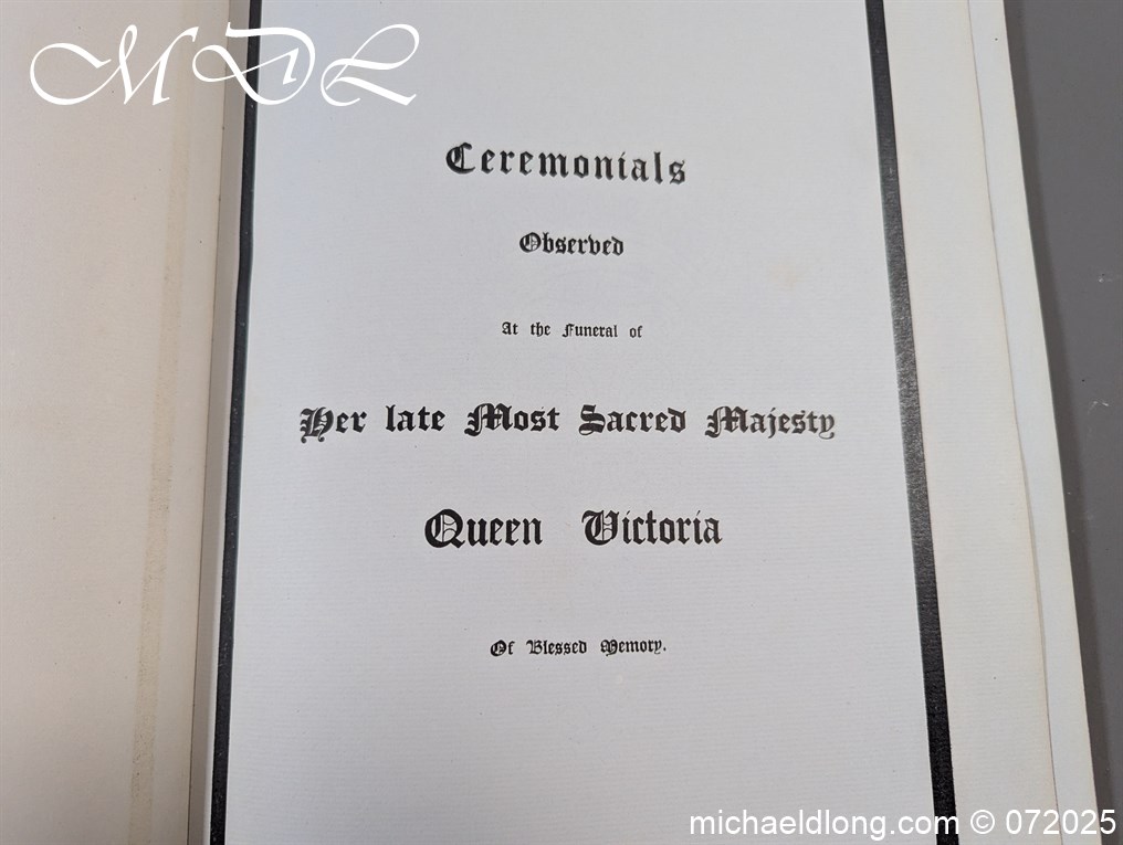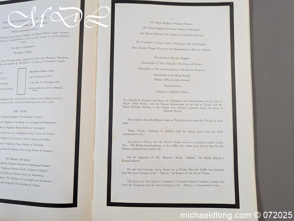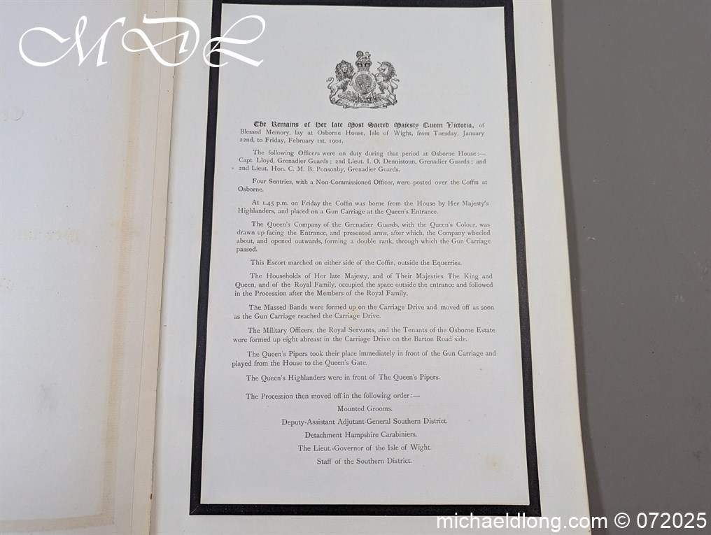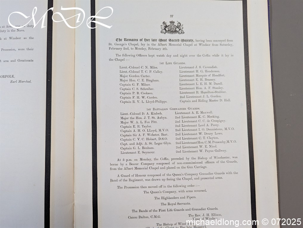 Queen Victoria Funeral Historic Document bound is a leather covers with Royal Coat of arms to centre please note spine is damaged, a note on the inside cover stating With the Earl Marshals Compliments to Major C Hume R.A The document details all the arrangements of the Funeral including seating plans, order of the day every single detail please see images