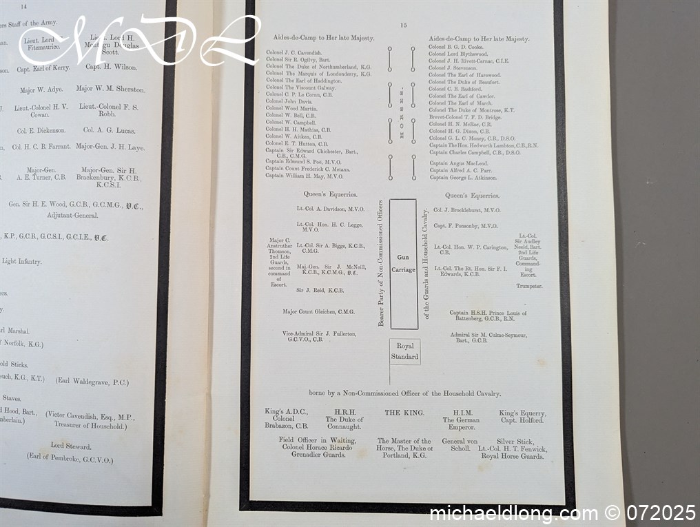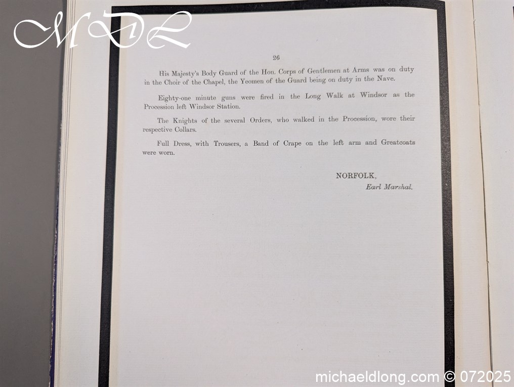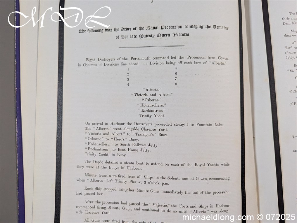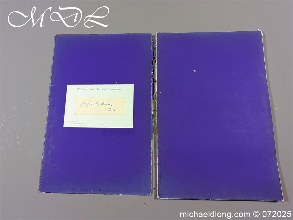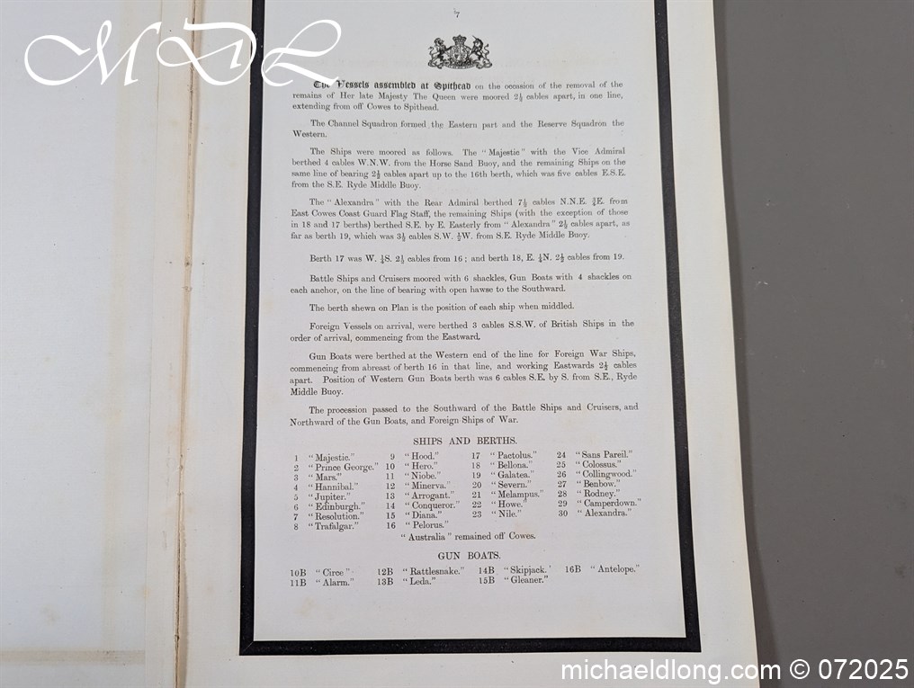 Queen Victoria Funeral Historic Document bound is a leather covers with Royal Coat of arms to centre please note spine is damaged, a note on the inside cover stating With the Earl Marshals Compliments to Major C Hume R.A The document details all the arrangements of the Funeral including seating plans, order of the day every single detail please see images