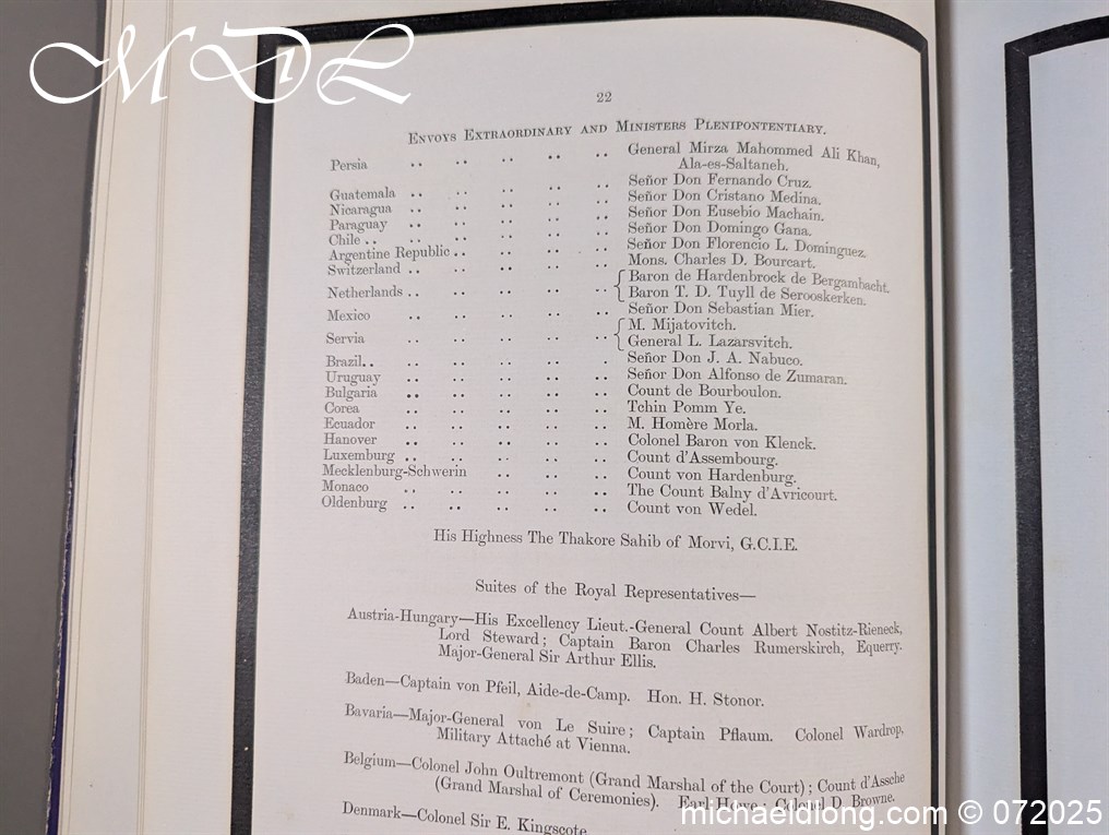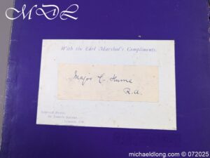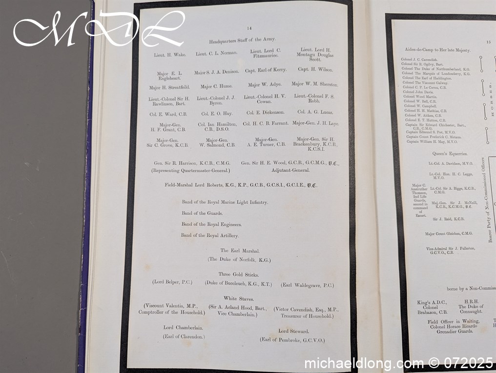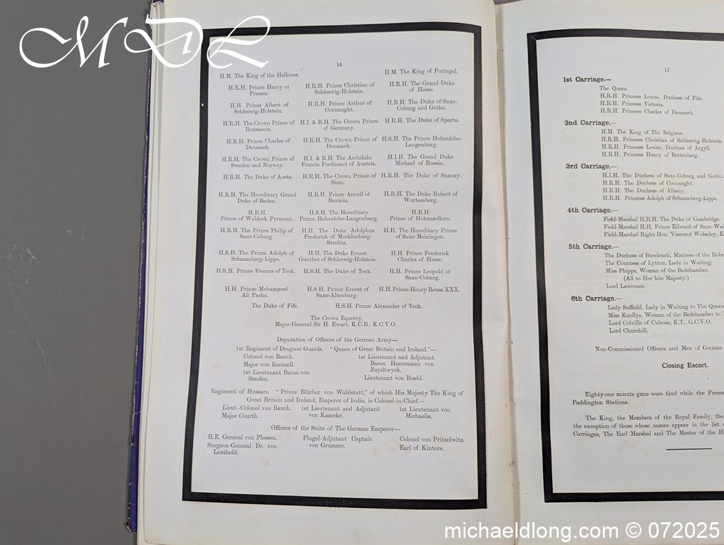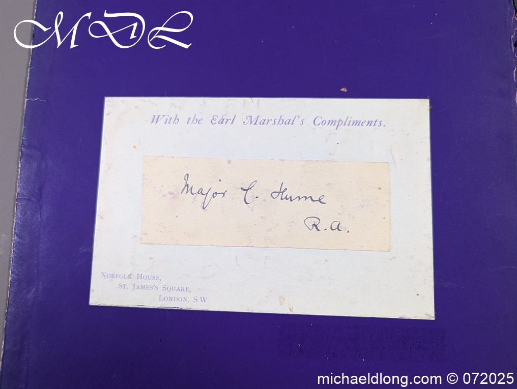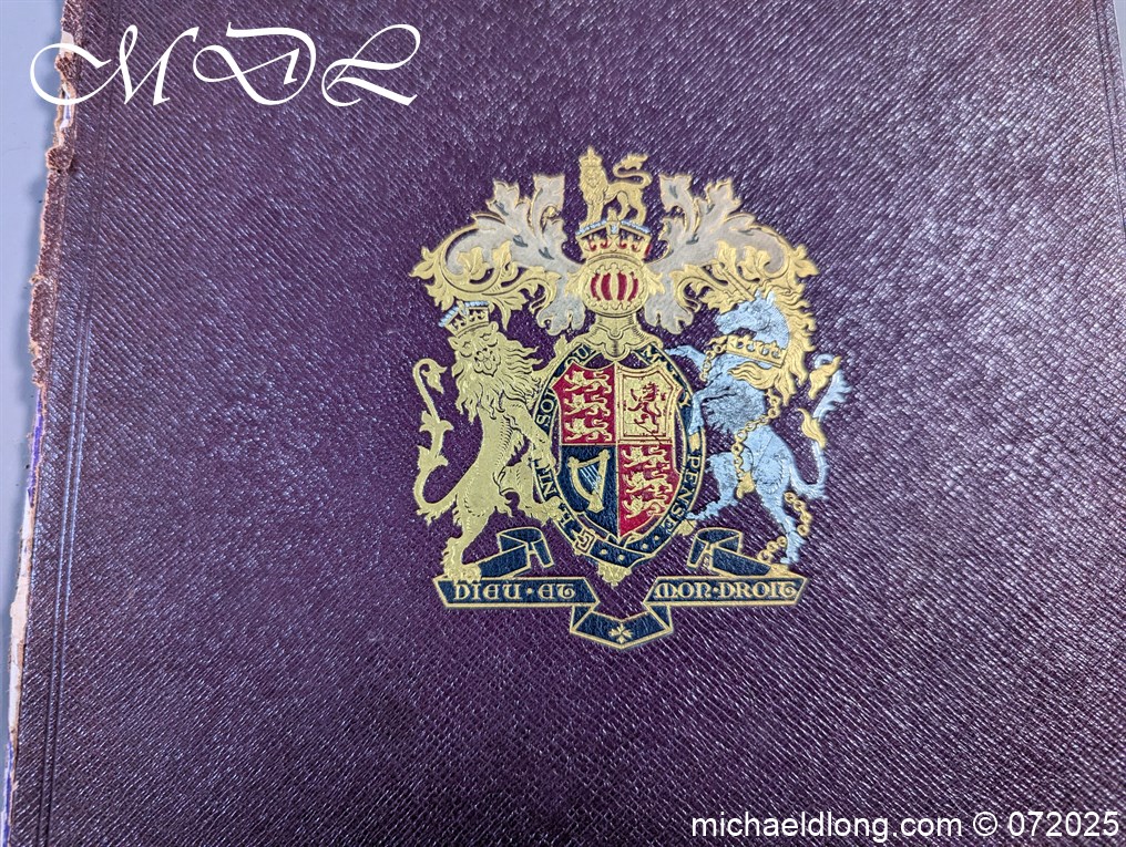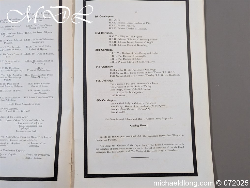 Queen Victoria Funeral Historic Document bound is a leather covers with Royal Coat of arms to centre please note spine is damaged, a note on the inside cover stating With the Earl Marshals Compliments to Major C Hume R.A The document details all the arrangements of the Funeral including seating plans, order of the day every single detail please see images