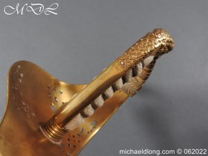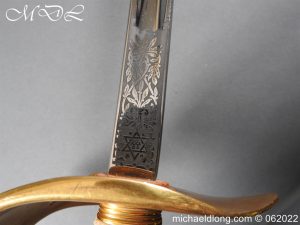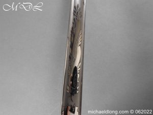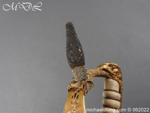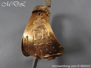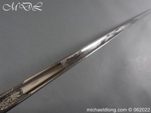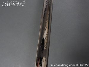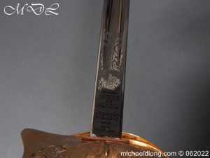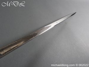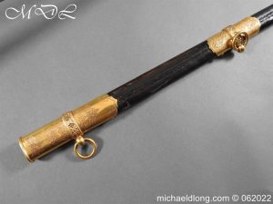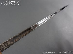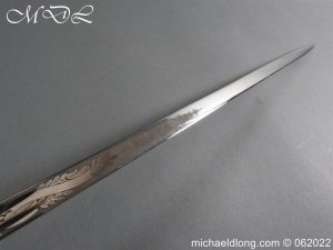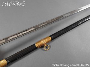 RAF air rank officer’s dress sword ER 2 current issue by Wilkinson Sword London in parade condition. Excellent straight blade etched with royal coat of arms, crowned eagle, blank scrolls and foliage plus makers details, brass gilt hilt incorporating ER II cipher and crowned eagle and eagle head pommel. Complete with black leather scabbard with matching highly decorated gilt mounts which denotes senior rank and full-dress knot overall length 38 inches the blade 32.25 inches