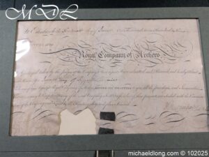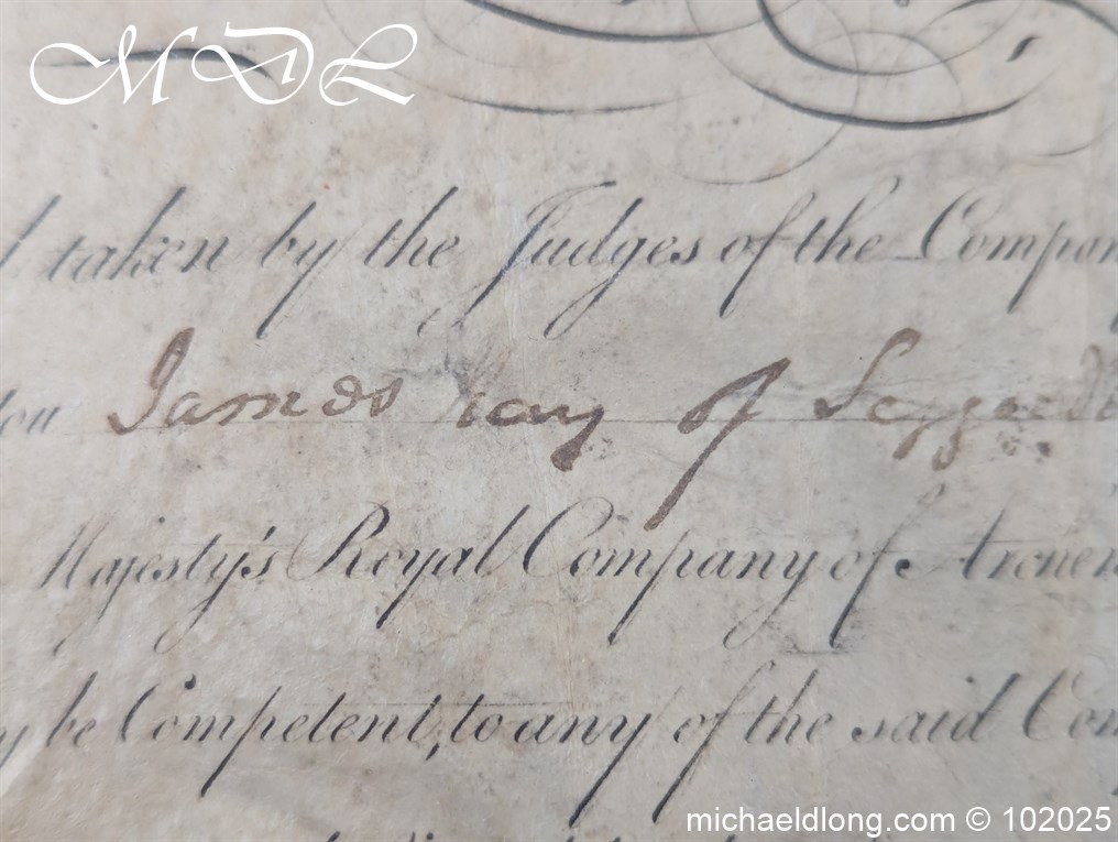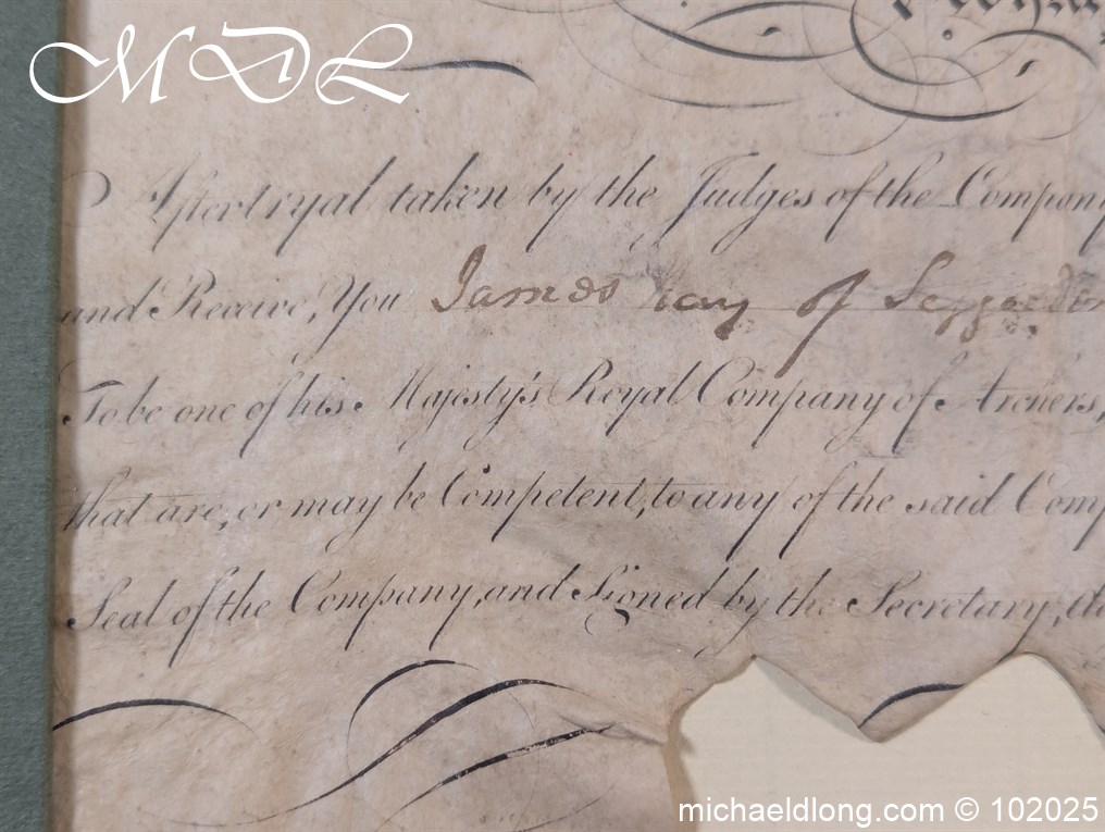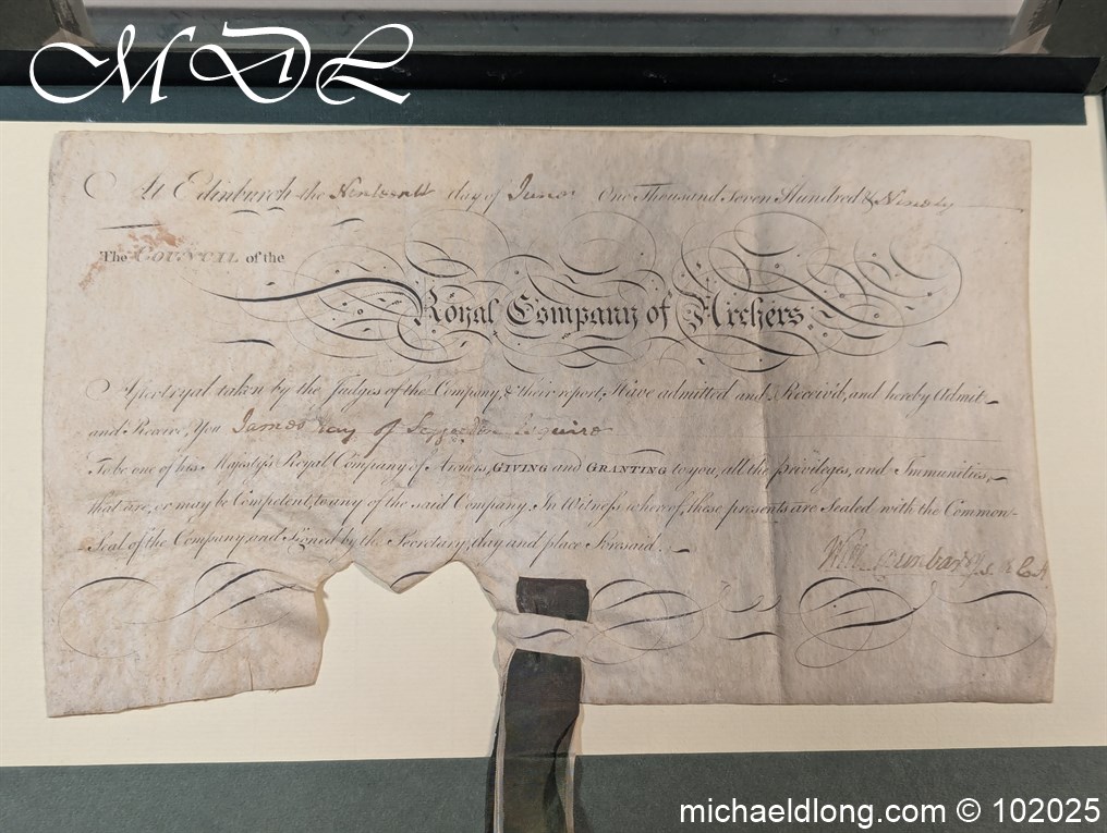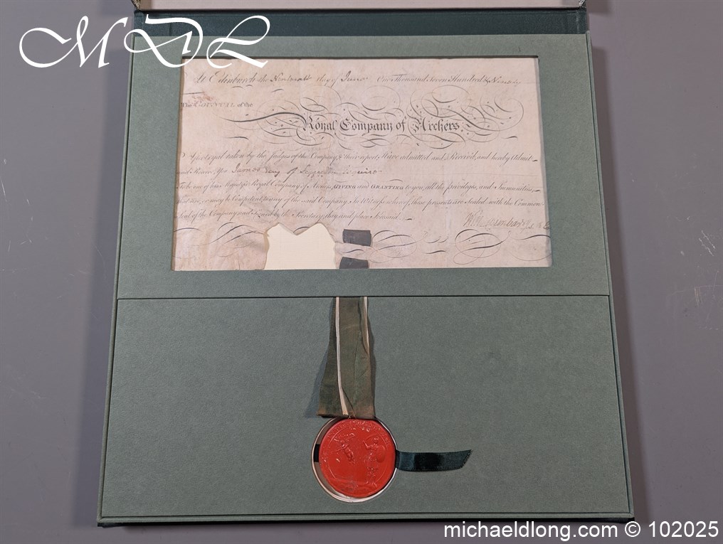 Royal Company of Archers Admittance Indenture for James Hay 19th June 1790 This document and seal have been mounted in a display case which does have a mistake it details the name James May rather than James Hay which is detailed on the document.