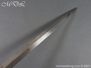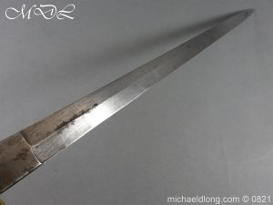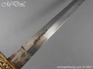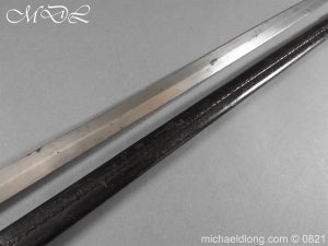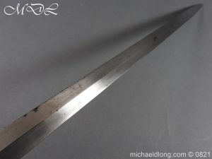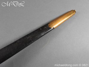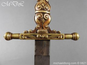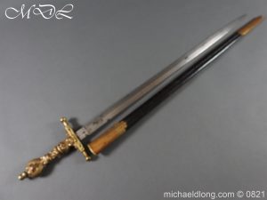 Royal Company of Archers Long Sword rare 19th century example carried by the Queen’s Body Guard for Scotland. Straight double edged 30 inch blade, etched with stand of arms and floral decoration. Ornate gilt cross guard, the grip of turned wood, with gilt floral mounts. Housed in it’s original black leather and gilt mounted scabbard.