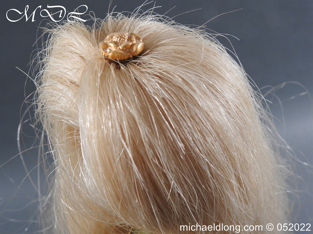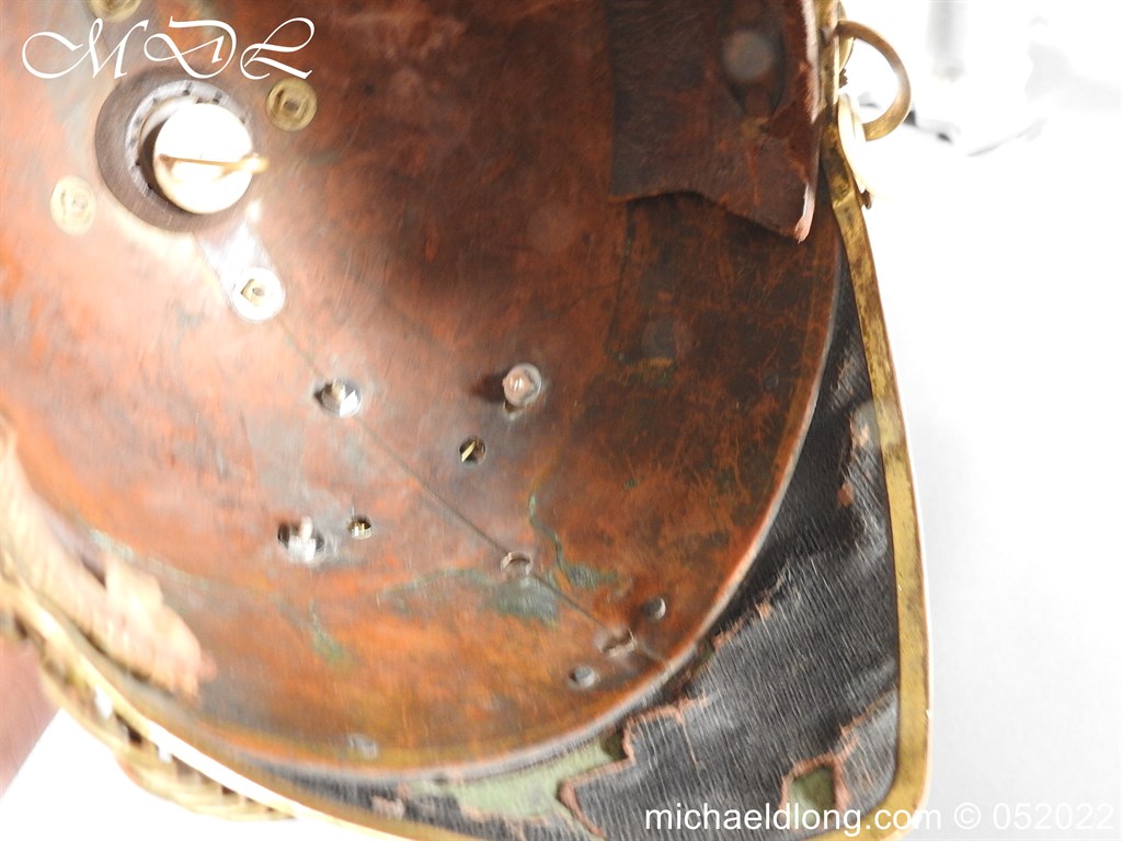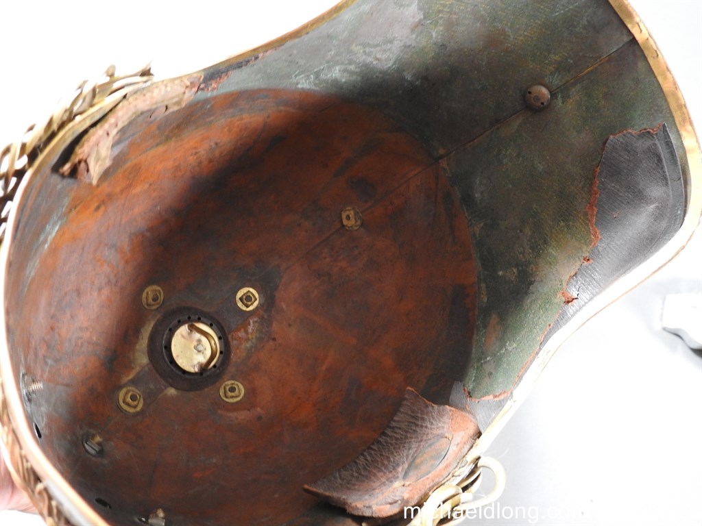 Royal Irish 4th Dragoon Guards Parade Helmet in found condition brass skull showing age contact marks but solid and no major dents. Super regimental enamelled blue, red and green badge to centre mounted on silver star which has darken with age. Although this is a correct and an original badge it has been replaced during it’s life time. Complete with excellent white horse hair plume and chin strap please note no liner.