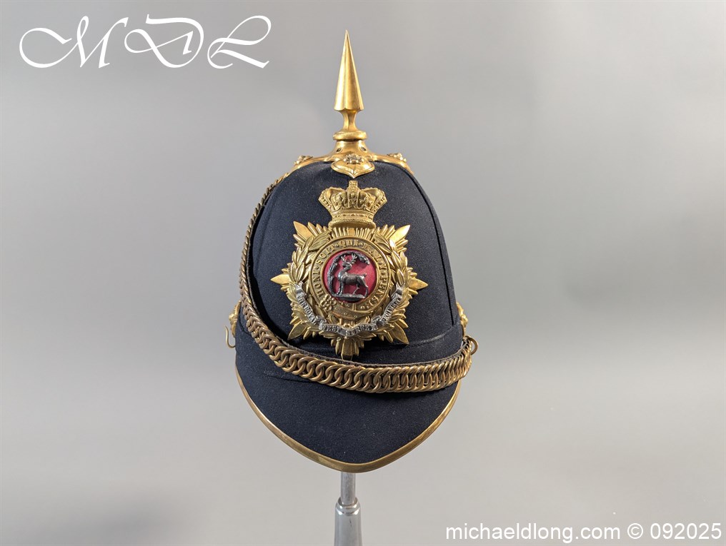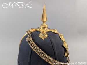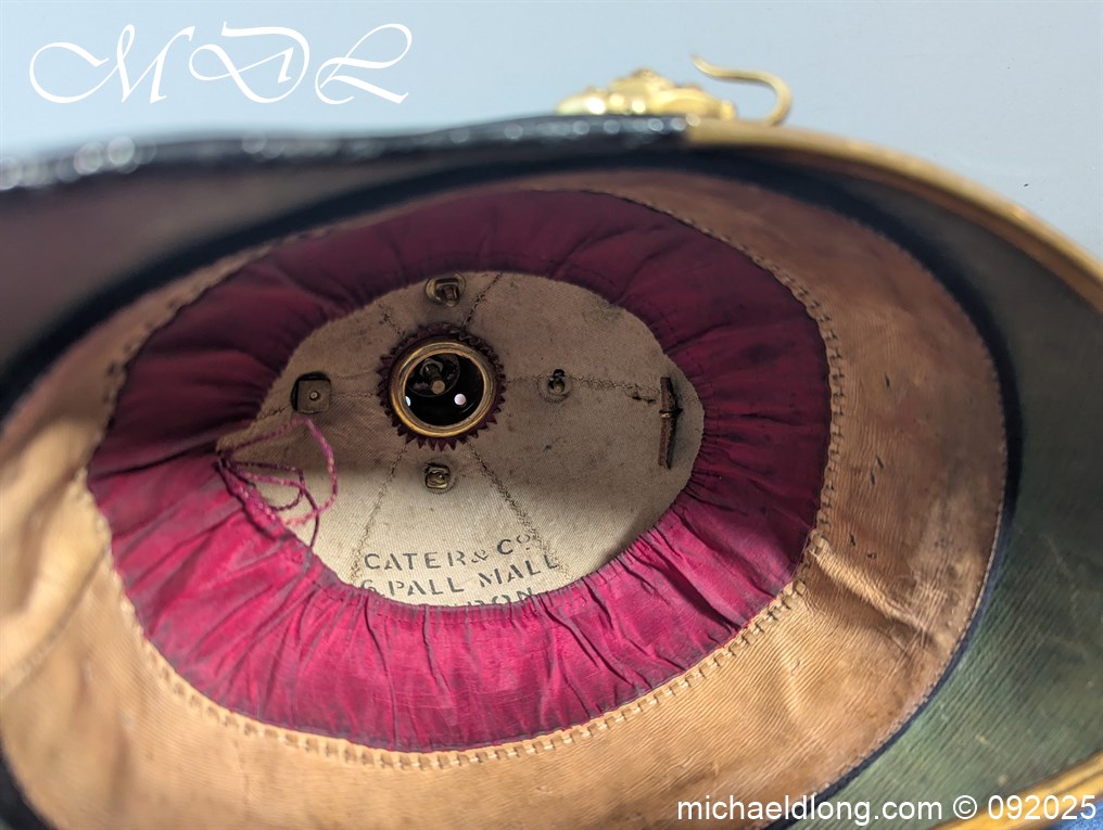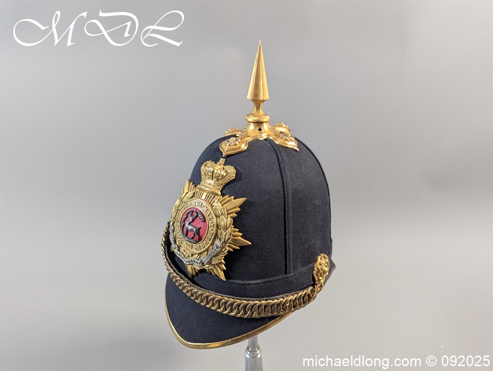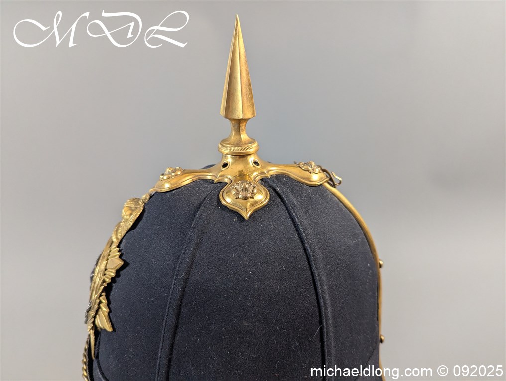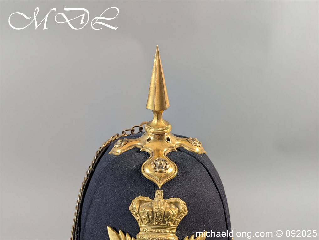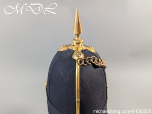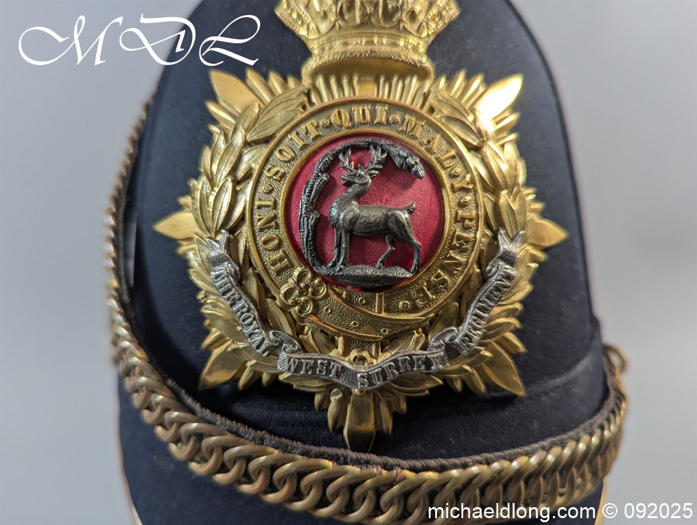 Victorian officer’s blue cloth spiked helmet of The Queens Royal West Surrey Regiment, brass peak binding, top mount and spike, velvet backed chin chain and ear rosettes, gilt and silver plated helmet plate with regimental Paschal Lamb to centre on red velvet and title scroll below, leather headband and silk liner maker marked Cater and Co London inside.