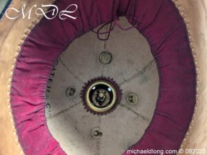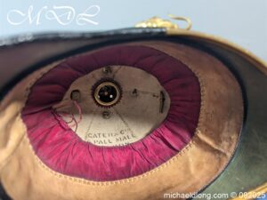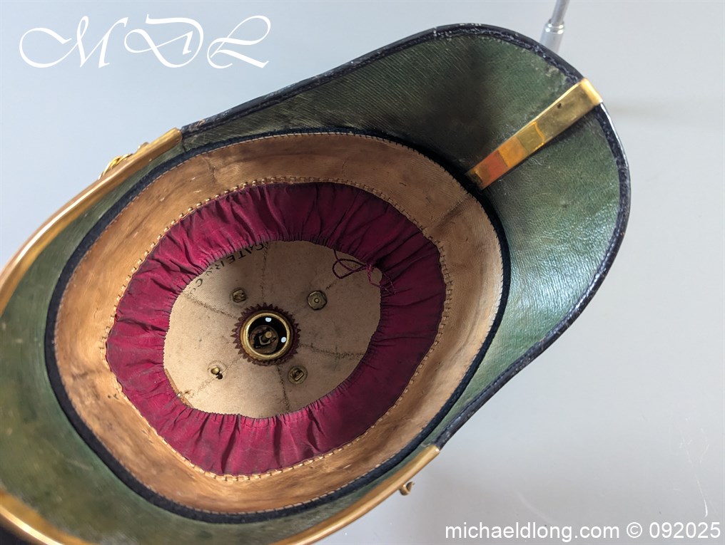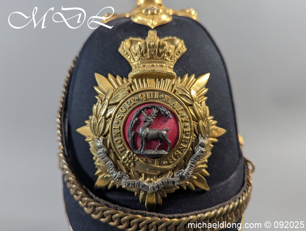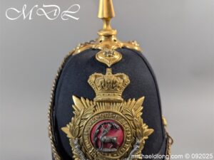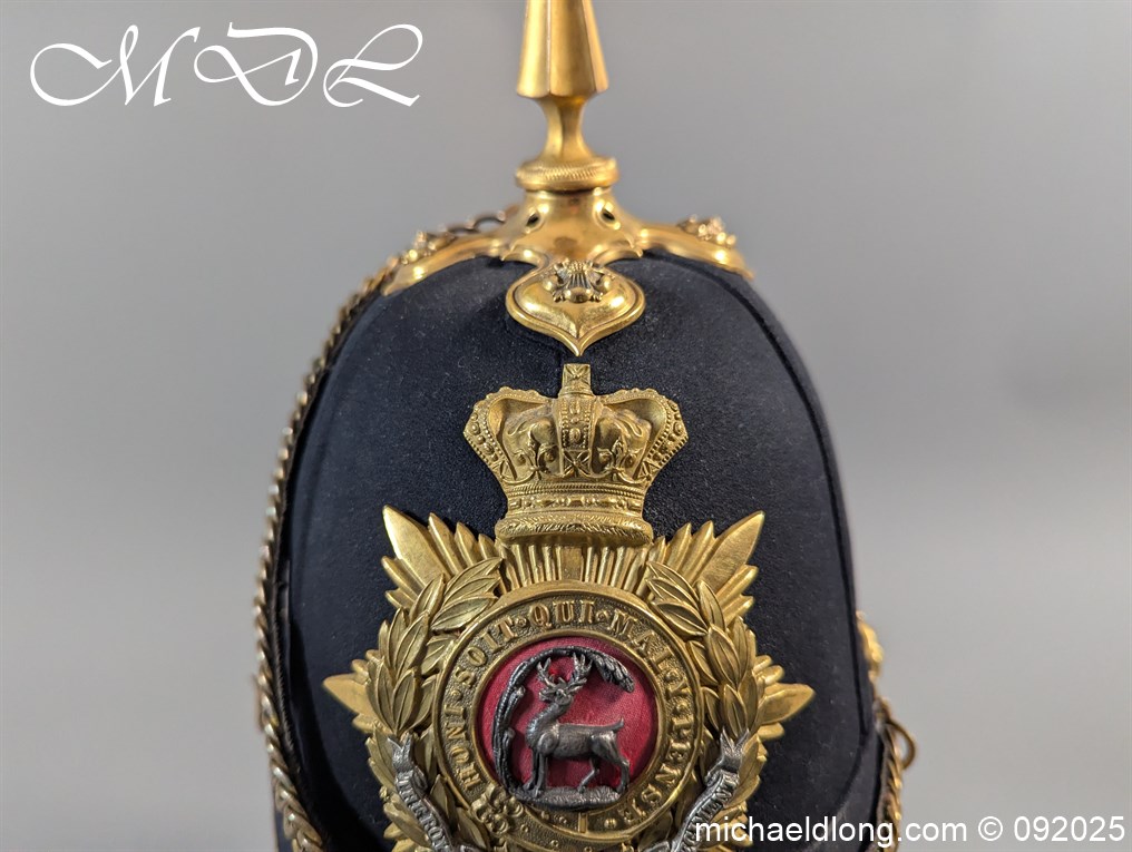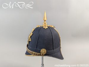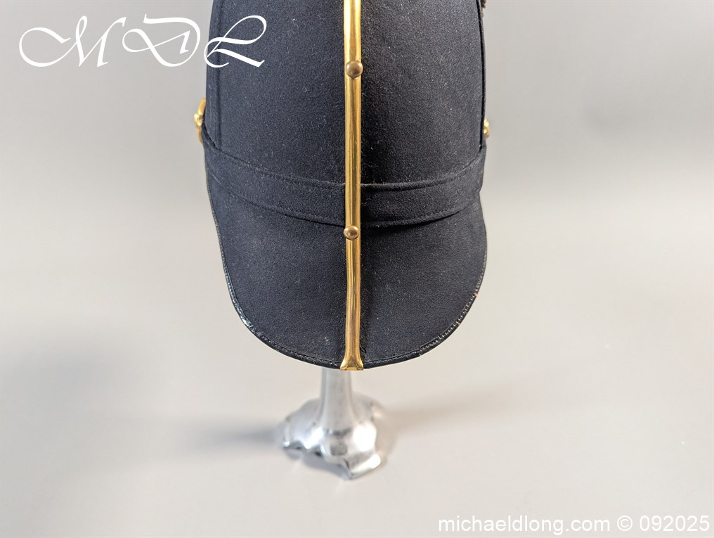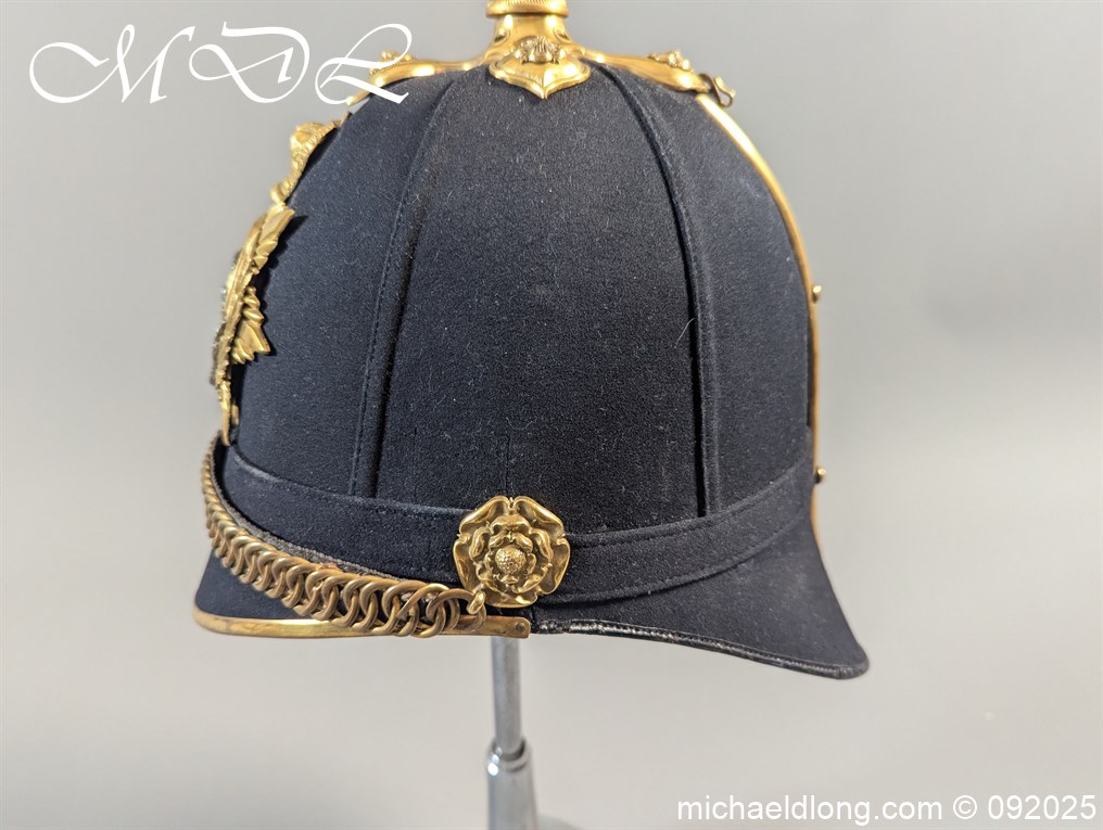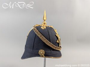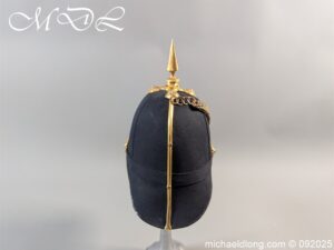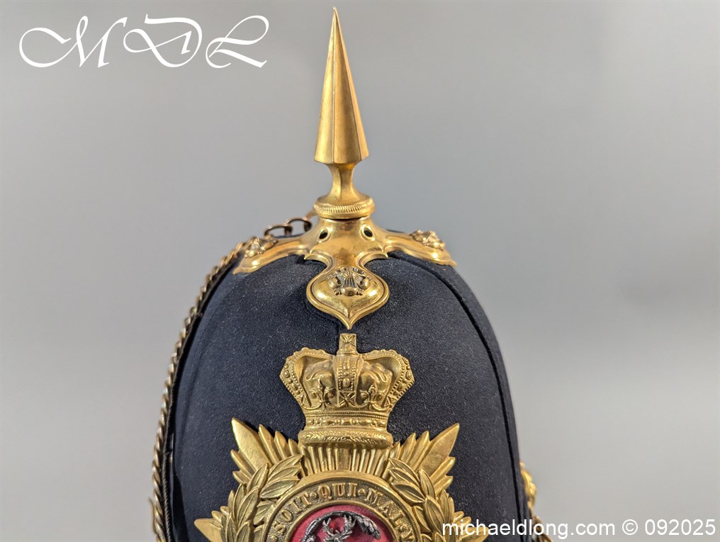 Victorian officer’s blue cloth spiked helmet of The Queens Royal West Surrey Regiment, brass peak binding, top mount and spike, velvet backed chin chain and ear rosettes, gilt and silver plated helmet plate with regimental Paschal Lamb to centre on red velvet and title scroll below, leather headband and silk liner maker marked Cater and Co London inside.