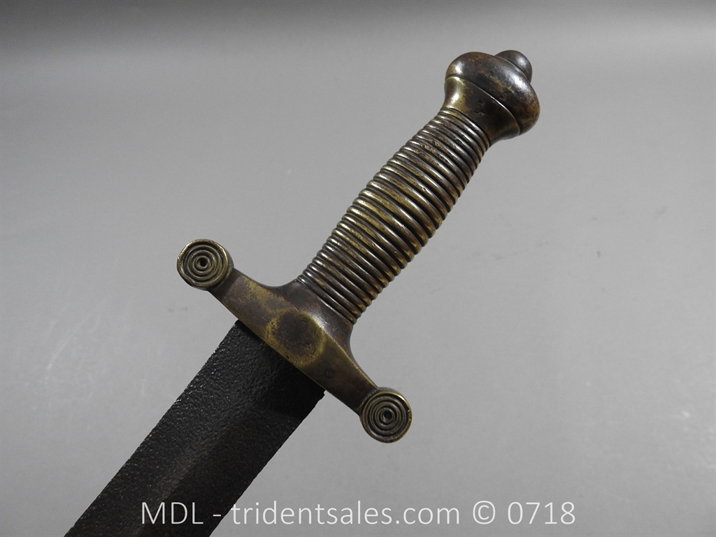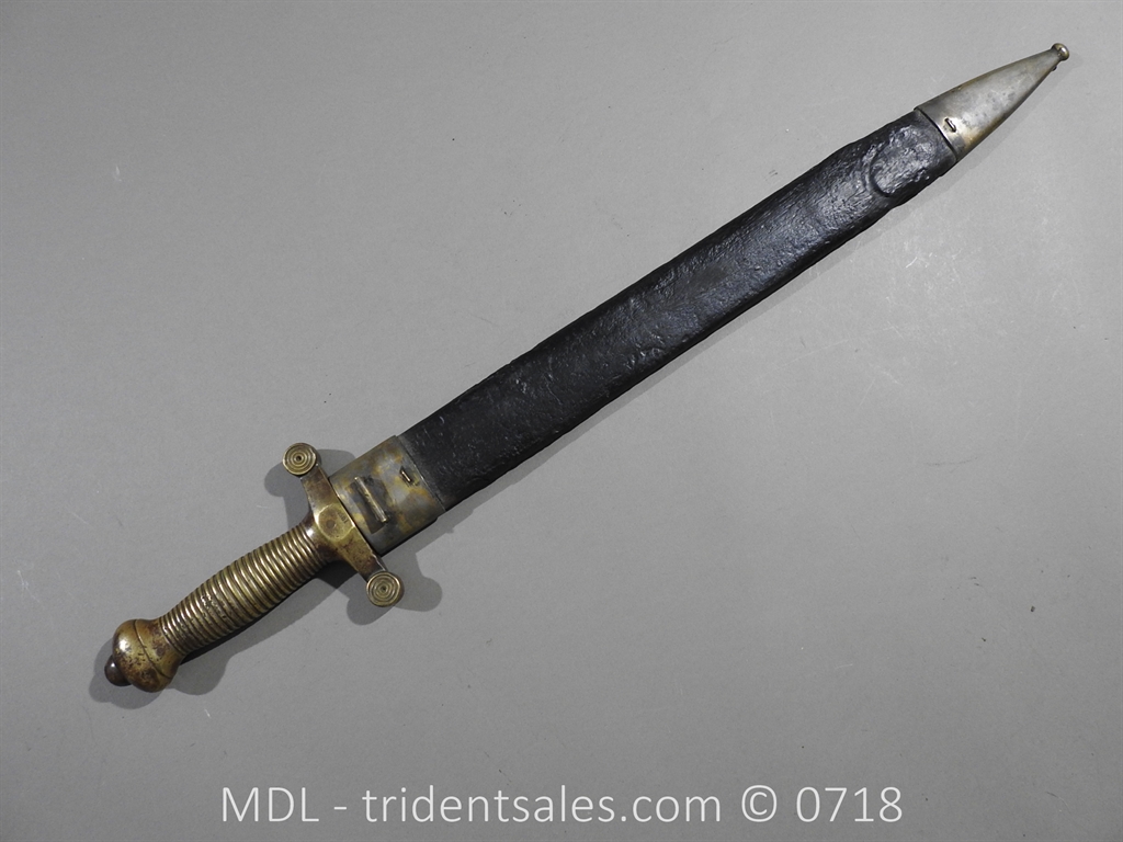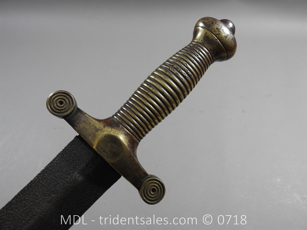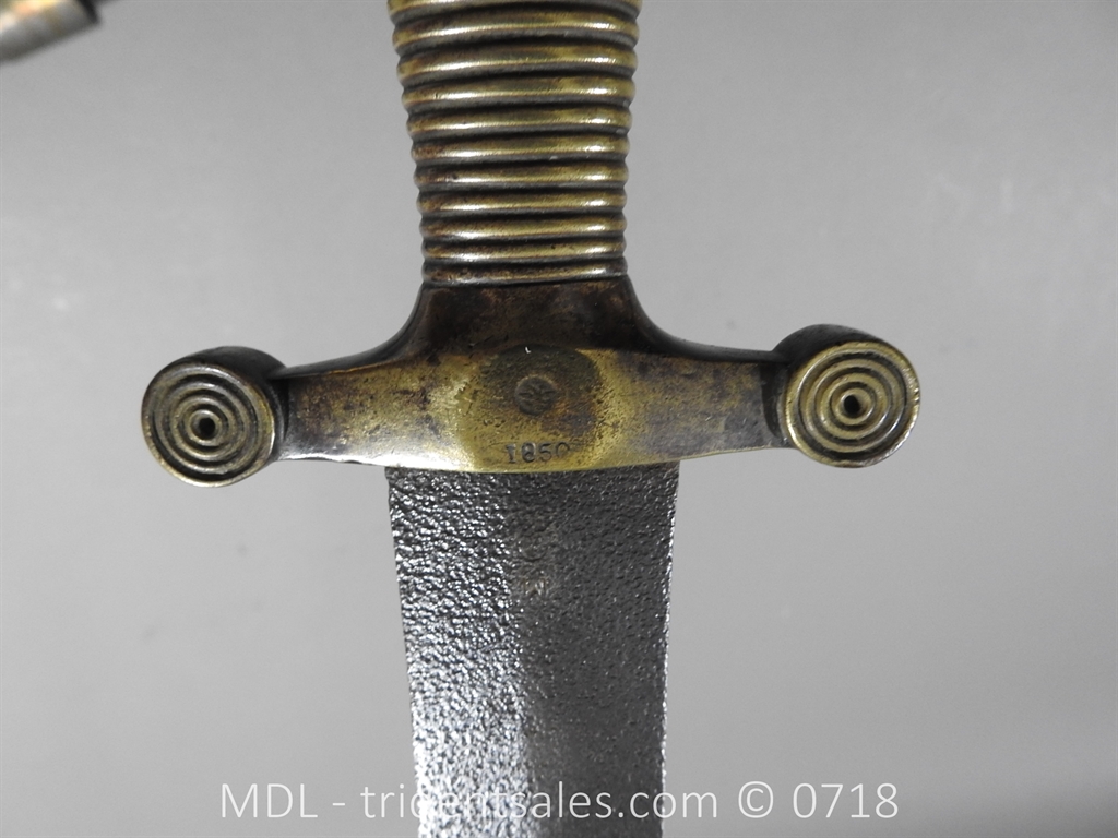 Imperial Russian Crimea war issue Gladius with brass one piece grip, crossguard and pommel. Centre of crossguard marked on one side with Imperial Eagle and date 1850 with encircled ‘V’ and’C1’ on the other. Steel Gladius blade in its black, brass mounted French 1831 scabbard. Length 628mm Blade 480mm please note condition of blade and scabbard repair