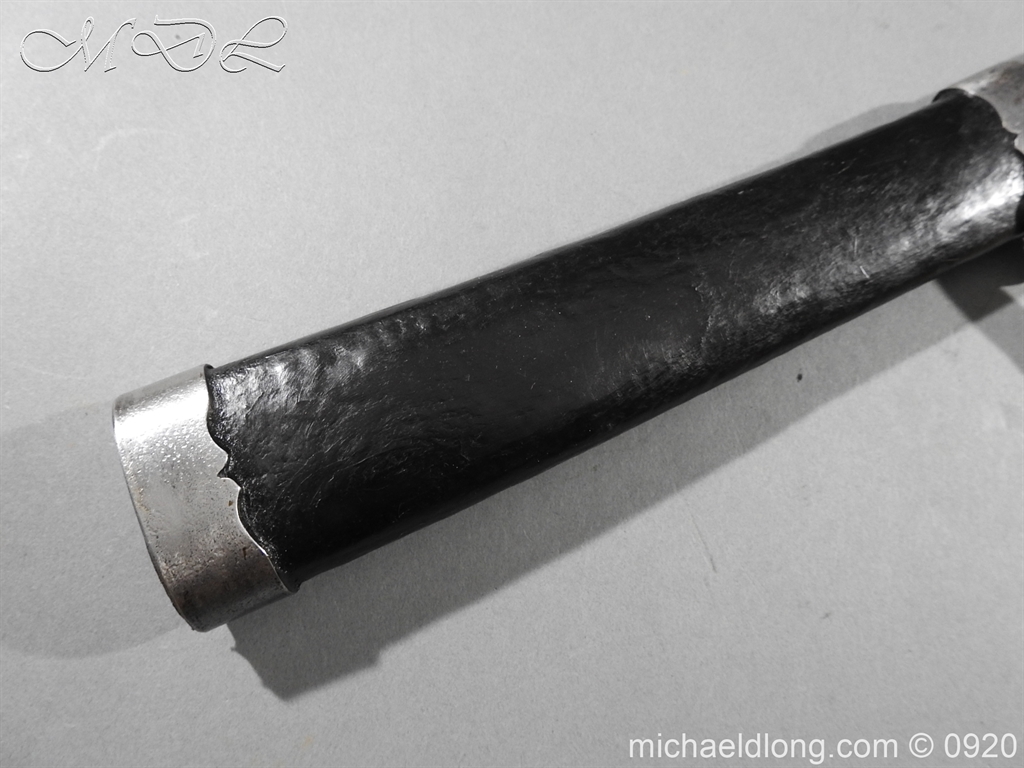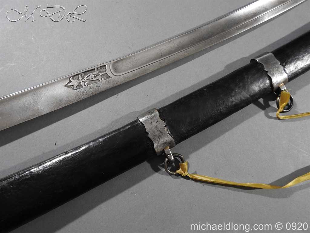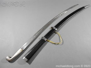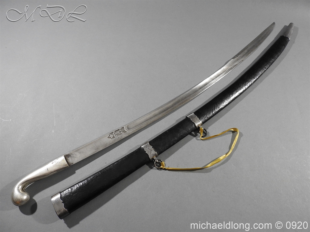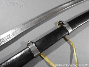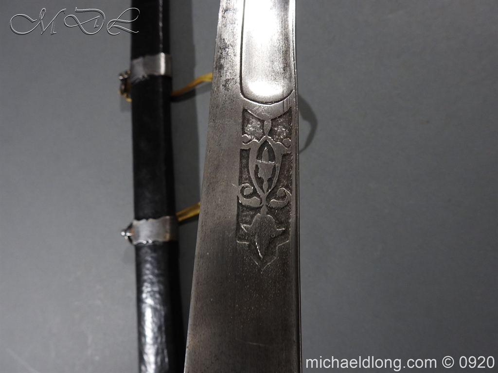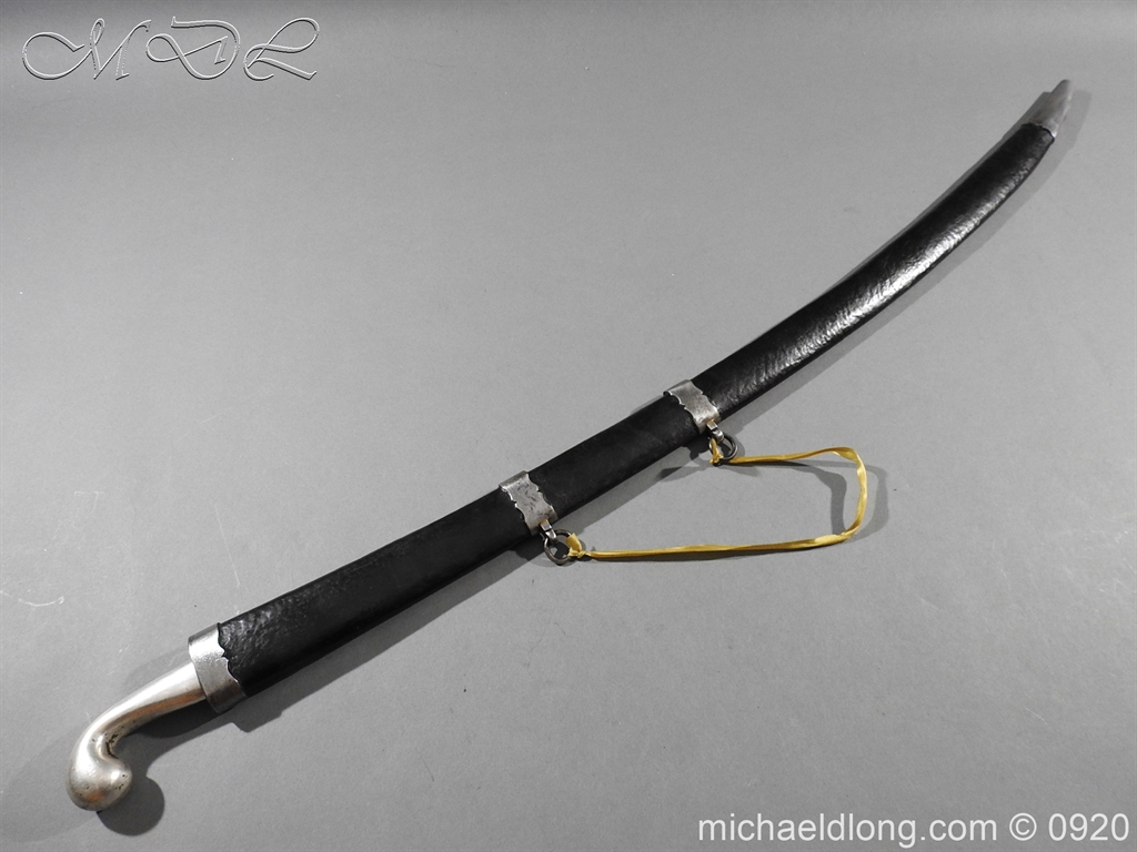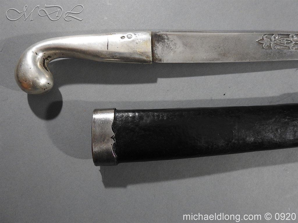 Russian Silver Mounted Shashqua, traditional form of hilt in silver with either hallmarks or makers marks. The blade slightly curved with deep chiselled decoration and clip back point with multi fullers running to the tip. The scabbard black leather with steel mounts which have been cleaned is in good solid condition it is possible that the leather has been replaced within it’s life time overall length 99cm 39 inches the blade 86cm 34 inches