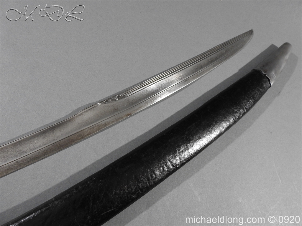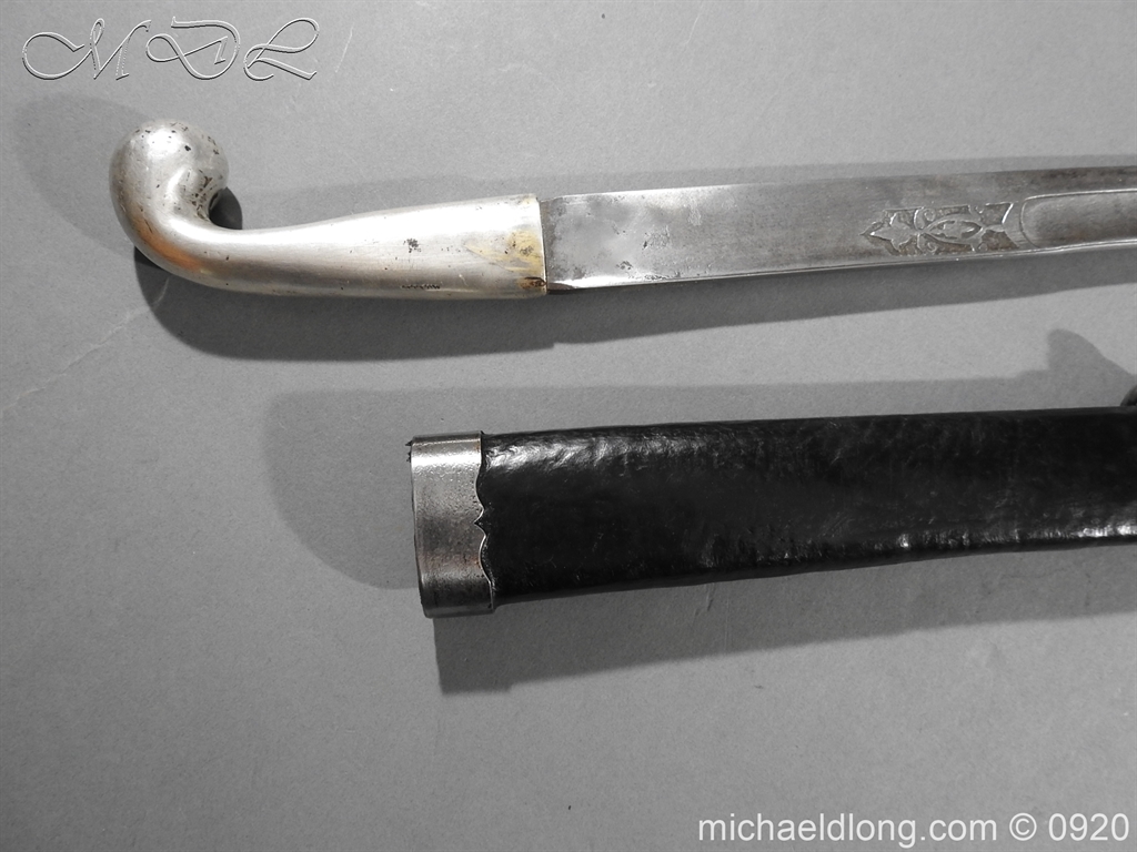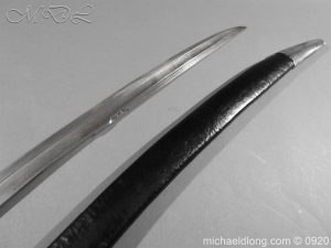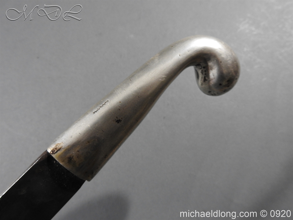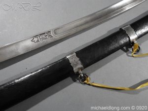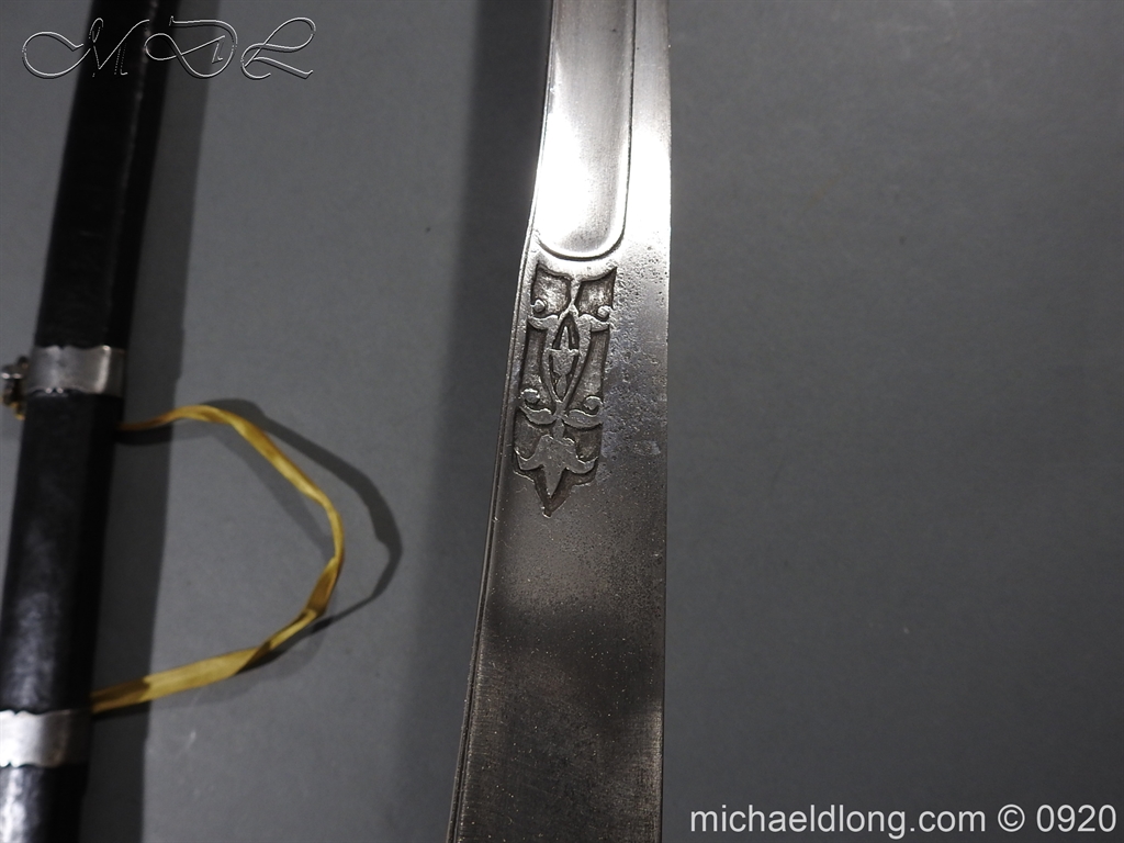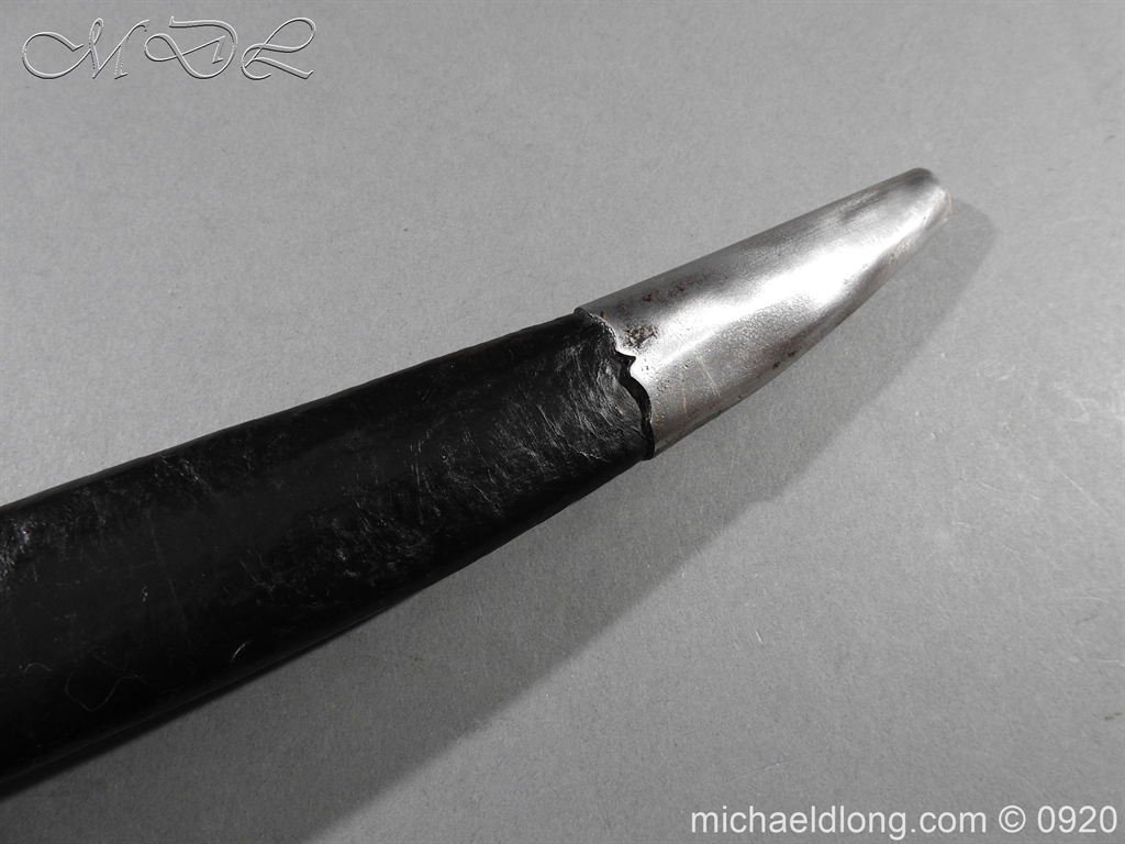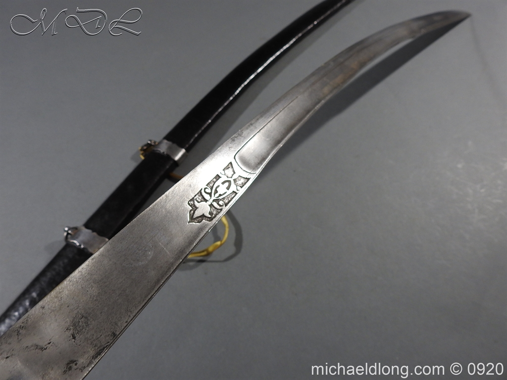 Russian Silver Mounted Shashqua, traditional form of hilt in silver with either hallmarks or makers marks. The blade slightly curved with deep chiselled decoration and clip back point with multi fullers running to the tip. The scabbard black leather with steel mounts which have been cleaned is in good solid condition it is possible that the leather has been replaced within it’s life time overall length 99cm 39 inches the blade 86cm 34 inches
