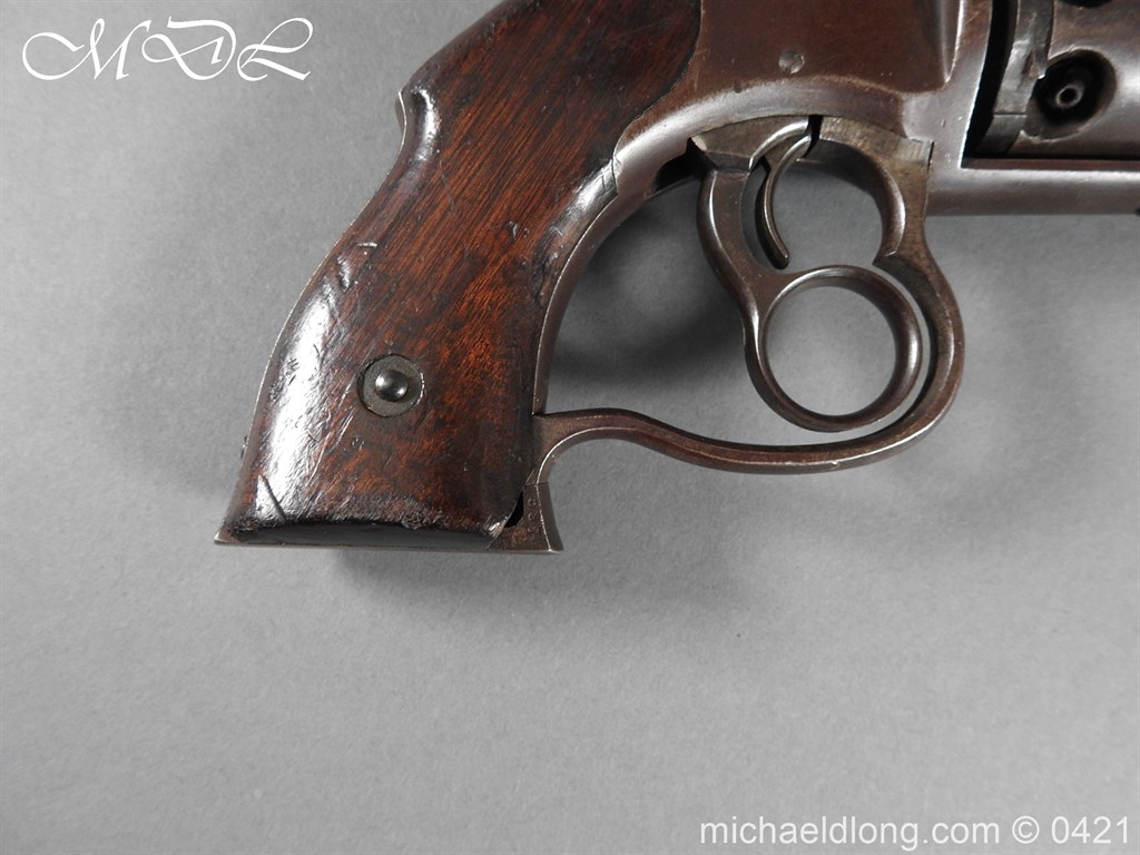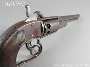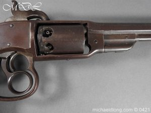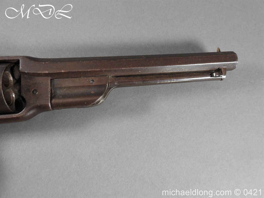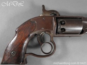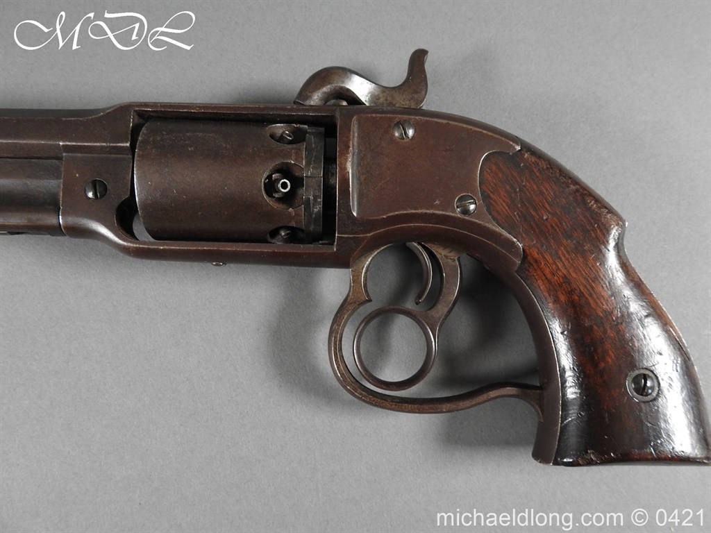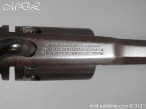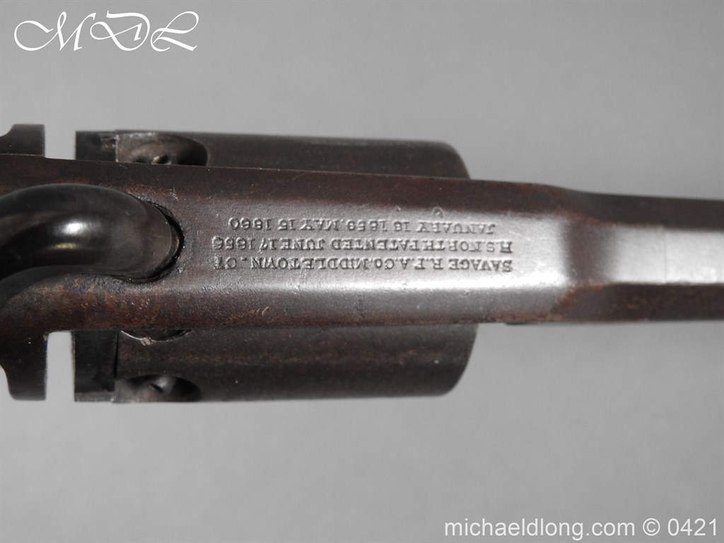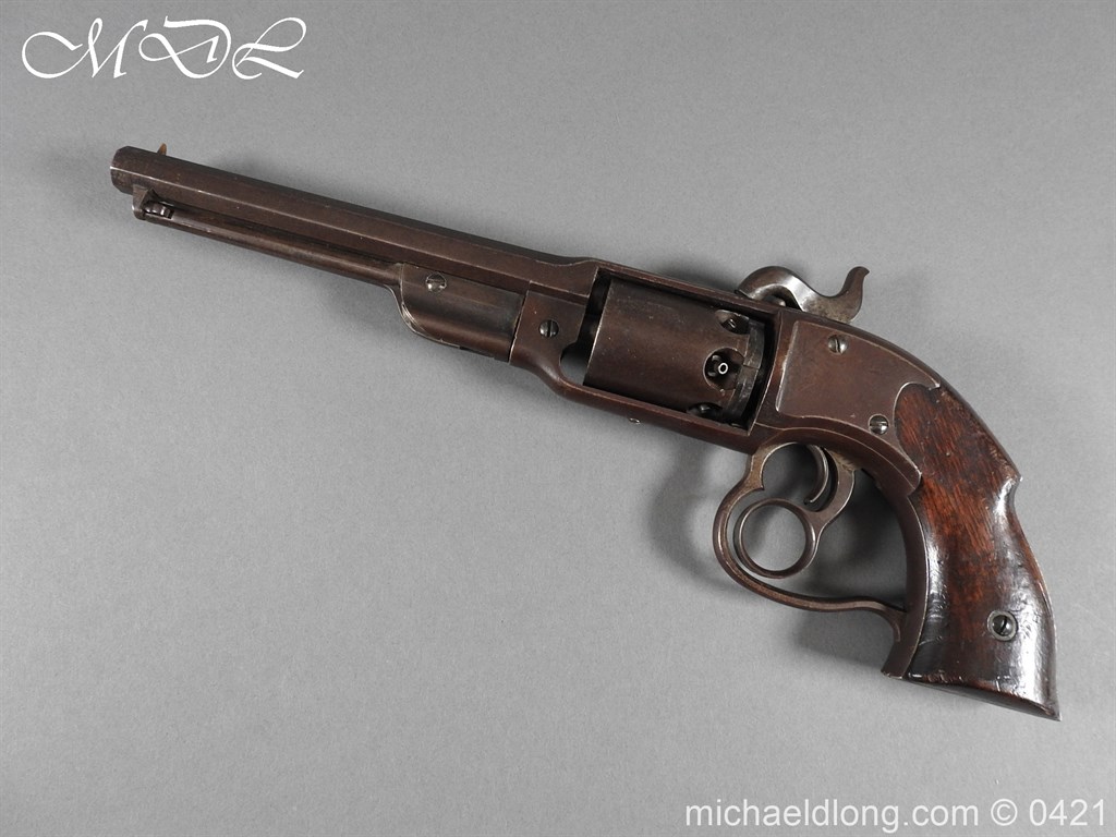 Percussion Savage Firearms Co. Navy Model Six-Shot Revolver, Circa 1860. With russet octagonal sighted barrel, top-strap, bevelled frame and spurred butt all in one piece, the top-strap stamped, ‘Savage R.F.A. Co. Middletown. Ct. H.S. North Patented June 17 1856 January 18 1859 May 15 1860’, russet cylinder, ring cocking-level within the trigger-guard, rammer with sprung catch, shaped figured grips brown patina overall. The trigger doesn’t hold on full cock.
