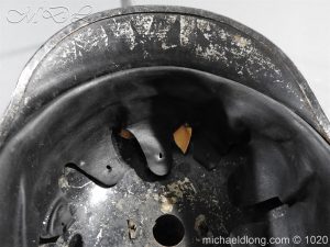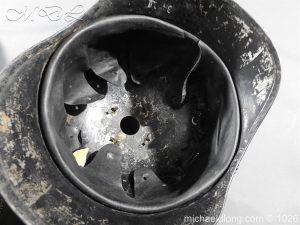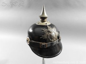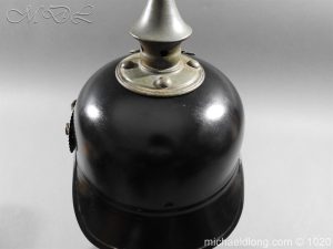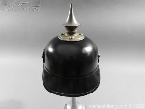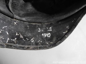 Saxon Infantry Enlisted Pickelhaube dated 1918 steel skull externally repainted however internally original with date and unit markings. Field grey fittings and complete with chinstrap, cockades and liner