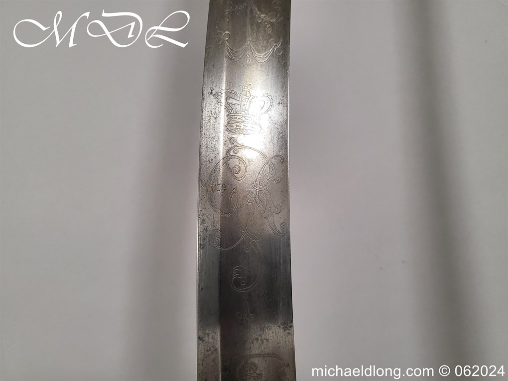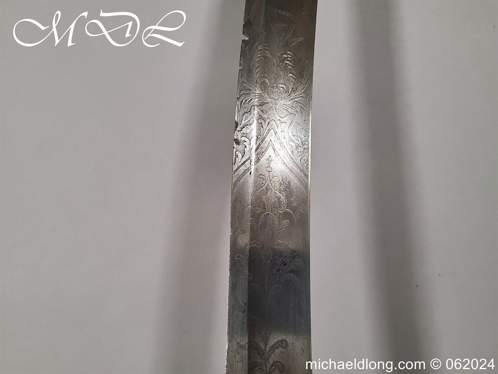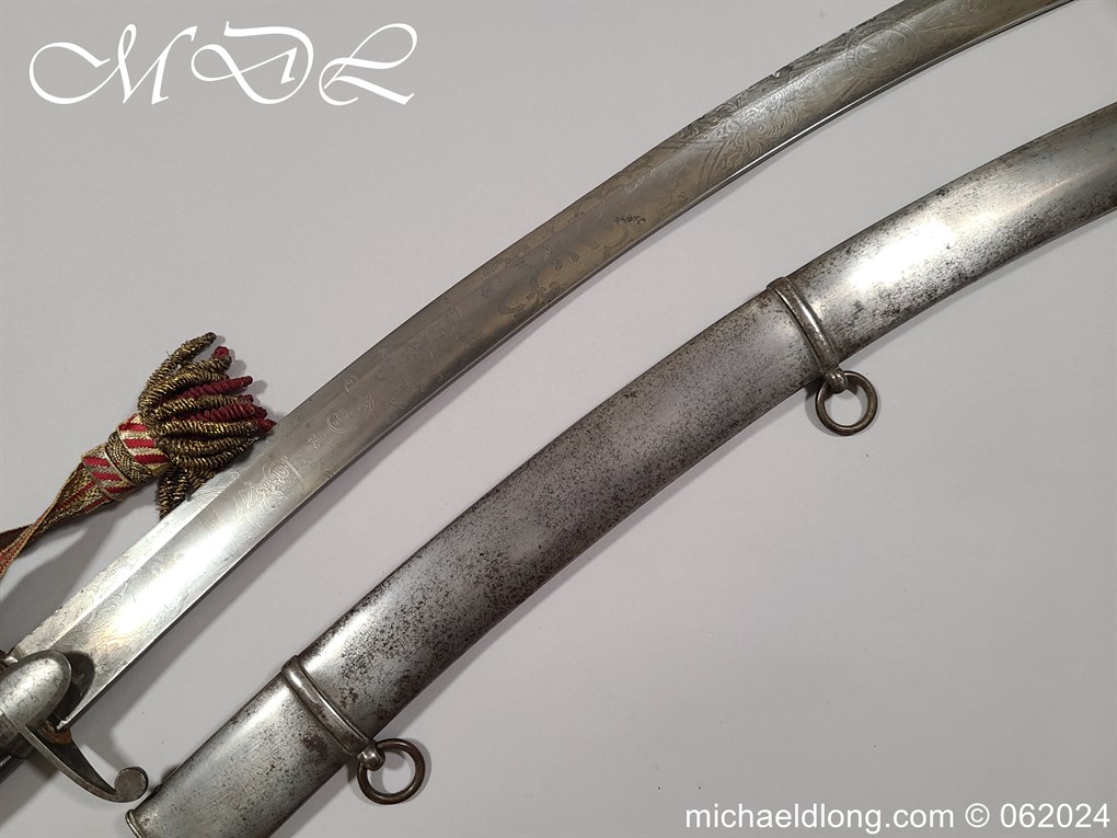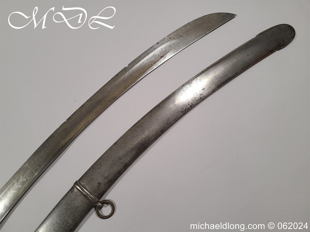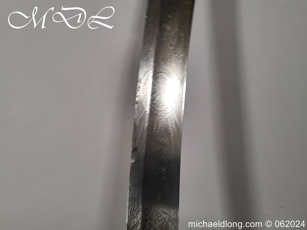 Scots Fusiliers 1796 Officers Sword, regulation officers hilt with leather grip secure by twisted silver wire and Georgian dress knot. The blade curved single edged and engraved nearly to the point with trophies of arms, crown GR, royal coat of arms, regimental device, initials and mounted hussar all surrounded by floral decoration. Please note the nicks to the blade edge complete with steel scabbard with two loose rings, overall length 95.5cm the blade 83cm