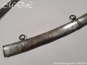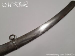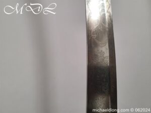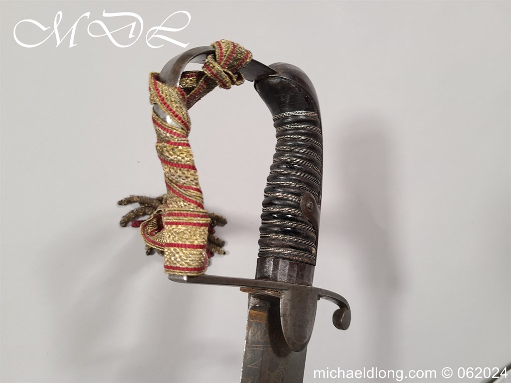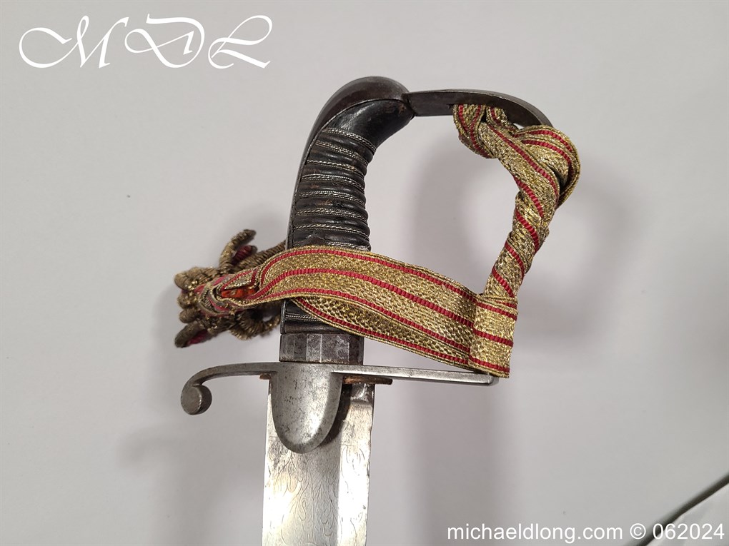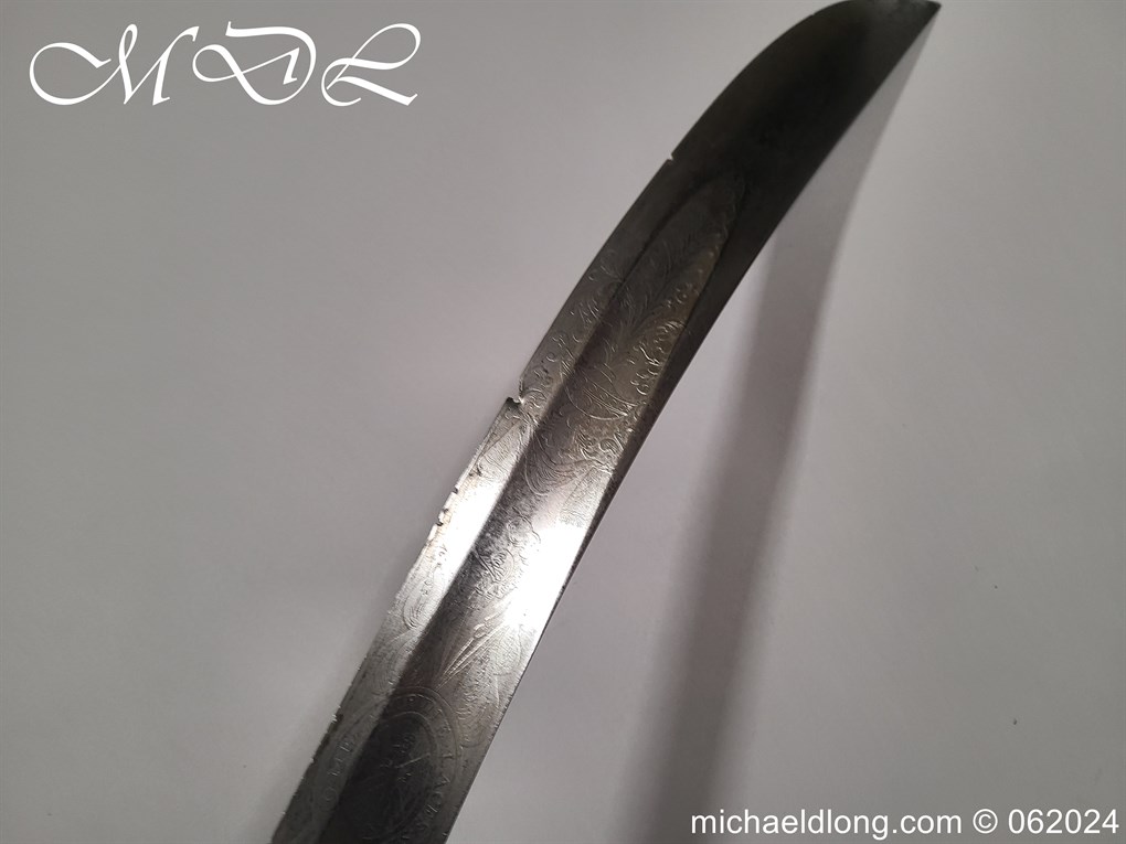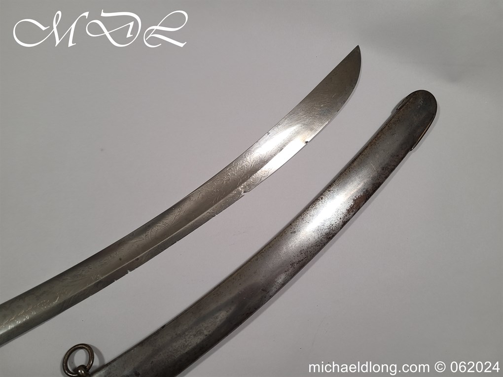 Scots Fusiliers 1796 Officers Sword, regulation officers hilt with leather grip secure by twisted silver wire and Georgian dress knot. The blade curved single edged and engraved nearly to the point with trophies of arms, crown GR, royal coat of arms, regimental device, initials and mounted hussar all surrounded by floral decoration. Please note the nicks to the blade edge complete with steel scabbard with two loose rings, overall length 95.5cm the blade 83cm