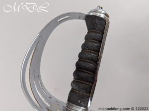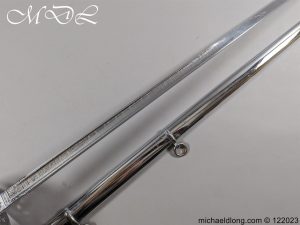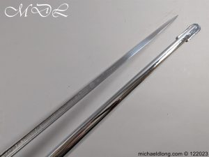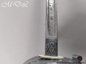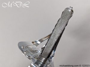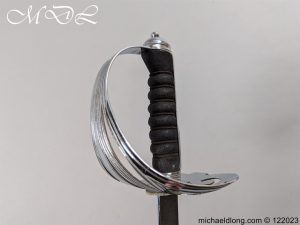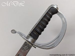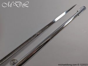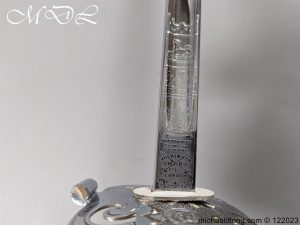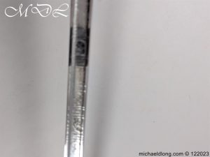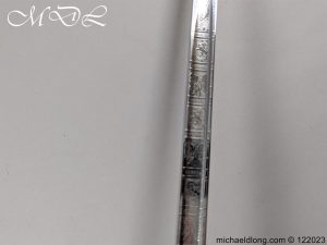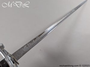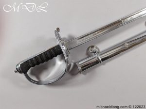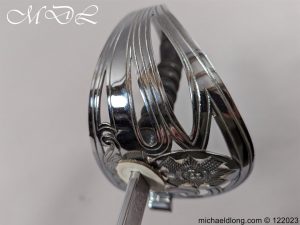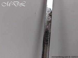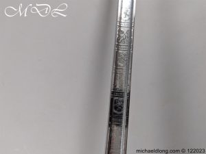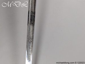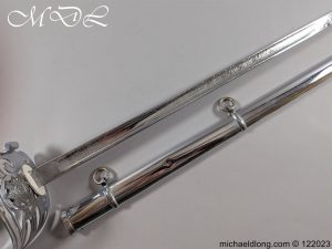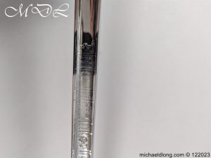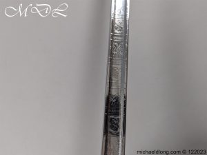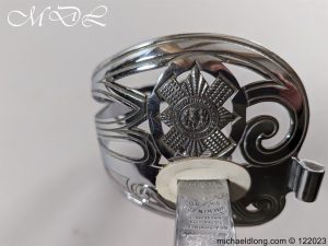 Transitional sword between GR 6th and EIIR possibly made for the Coronation 82.5cm blade by Wilkinson, serial no. 72417 for 1953, etched with thistles, scrolling foliage, crowned EIIR cypher, crowned regimental badge and full battle honours to France & Flanders plus Kings Crown , regulation plated steel gothic hilt incorporating the regimental badge, contained in its plated steel scabbard.