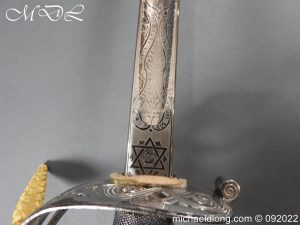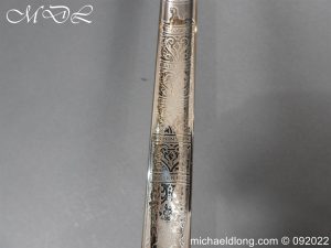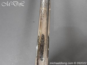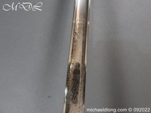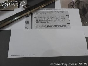 Scots Guards Sword by Wilkinson No 41805 purchased in 1908 by Ronald Tress Barry. Scots Guards Regimental hilt with fish skin grip well engraved blade with kings crown, regimental badge, initials R T B and battle honours all clear and in good order. Complete with parade scabbard showing some age wear and research