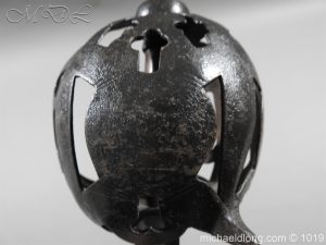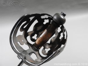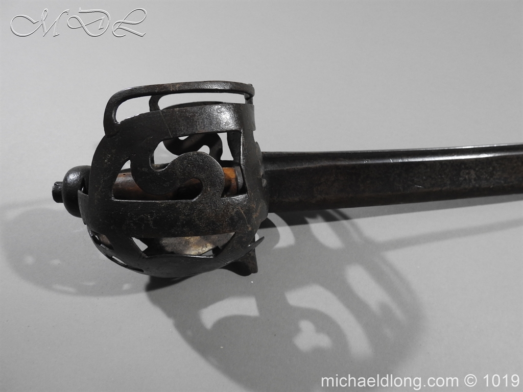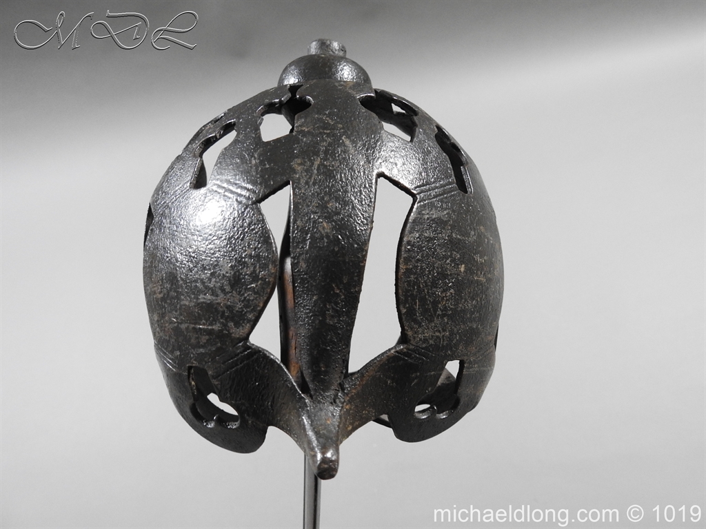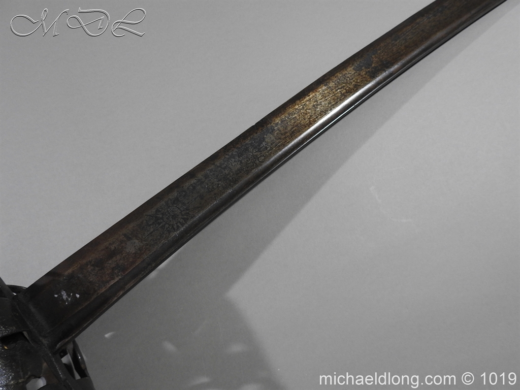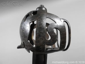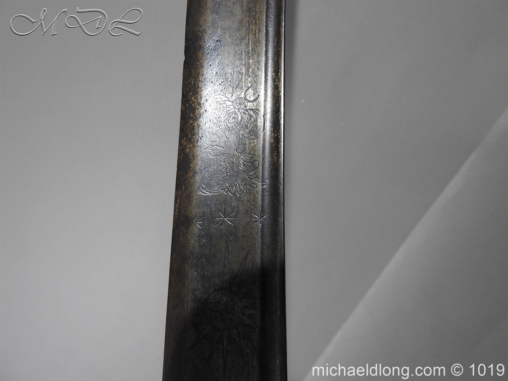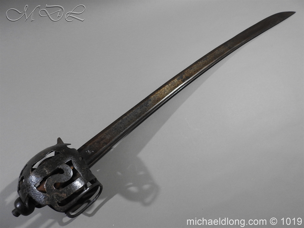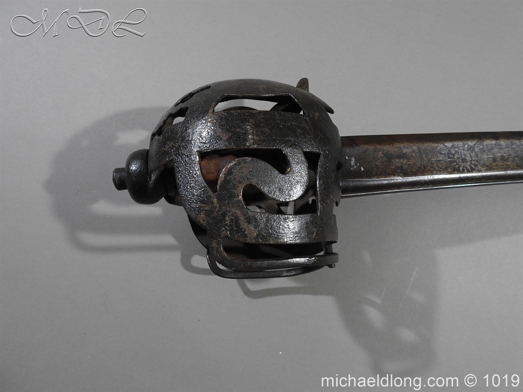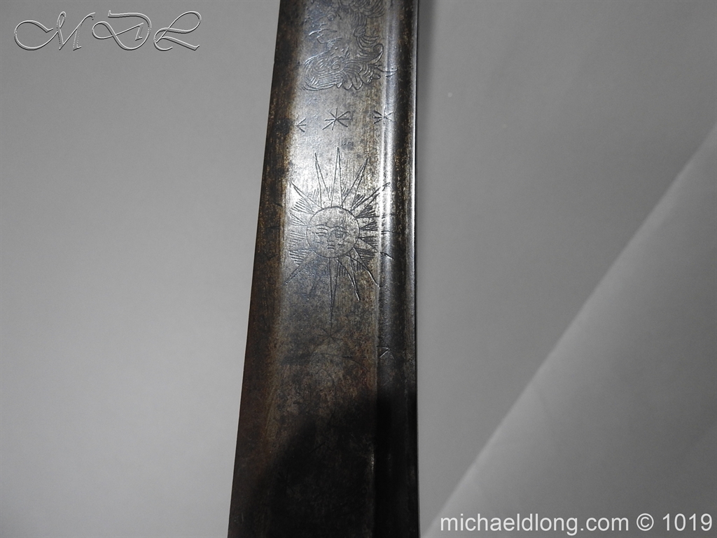 Late 17th century Scottish sword with super ribbon hilt with engraved decoration well formed with dome pommel and wooden grip which would have be bound with leather or wire. The excellent wide blade is curved with top small fuller end engraved with Turks head and sun to both sides. The sword is in very good condition untouched overall length 37 inches blade 31 inches