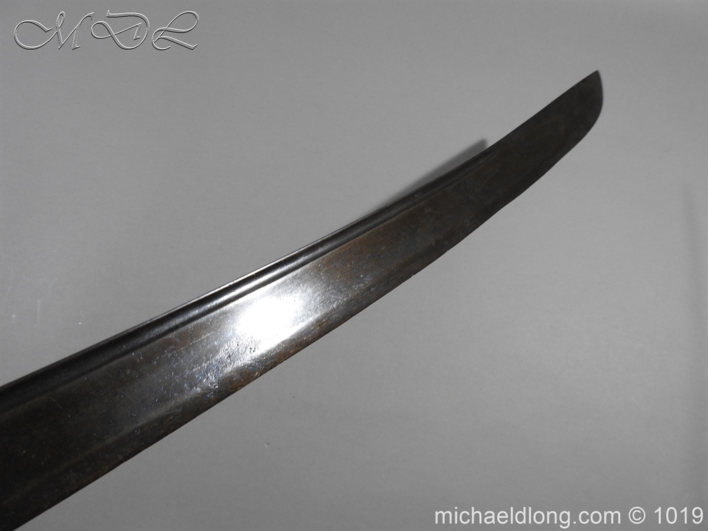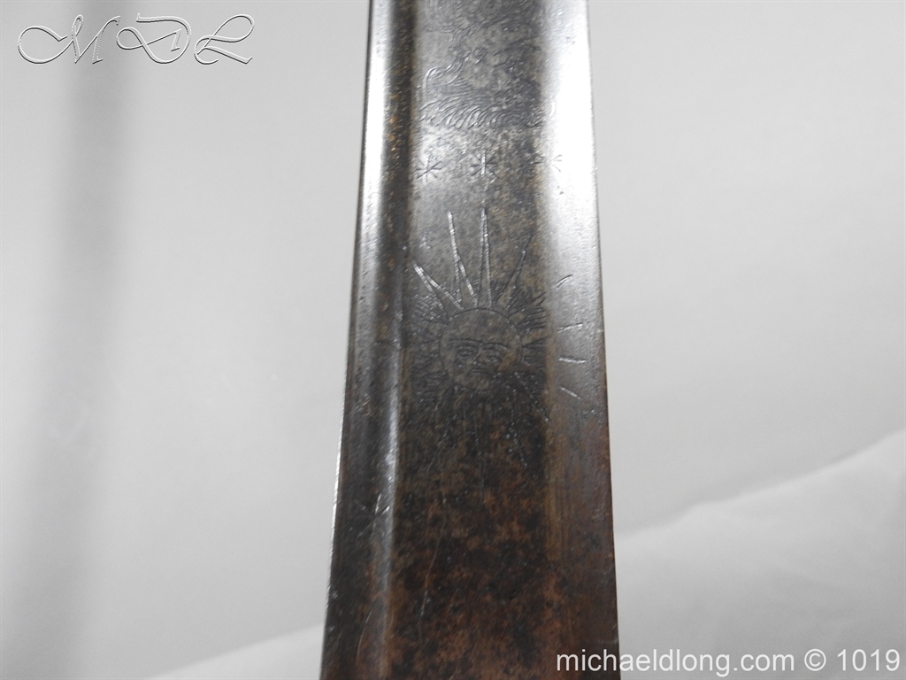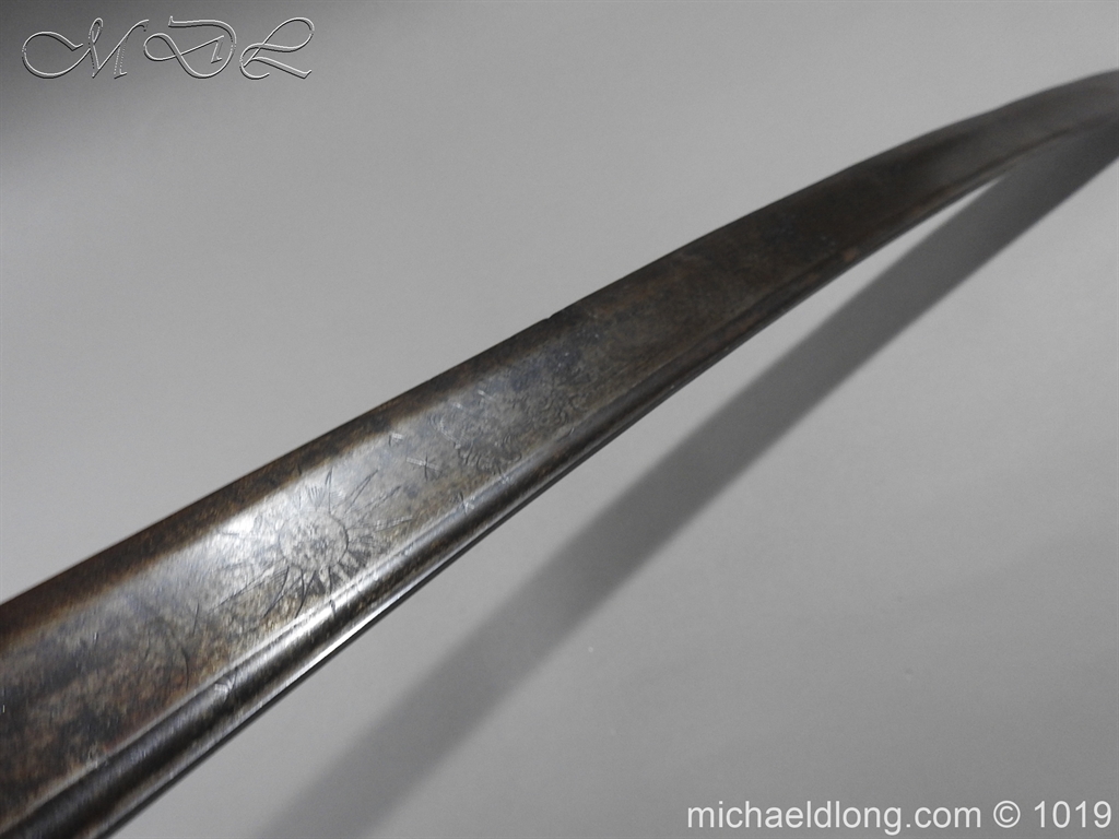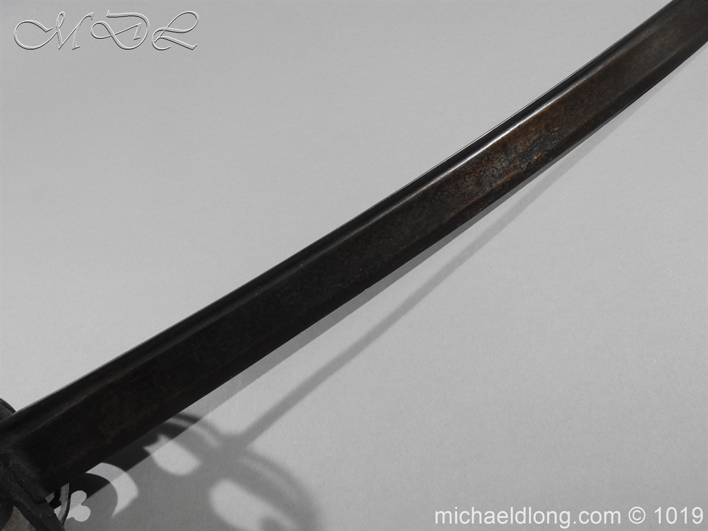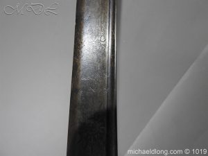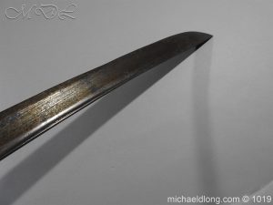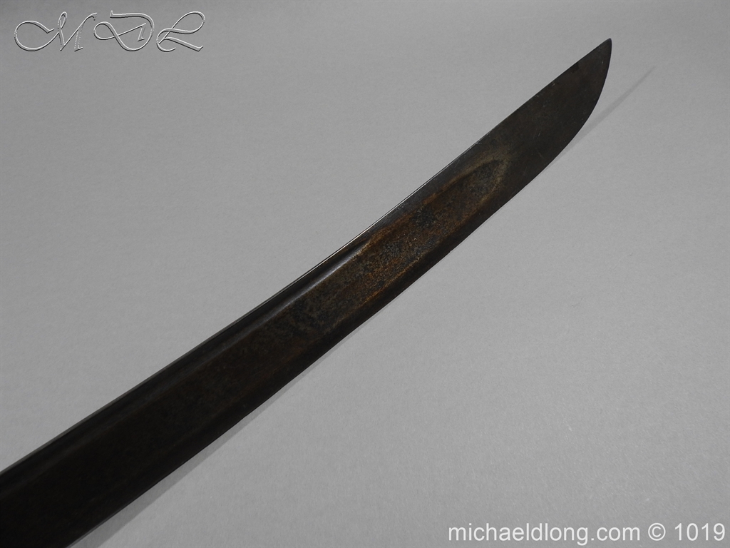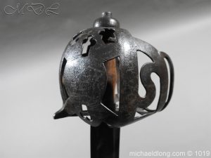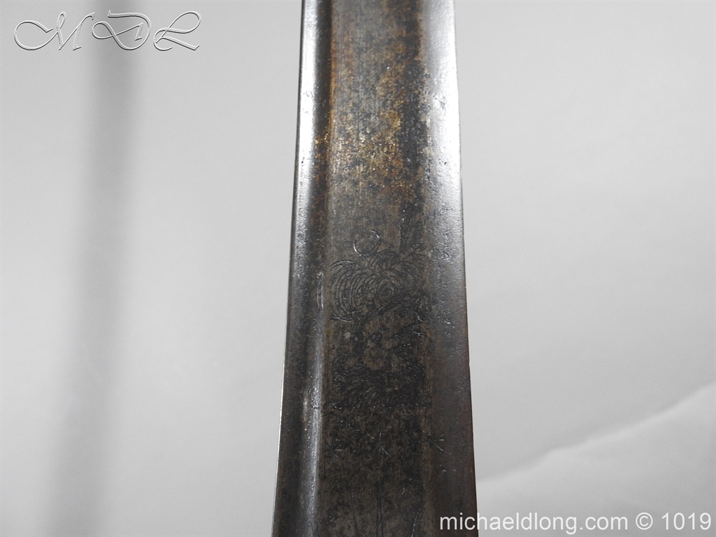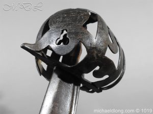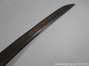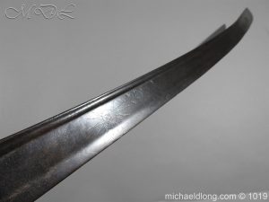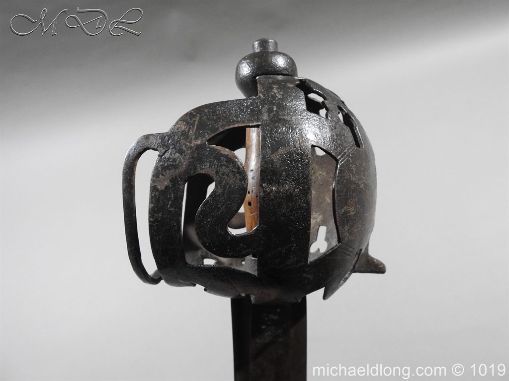 Late 17th century Scottish sword with super ribbon hilt with engraved decoration well formed with dome pommel and wooden grip which would have be bound with leather or wire. The excellent wide blade is curved with top small fuller end engraved with Turks head and sun to both sides. The sword is in very good condition untouched overall length 37 inches blade 31 inches