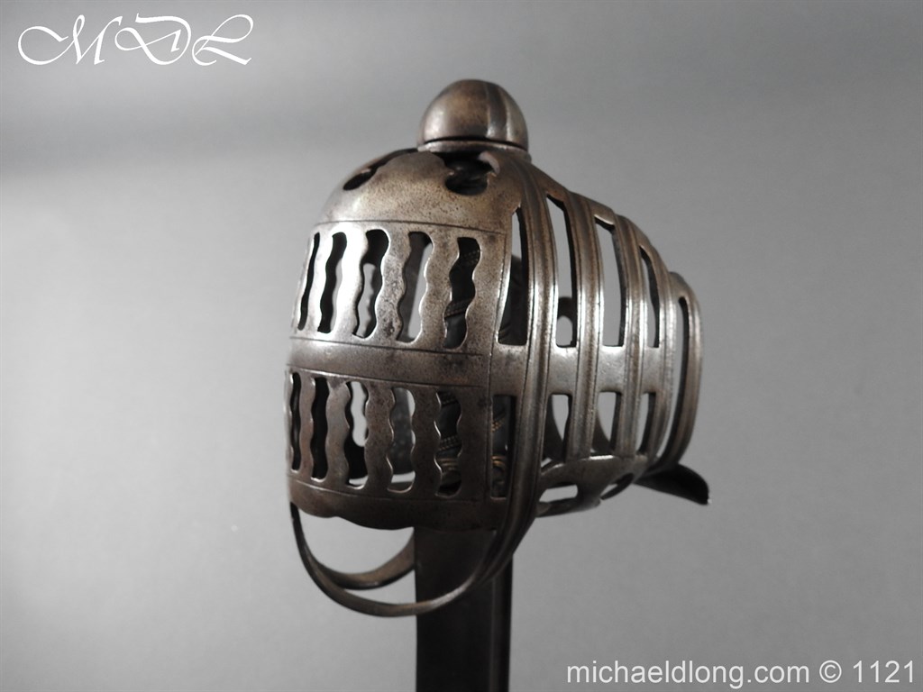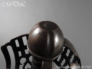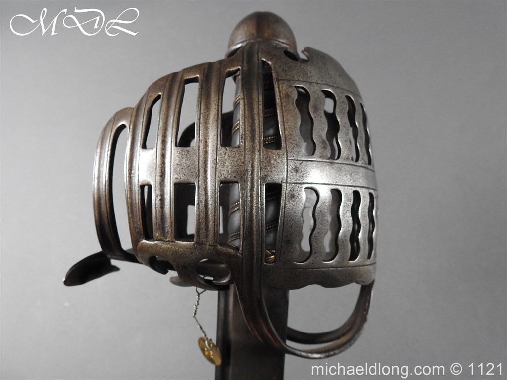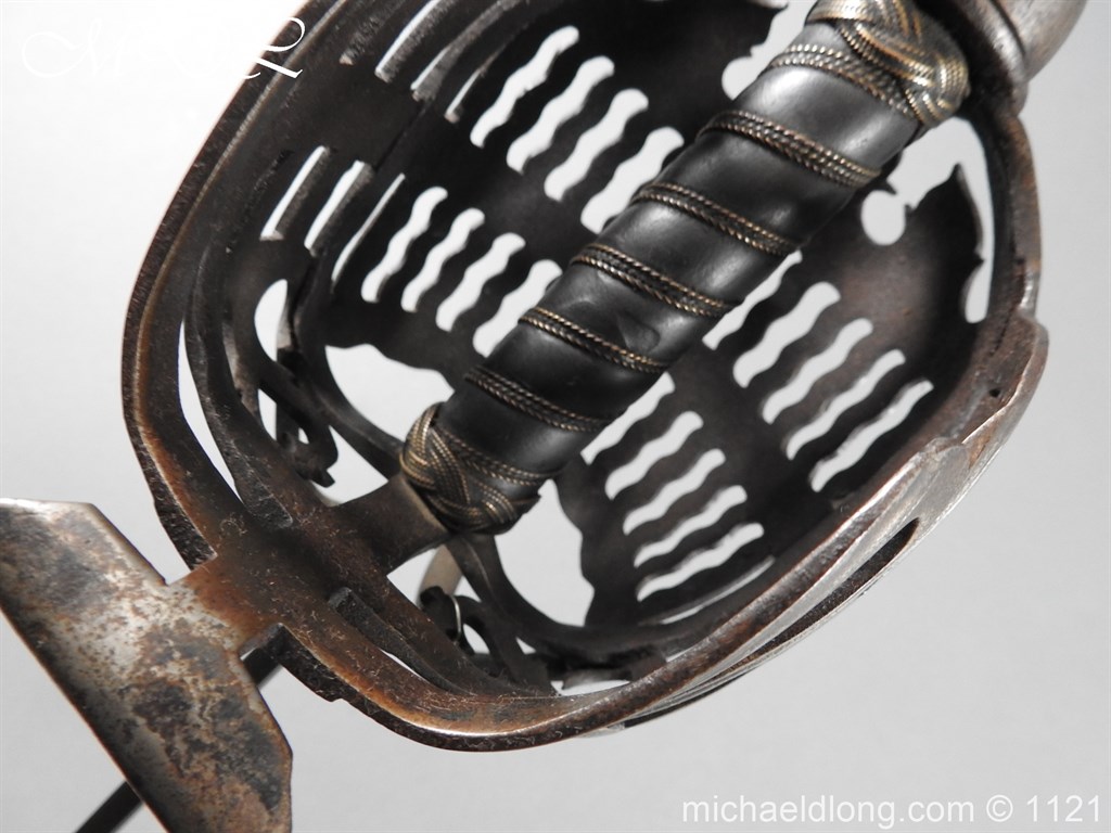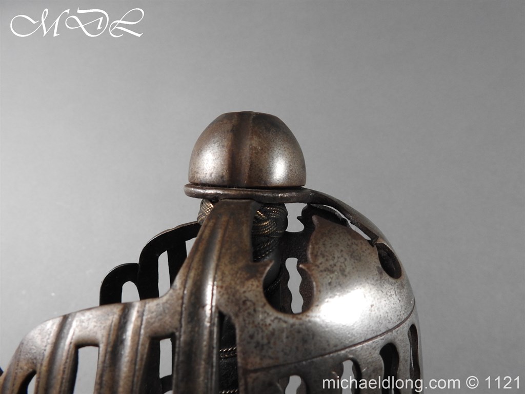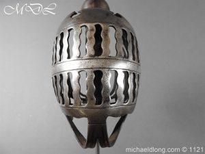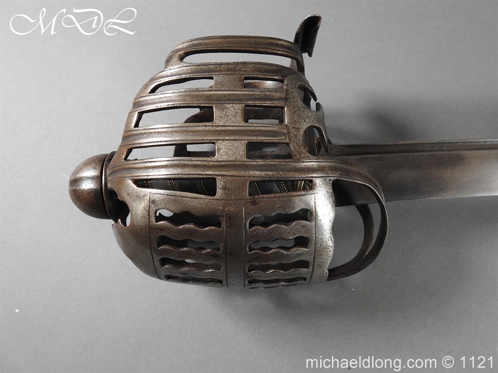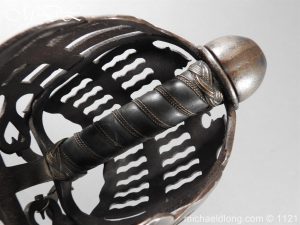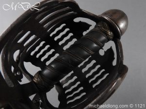 Scottish Back Sword c 1740 – 1760 possibly copied from the style of Walter Allan of Stirling full basket with pieced slots. The pommel domed with chiselled lines and complete with leather grip secured with brass wire. The straight single edged blade has been extensively cleaned to the point that the top small fuller runs out one side slightly shorter than the other and no markings are visible. Overall length 39 inches the blade 33 inches and 1.5 inches in width at the hilt. Please see Swords and Blades of the American Revolution by George Neumann plate 238.S for a similar example of this style of Sword.
