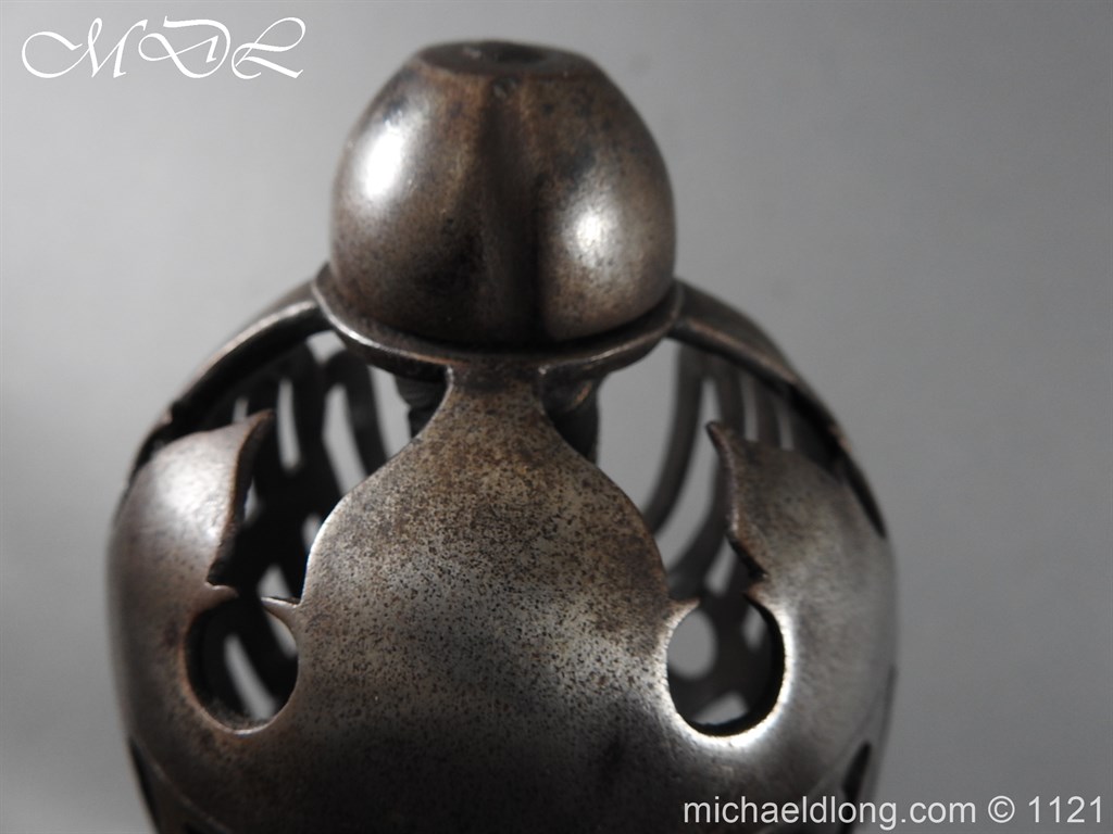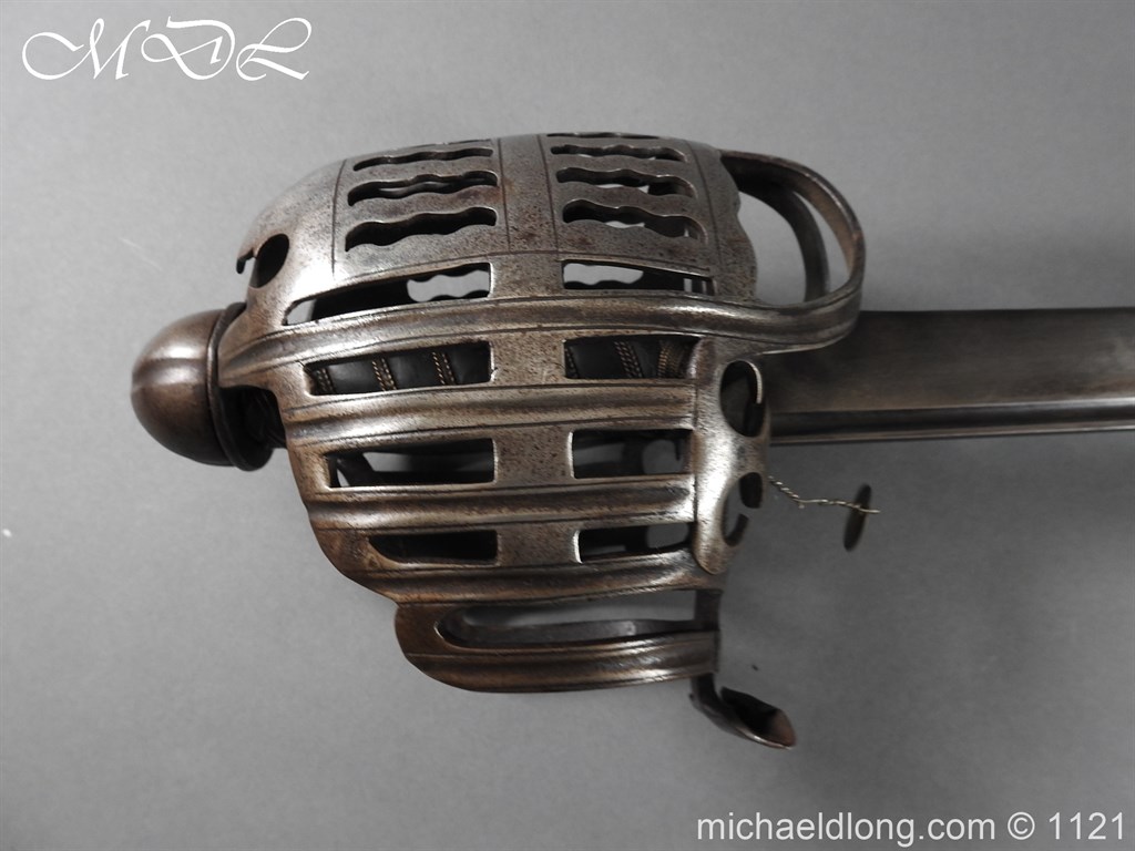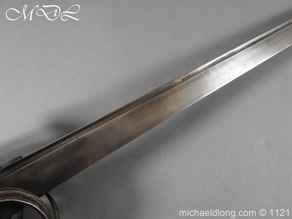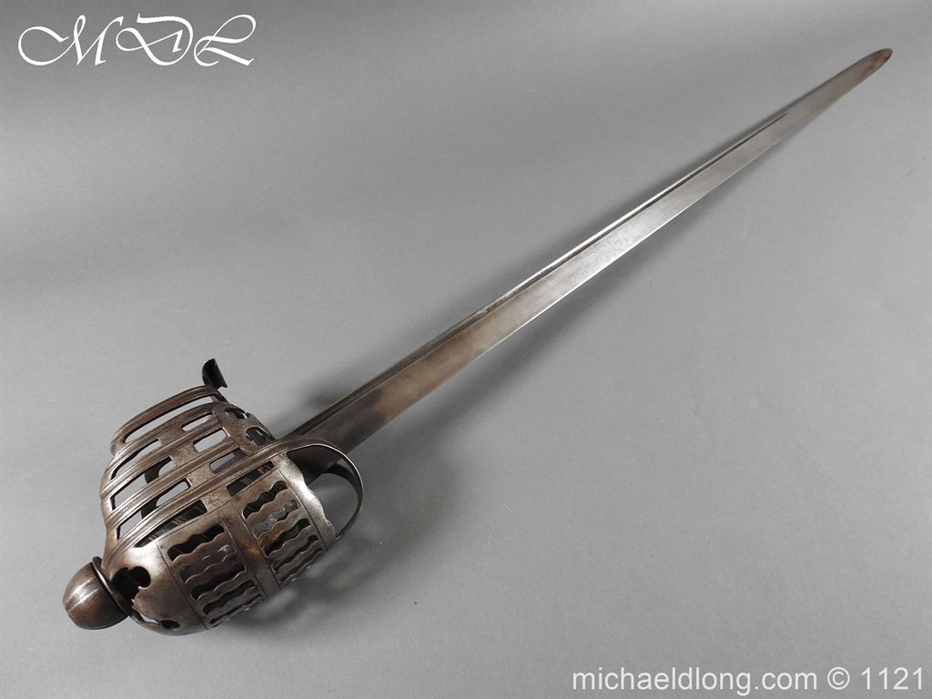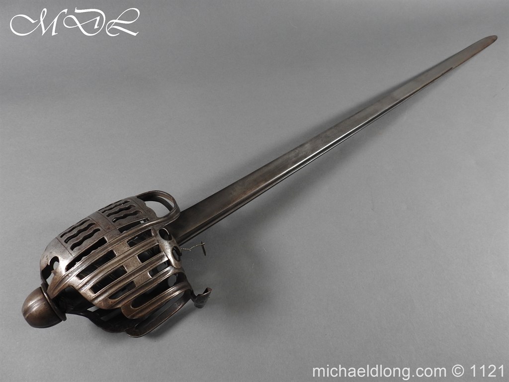 Scottish Back Sword c 1740 – 1760 possibly copied from the style of Walter Allan of Stirling full basket with pieced slots. The pommel domed with chiselled lines and complete with leather grip secured with brass wire. The straight single edged blade has been extensively cleaned to the point that the top small fuller runs out one side slightly shorter than the other and no markings are visible. Overall length 39 inches the blade 33 inches and 1.5 inches in width at the hilt. Please see Swords and Blades of the American Revolution by George Neumann plate 238.S for a similar example of this style of Sword.
