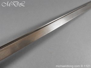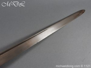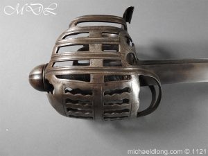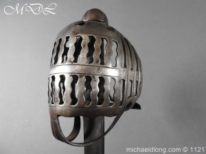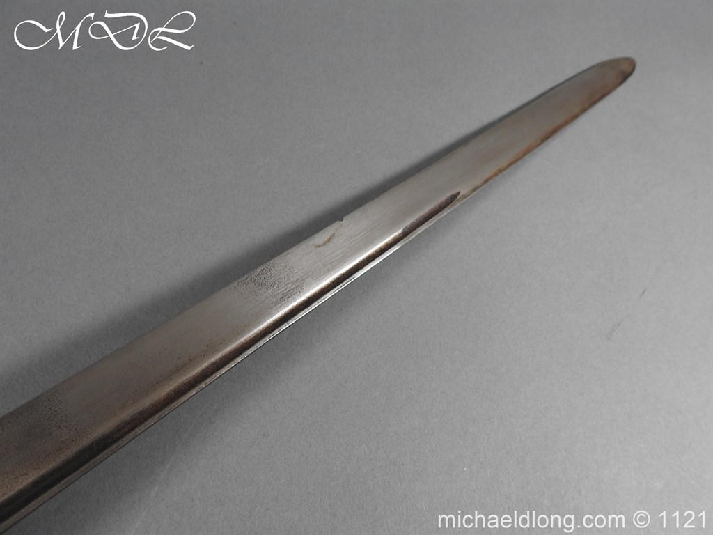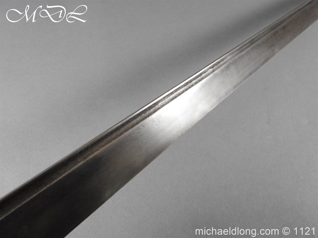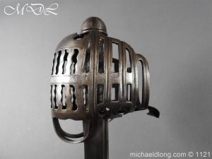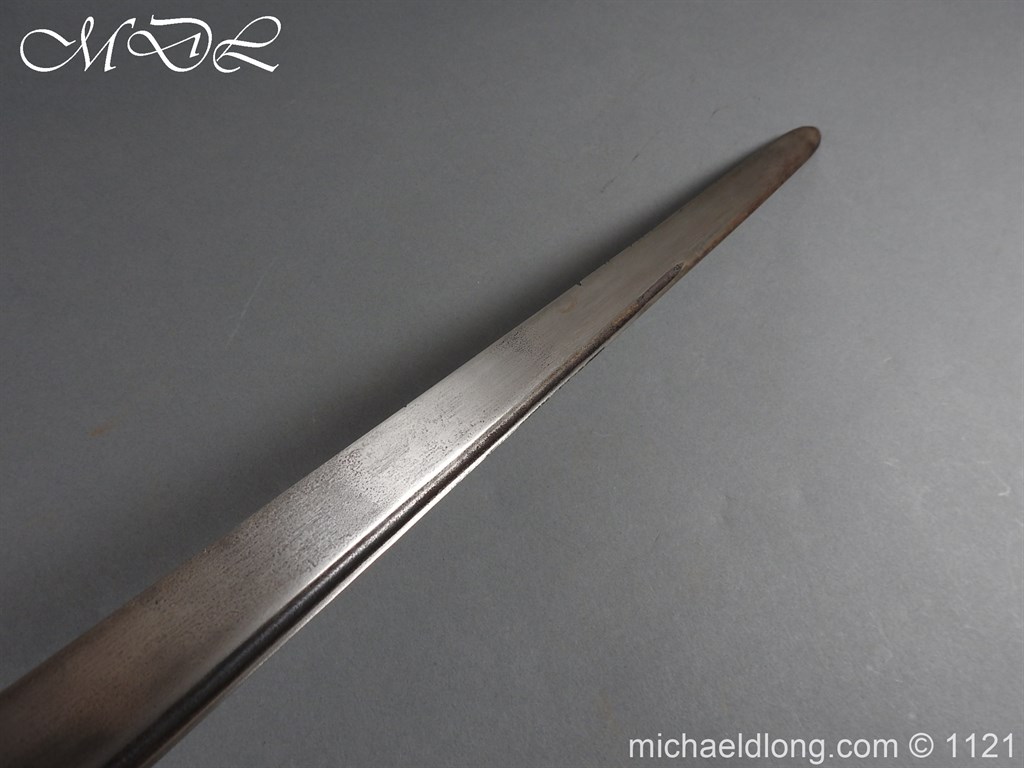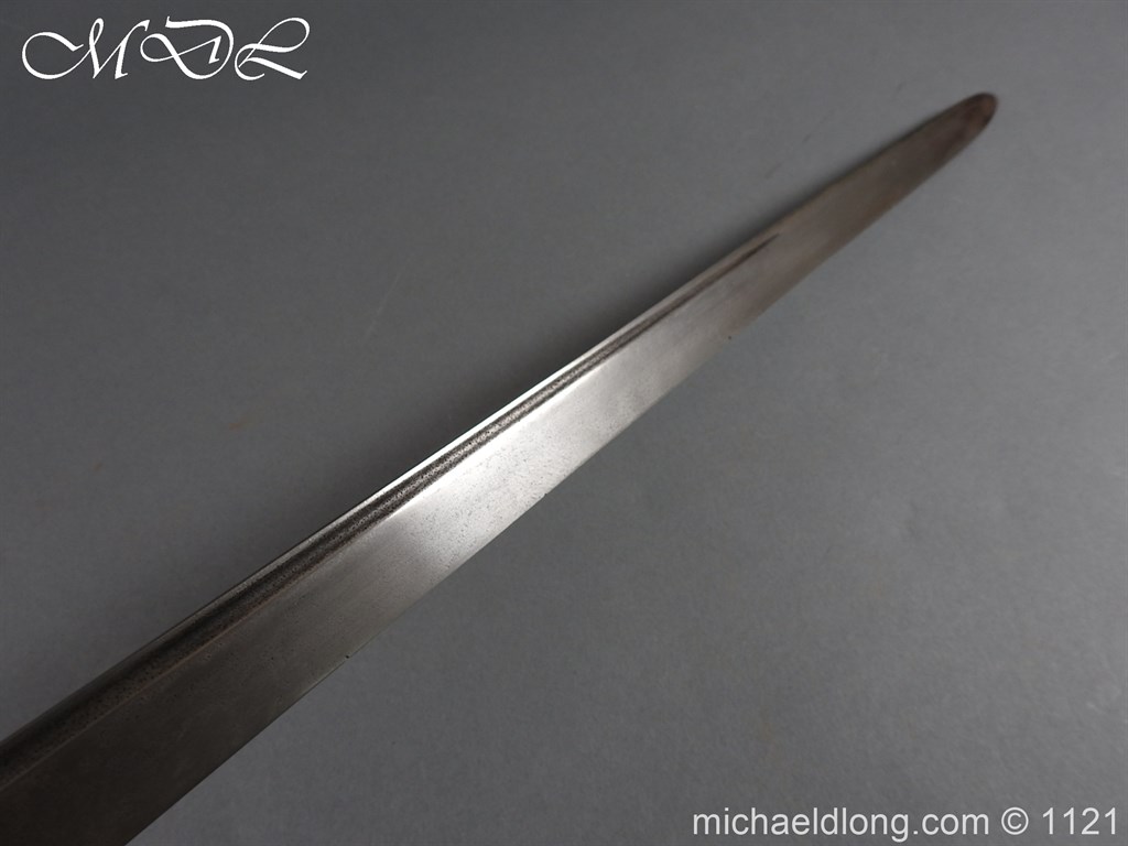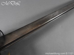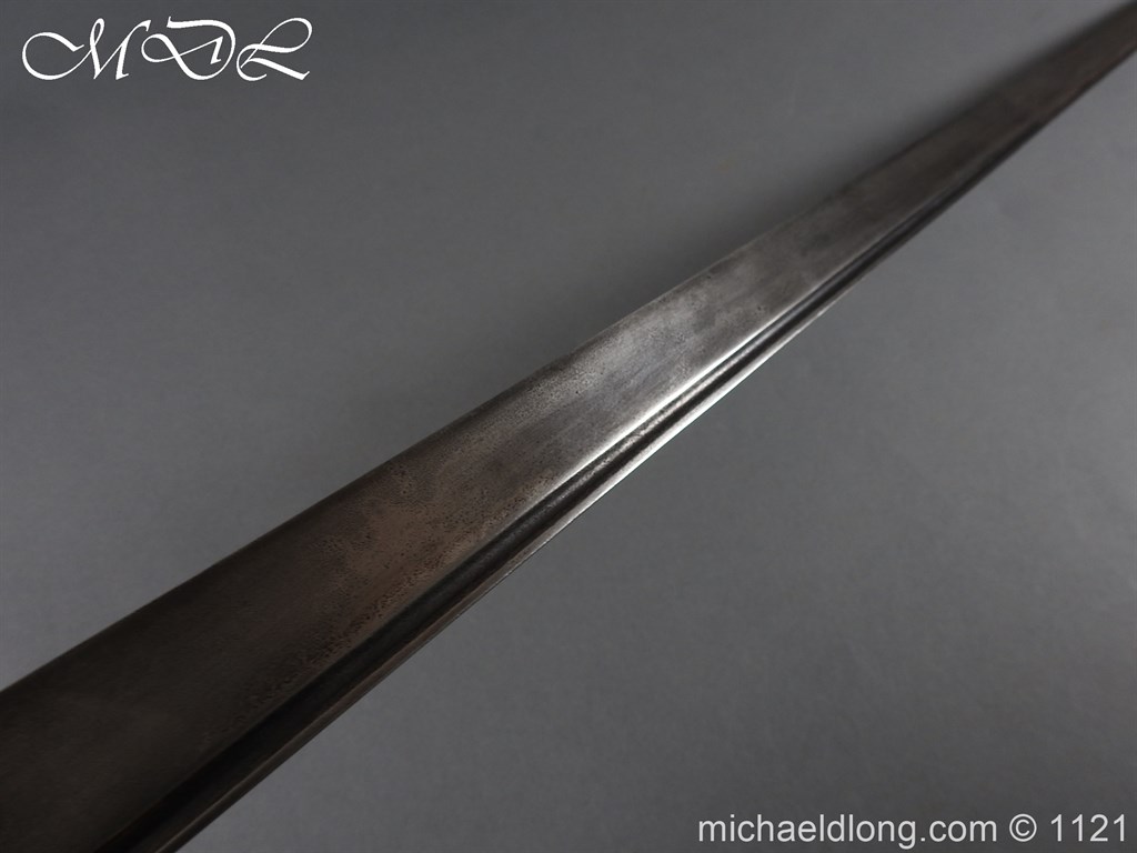 Scottish Back Sword c 1740 – 1760 possibly copied from the style of Walter Allan of Stirling full basket with pieced slots. The pommel domed with chiselled lines and complete with leather grip secured with brass wire. The straight single edged blade has been extensively cleaned to the point that the top small fuller runs out one side slightly shorter than the other and no markings are visible. Overall length 39 inches the blade 33 inches and 1.5 inches in width at the hilt. Please see Swords and Blades of the American Revolution by George Neumann plate 238.S for a similar example of this style of Sword.