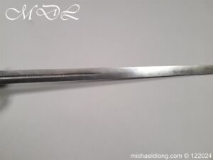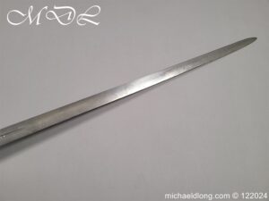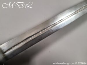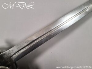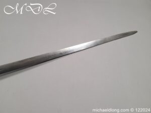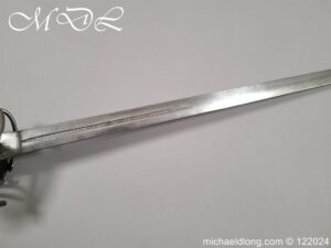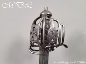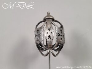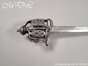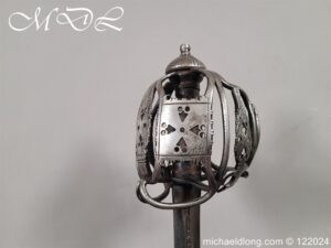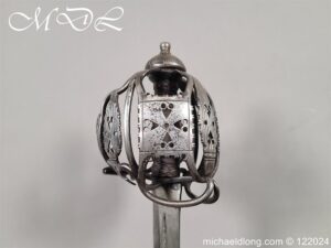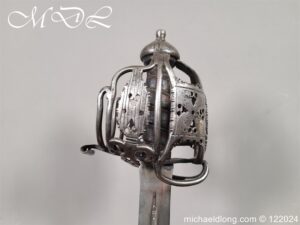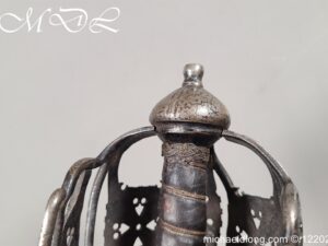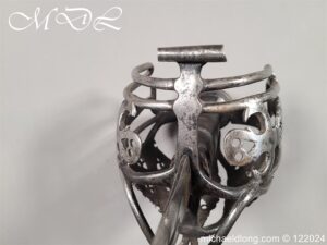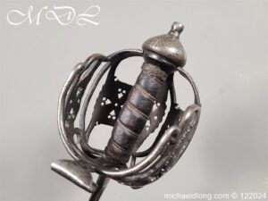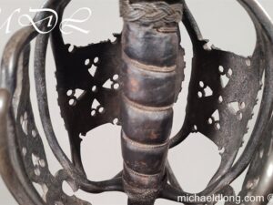 Scottish Basket Hilt Broad Sword c 1740 in good solid condition no rattles. The basket constructed of round and flattened bars with panels pieced with dot and hearts. The domed pommel extended button tang with line decoration matching the basket complete with leather grip secured by twisted silver wire and Turks knots. The blade double edged with small central fuller which is engraved SOLINGEN both sides. Overall length 100cm the blade 85cm. For reference please see Swords and Sword Makers of England and Scotland by Richard Bezdek page 367