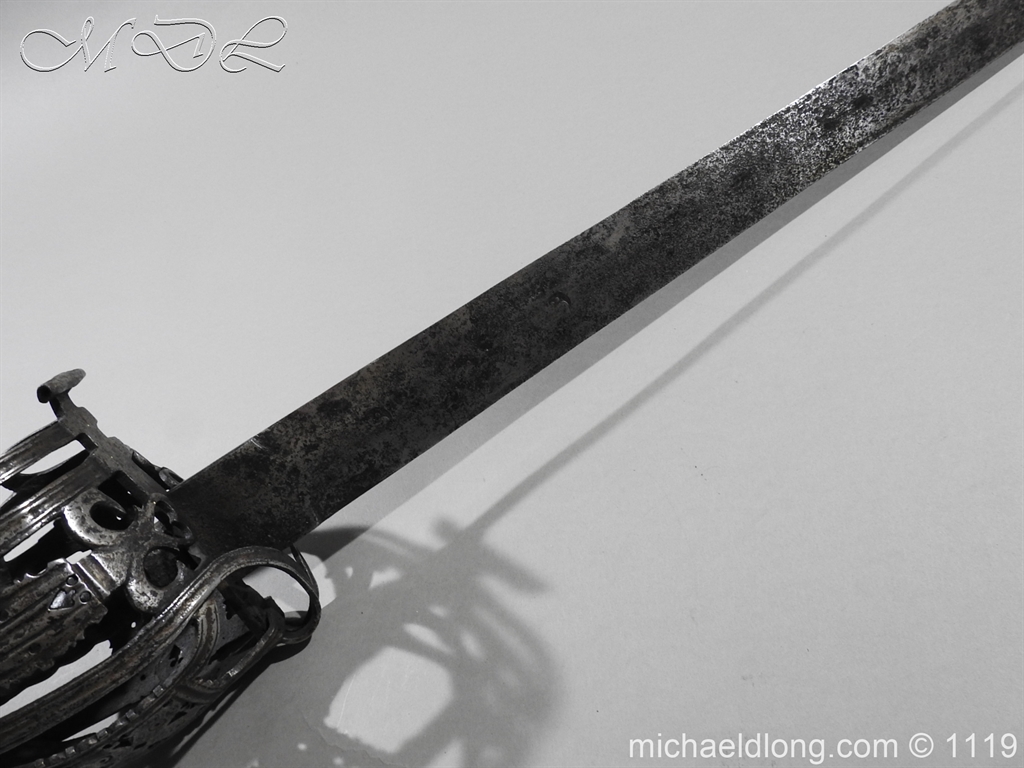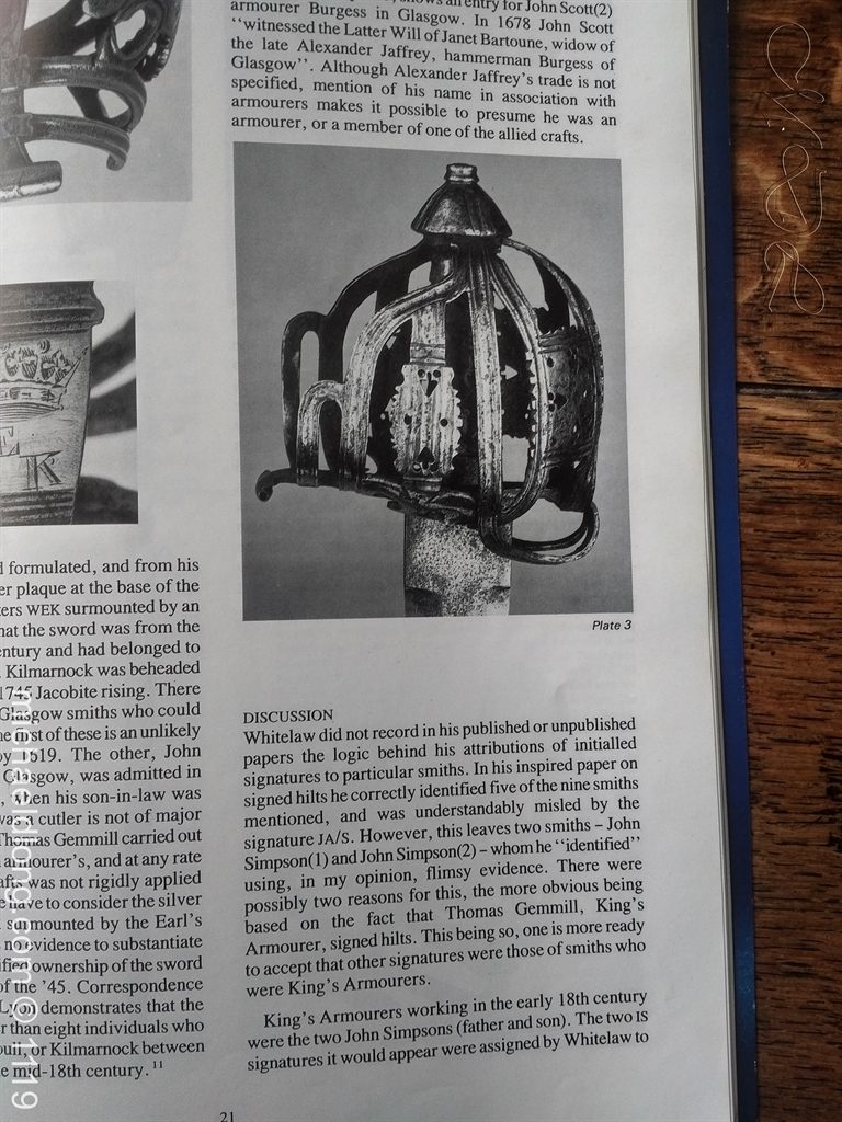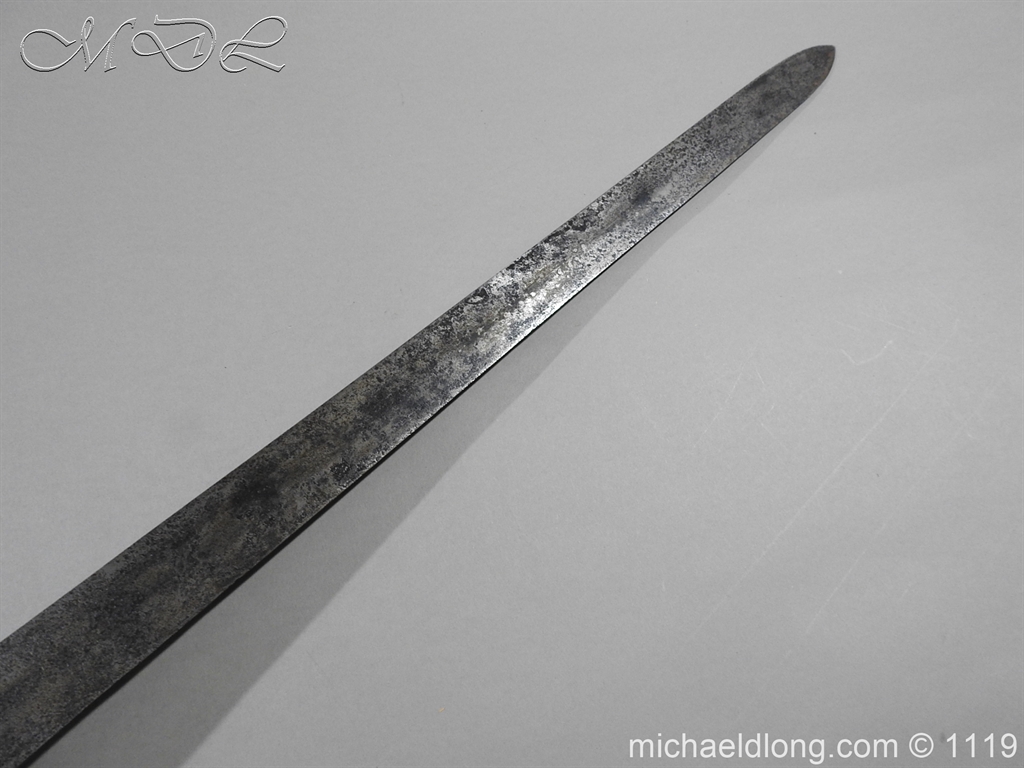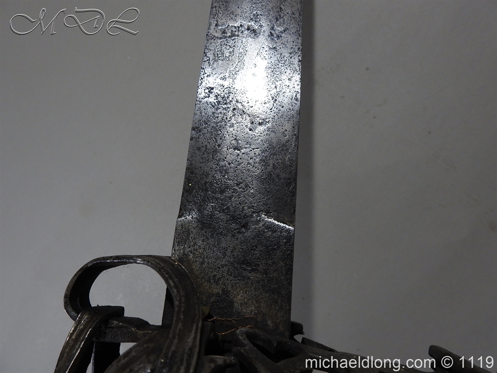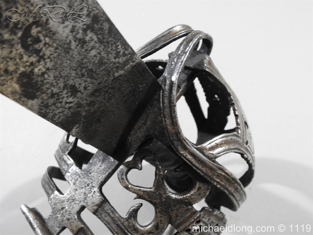 A very interesting sword the hilt is marked AI/G and is very similar to a sword which was featured in an article published in the The Seventh Park Lane Arms Fair Catalogue. It is noted in this article that evidence suggest that attribution of the two signatures IN/G and AI/G should be to the smiths John Napier and Alexander Jaffrey who worked in the second half of the 17th century. The sword is of the same in design looking at the images detailed however the pommel seems to be of a slightly different decoration. Heavy fighting blade with various armours marking and worn leather grip. I have detailed images of the article for reference.