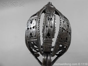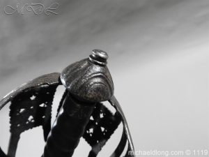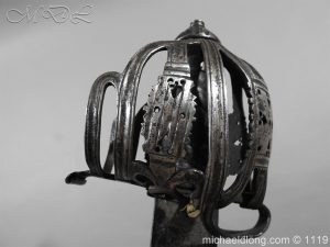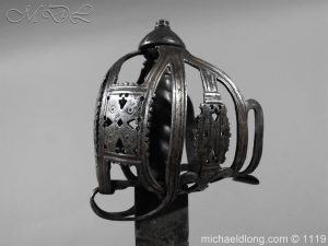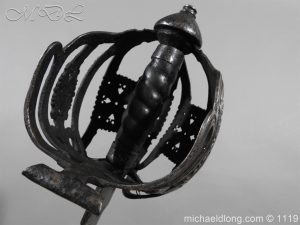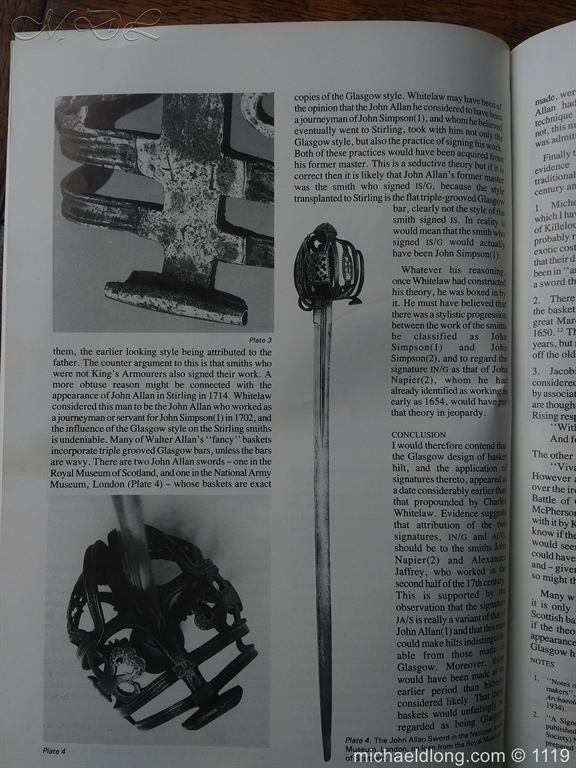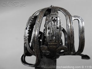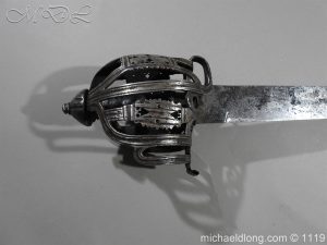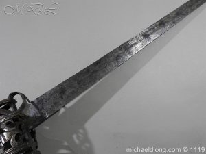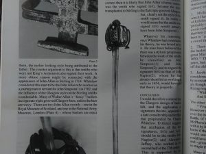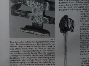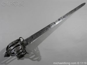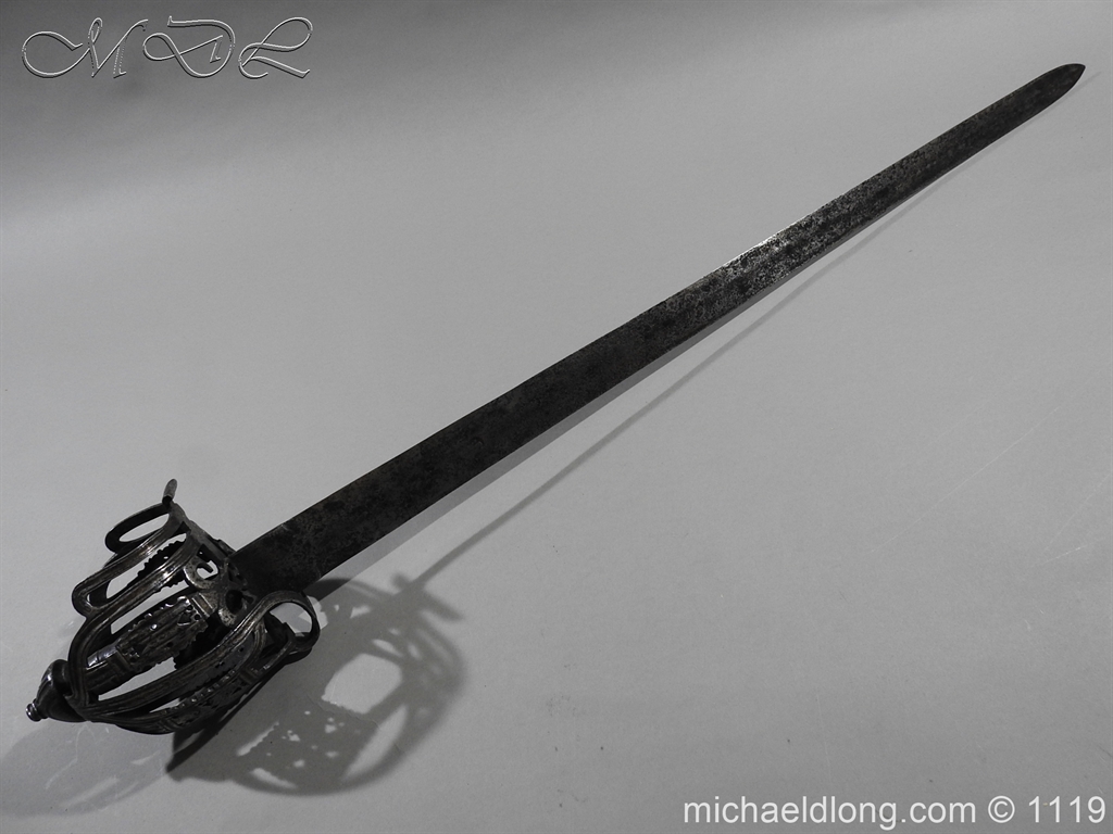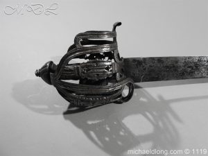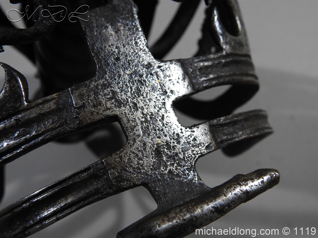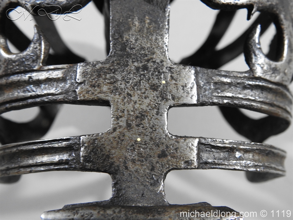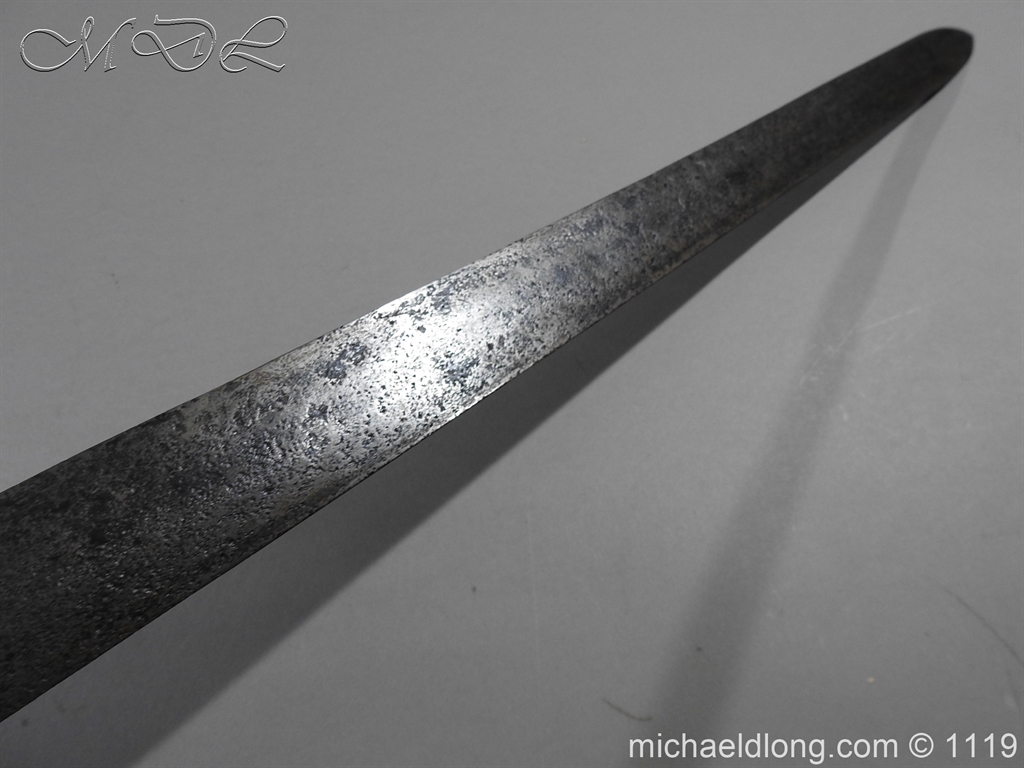 A very interesting sword the hilt is marked AI/G and is very similar to a sword which was featured in an article published in the The Seventh Park Lane Arms Fair Catalogue. It is noted in this article that evidence suggest that attribution of the two signatures IN/G and AI/G should be to the smiths John Napier and Alexander Jaffrey who worked in the second half of the 17th century. The sword is of the same in design looking at the images detailed however the pommel seems to be of a slightly different decoration. Heavy fighting blade with various armours marking and worn leather grip. I have detailed images of the article for reference.