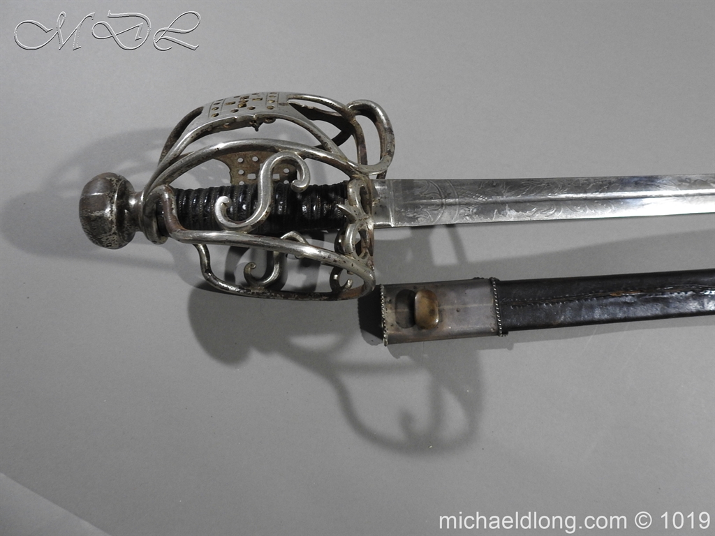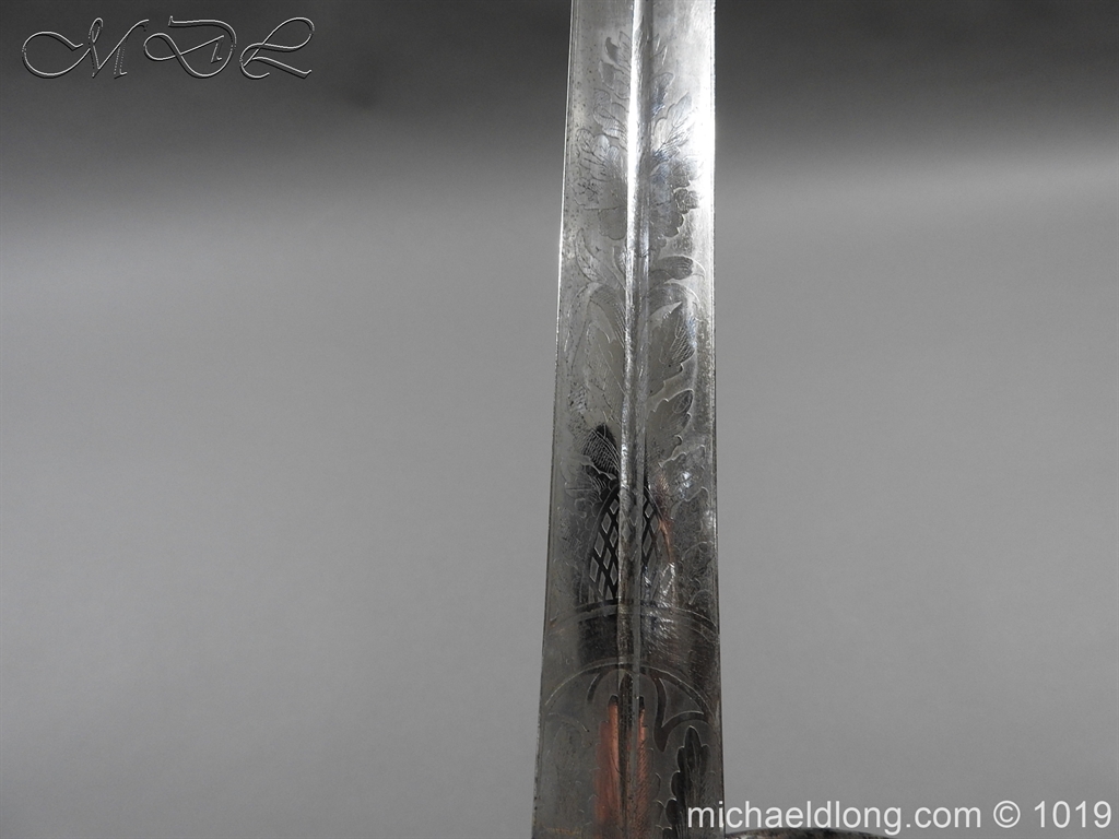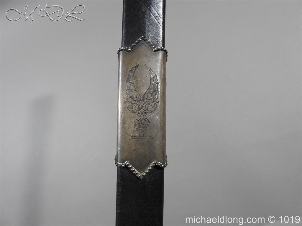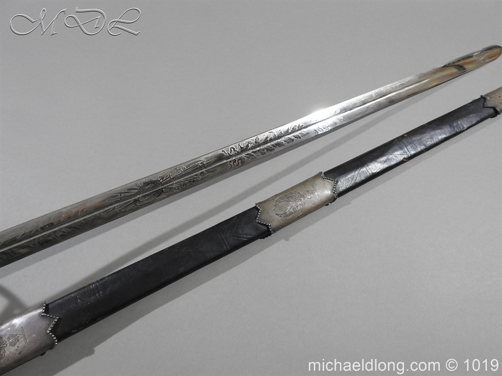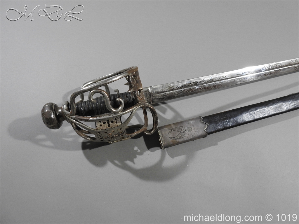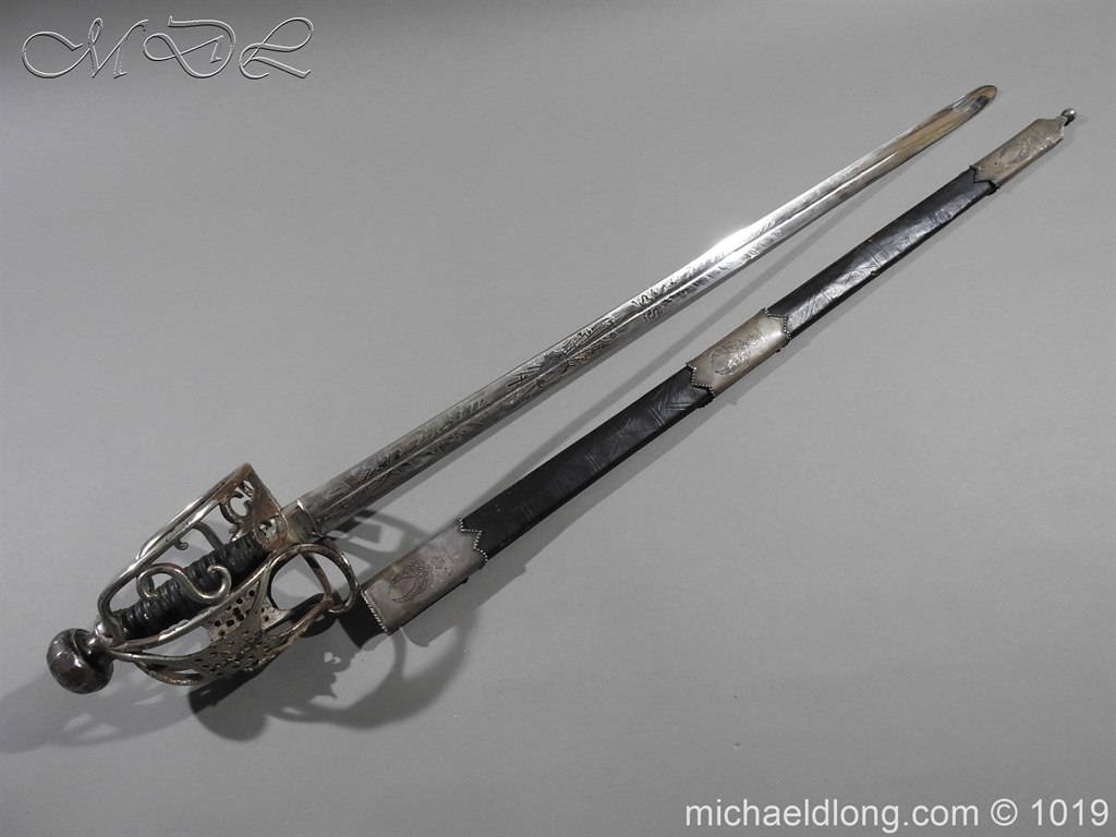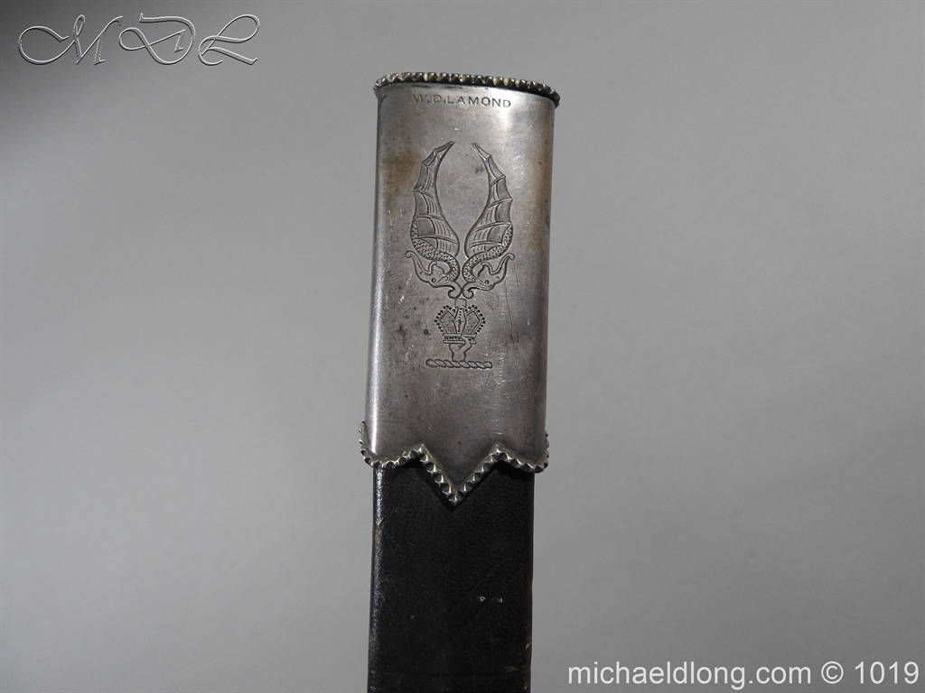 Very interesting Scottish dress sword names to W D Lamond good formed basket with some plating loss and family crest mounted to the rear. Leather grip bound by brass twisted wire. The straight German made double edged blade engraved with trophies of arms and floral decoration in very good condition with small central fuller. It is contained in a black tooled scabbard with silver mounts all engraved with the family crest and named. Overall length 84cm the blade 69cm