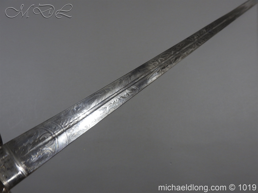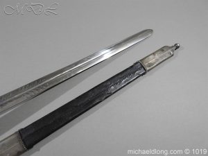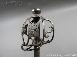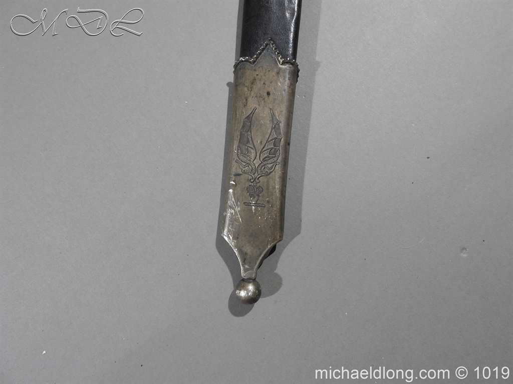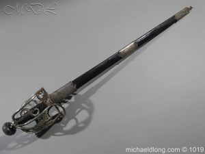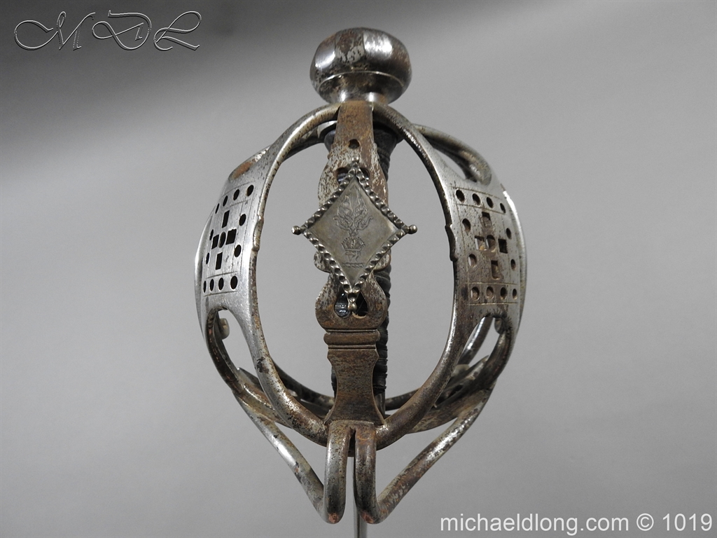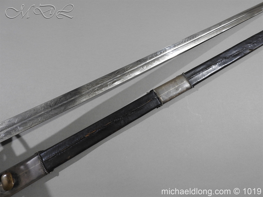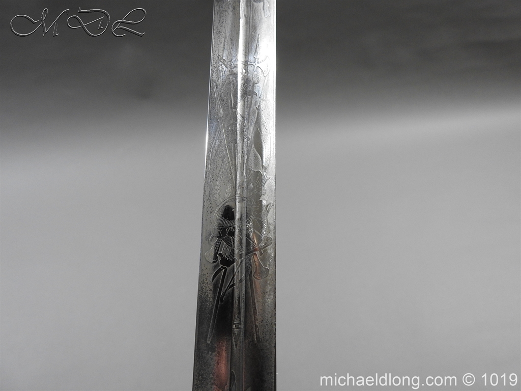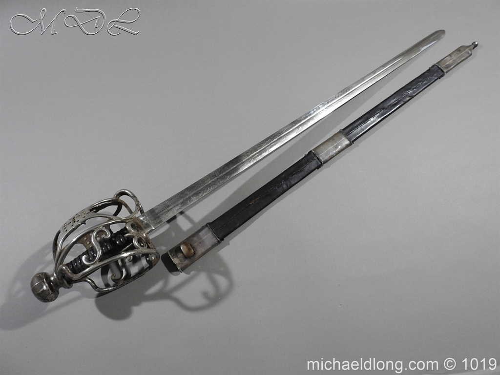 Very interesting Scottish dress sword names to W D Lamond good formed basket with some plating loss and family crest mounted to the rear. Leather grip bound by brass twisted wire. The straight German made double edged blade engraved with trophies of arms and floral decoration in very good condition with small central fuller. It is contained in a black tooled scabbard with silver mounts all engraved with the family crest and named. Overall length 84cm the blade 69cm