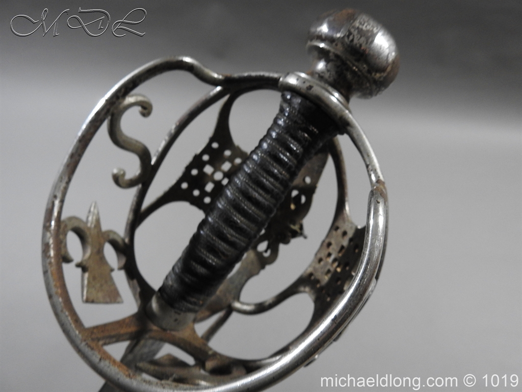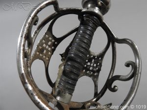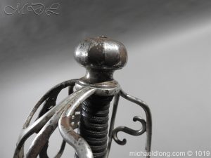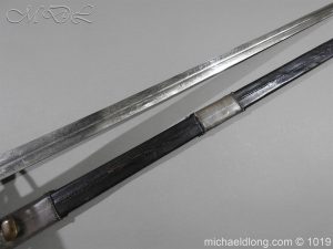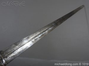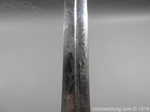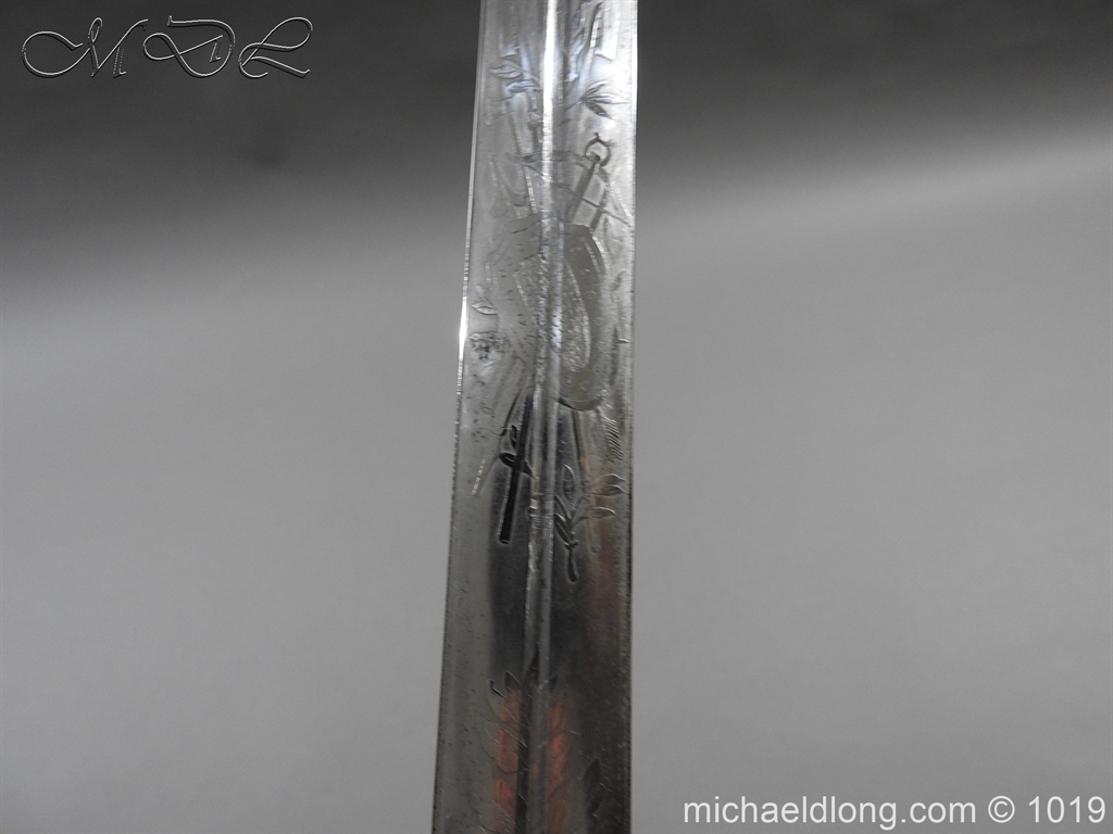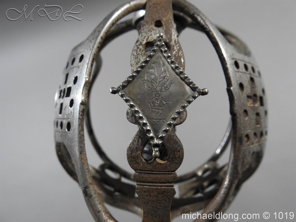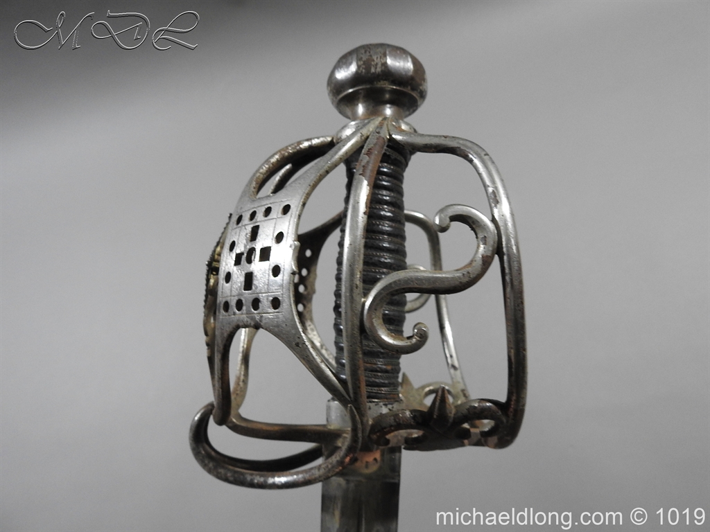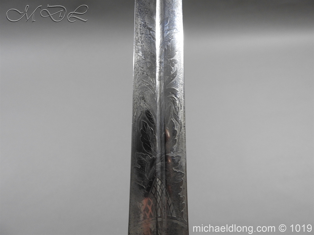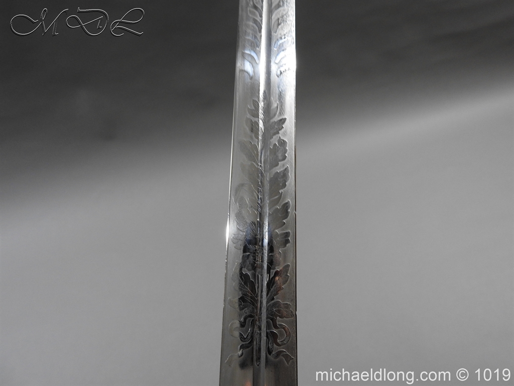 Very interesting Scottish dress sword names to W D Lamond good formed basket with some plating loss and family crest mounted to the rear. Leather grip bound by brass twisted wire. The straight German made double edged blade engraved with trophies of arms and floral decoration in very good condition with small central fuller. It is contained in a black tooled scabbard with silver mounts all engraved with the family crest and named. Overall length 84cm the blade 69cm