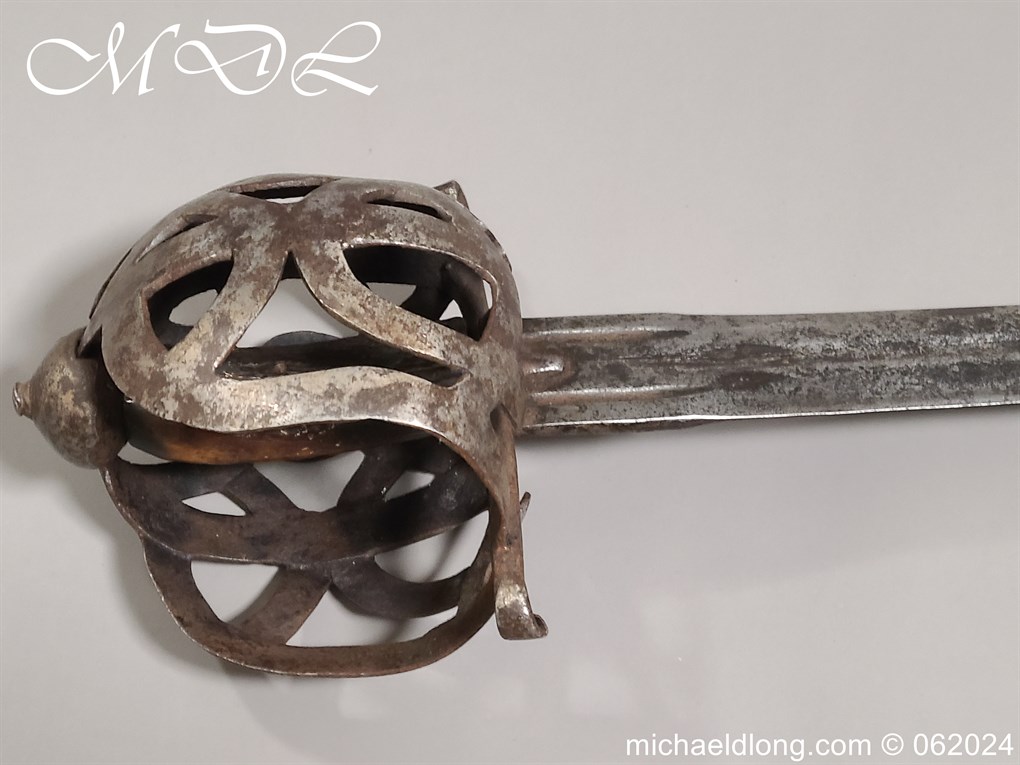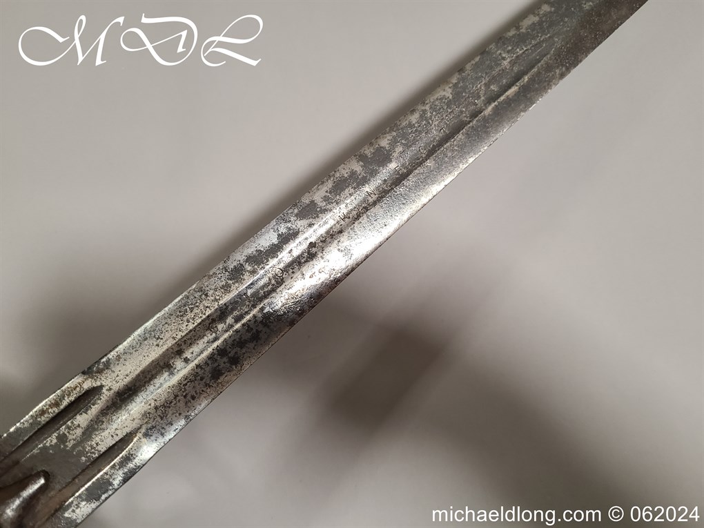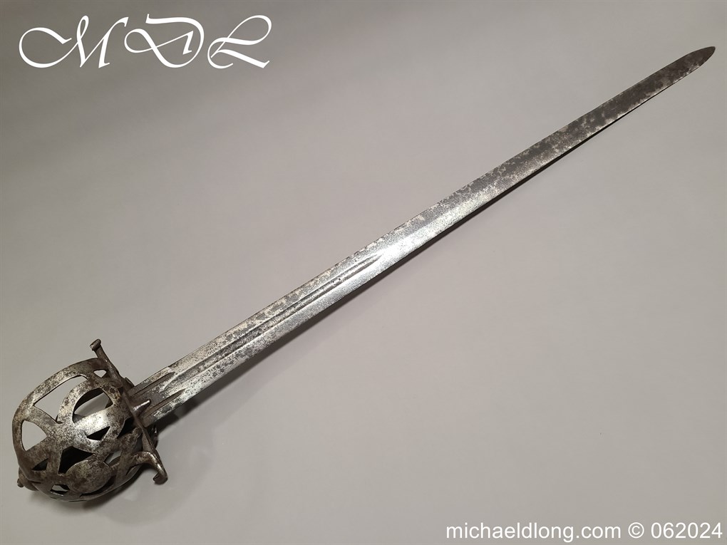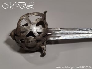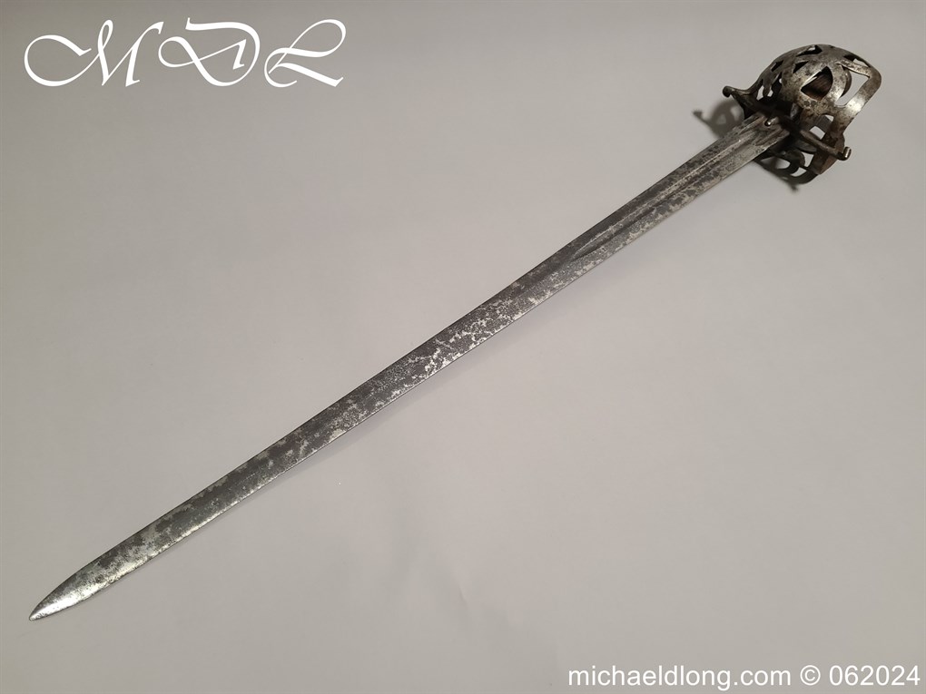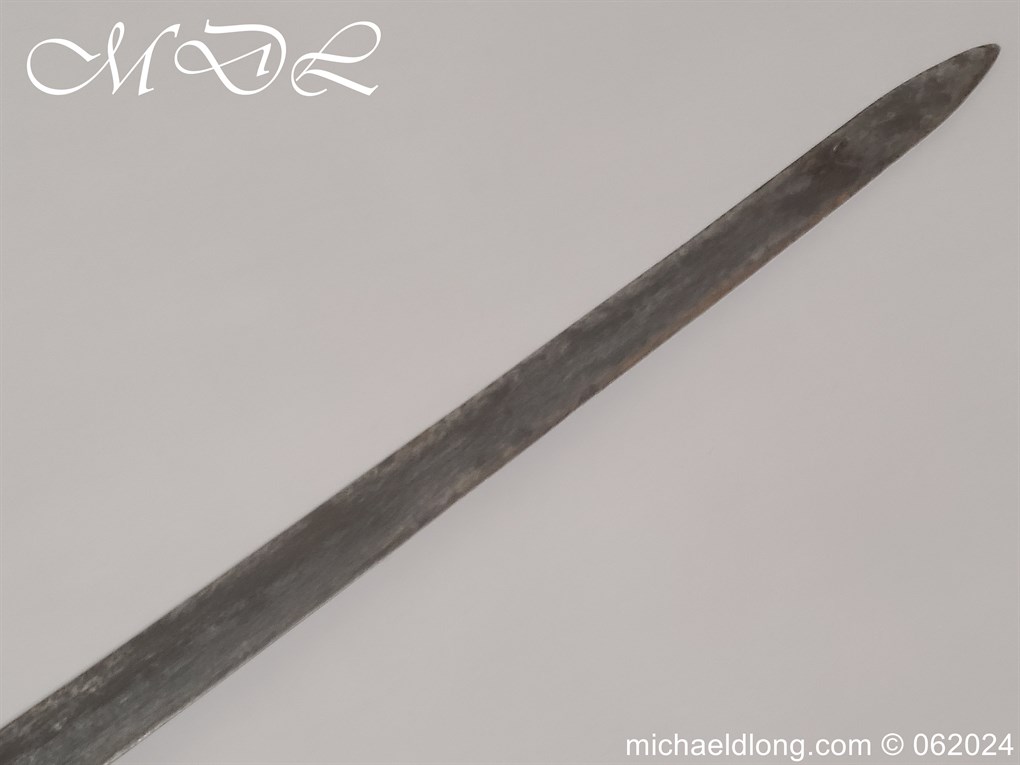 Scottish Beak Neb Ribbon Hilt Sword mid 18th century. This sword has the characteristic beaked form with flat iron bars and original stag horn grip which has age wear and fits nicely in the hand. The wide blade double edged slowly tapering with two short and one central fuller running for 32cm of the blade. It is struck with various marking and GIO KNEGT to one side and Solingen to the reverse. We are assuming the blade was made by Georg Peter Knecht Jr. 1702–1773 dating the sword to mid 18th century Overall length 98cm the blade 85cm