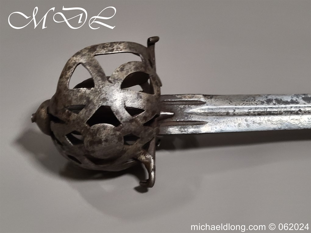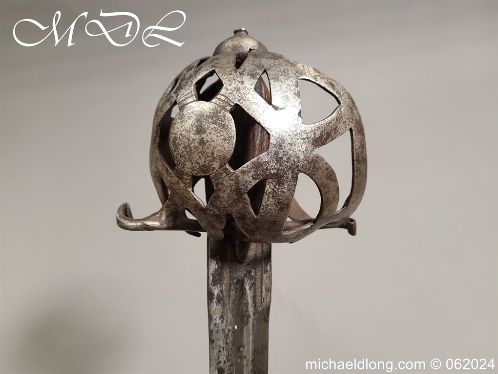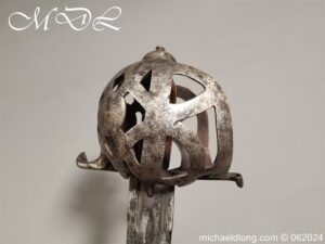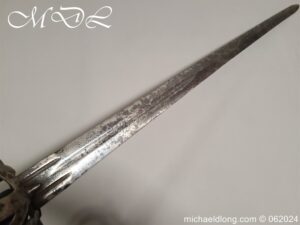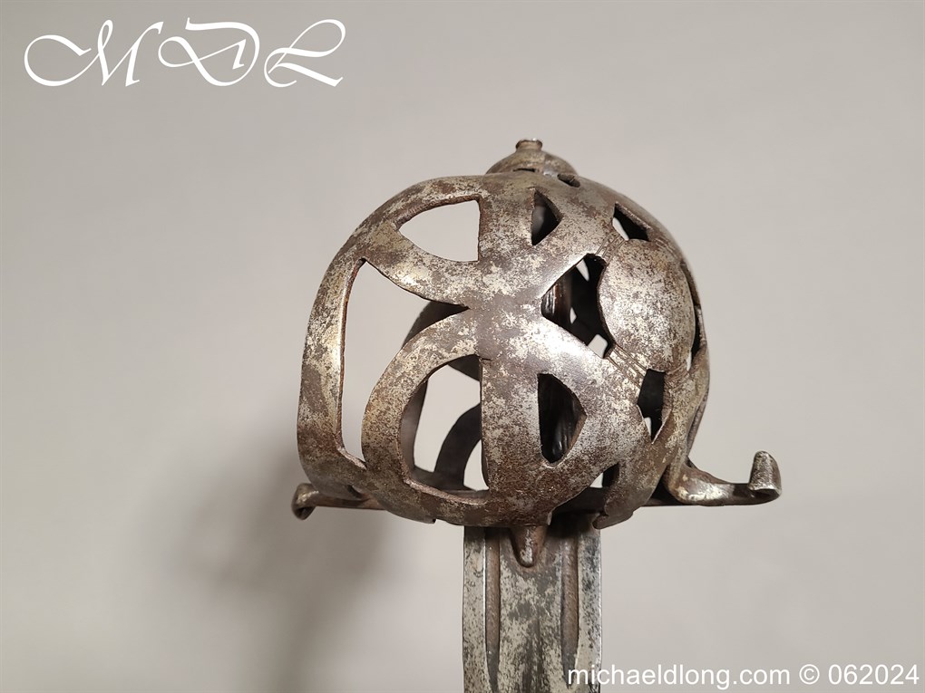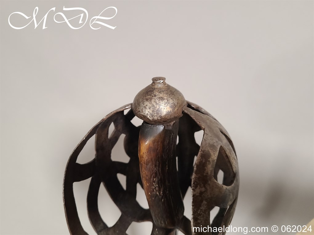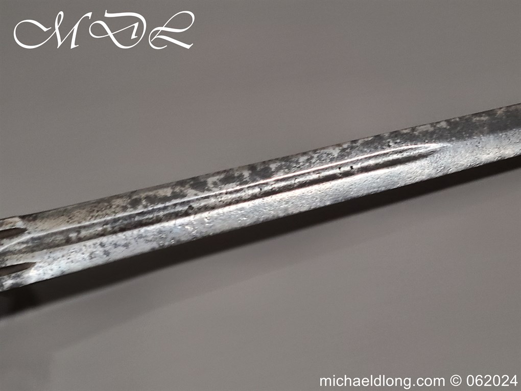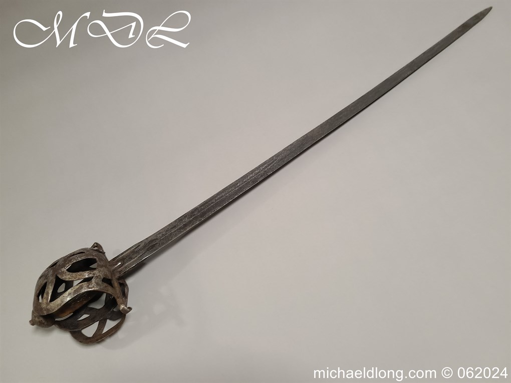 Scottish Beak Neb Ribbon Hilt Sword mid 18th century. This sword has the characteristic beaked form with flat iron bars and original stag horn grip which has age wear and fits nicely in the hand. The wide blade double edged slowly tapering with two short and one central fuller running for 32cm of the blade. It is struck with various marking and GIO KNEGT to one side and Solingen to the reverse. We are assuming the blade was made by Georg Peter Knecht Jr. 1702–1773 dating the sword to mid 18th century Overall length 98cm the blade 85cm