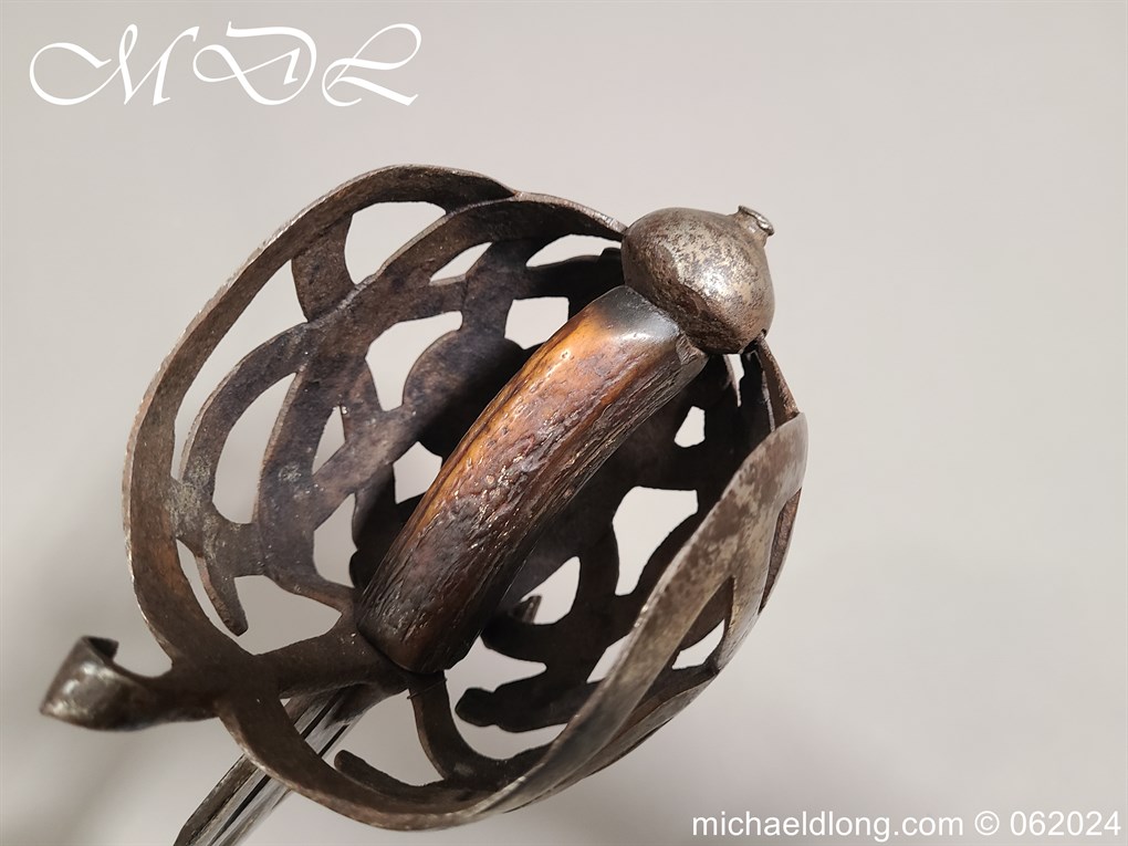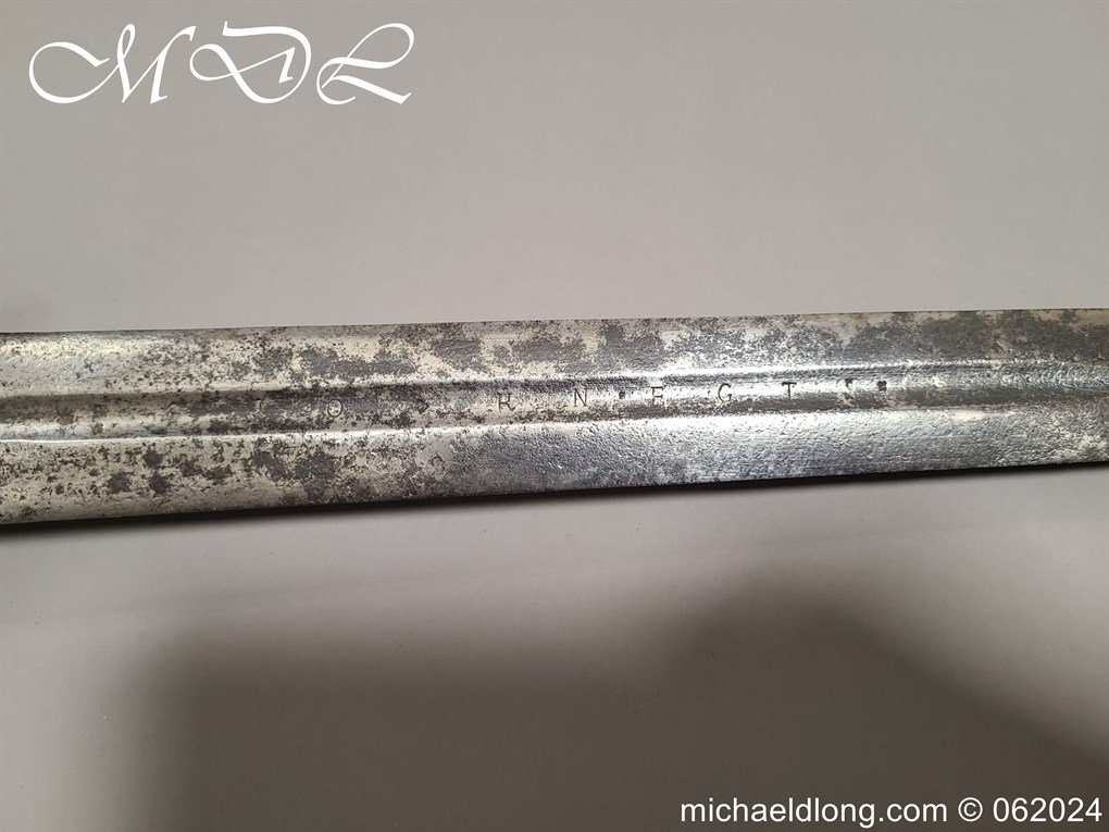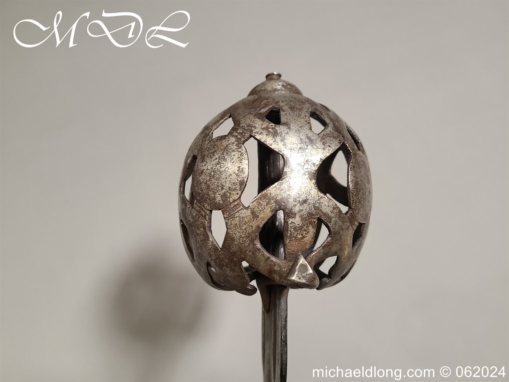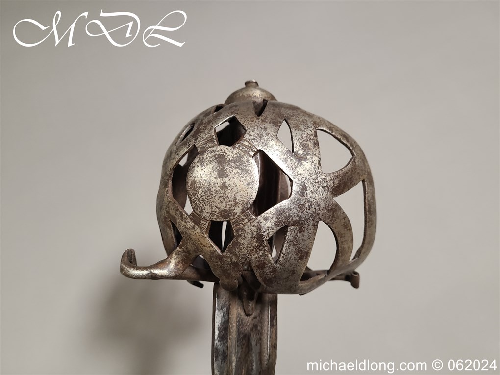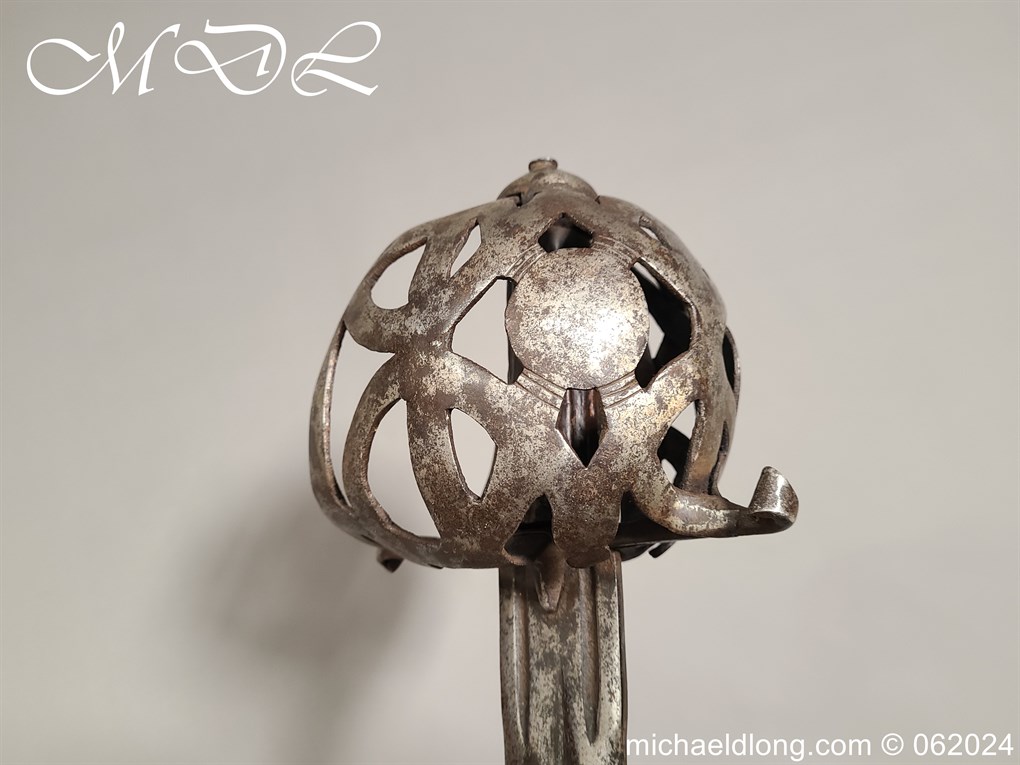 Scottish Beak Neb Ribbon Hilt Sword mid 18th century. This sword has the characteristic beaked form with flat iron bars and original stag horn grip which has age wear and fits nicely in the hand. The wide blade double edged slowly tapering with two short and one central fuller running for 32cm of the blade. It is struck with various marking and GIO KNEGT to one side and Solingen to the reverse. We are assuming the blade was made by Georg Peter Knecht Jr. 1702–1773 dating the sword to mid 18th century Overall length 98cm the blade 85cm