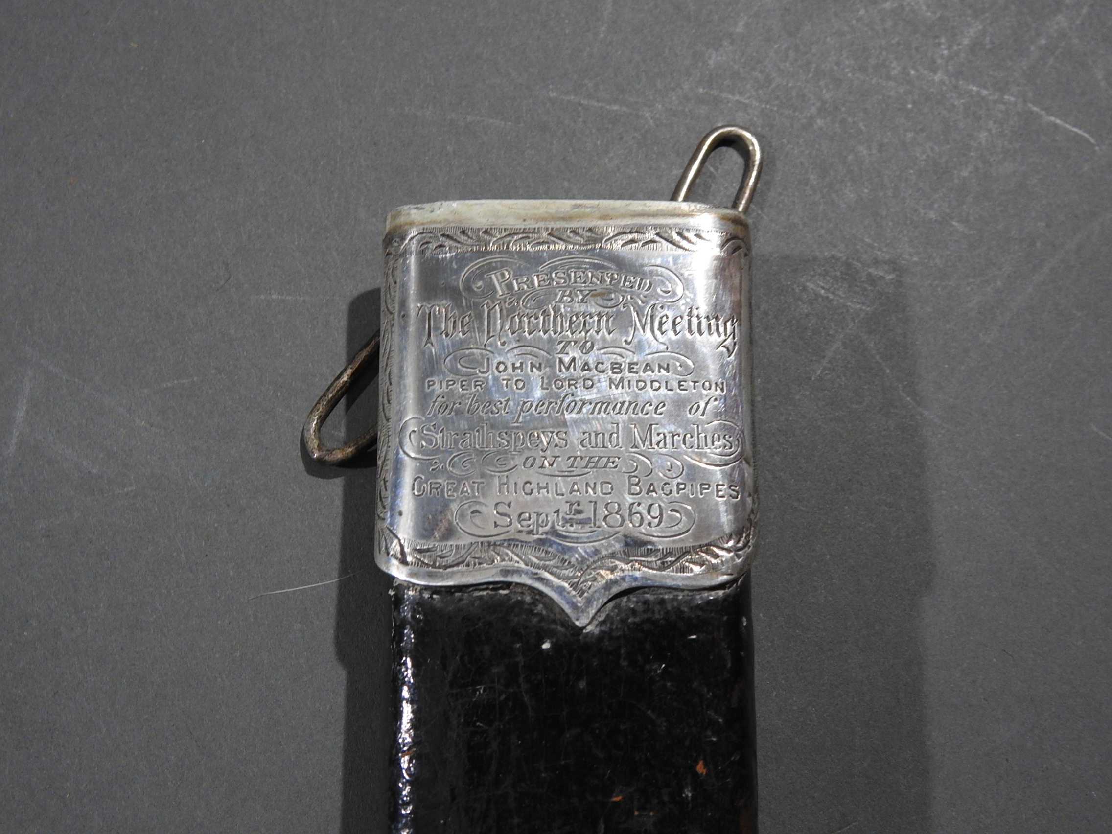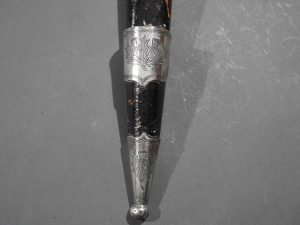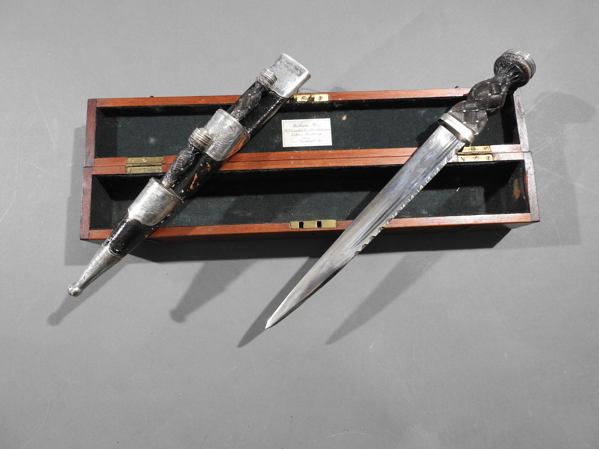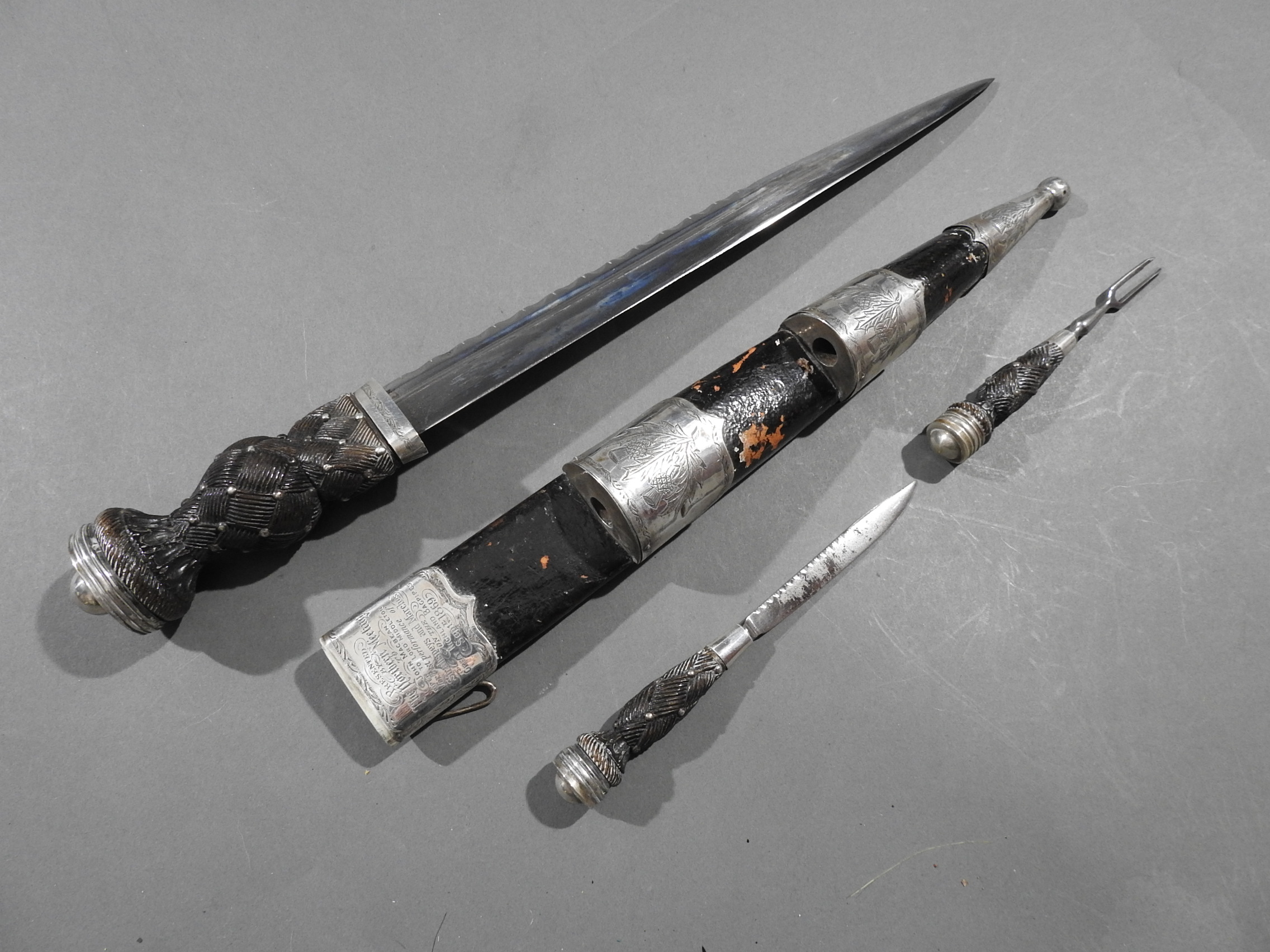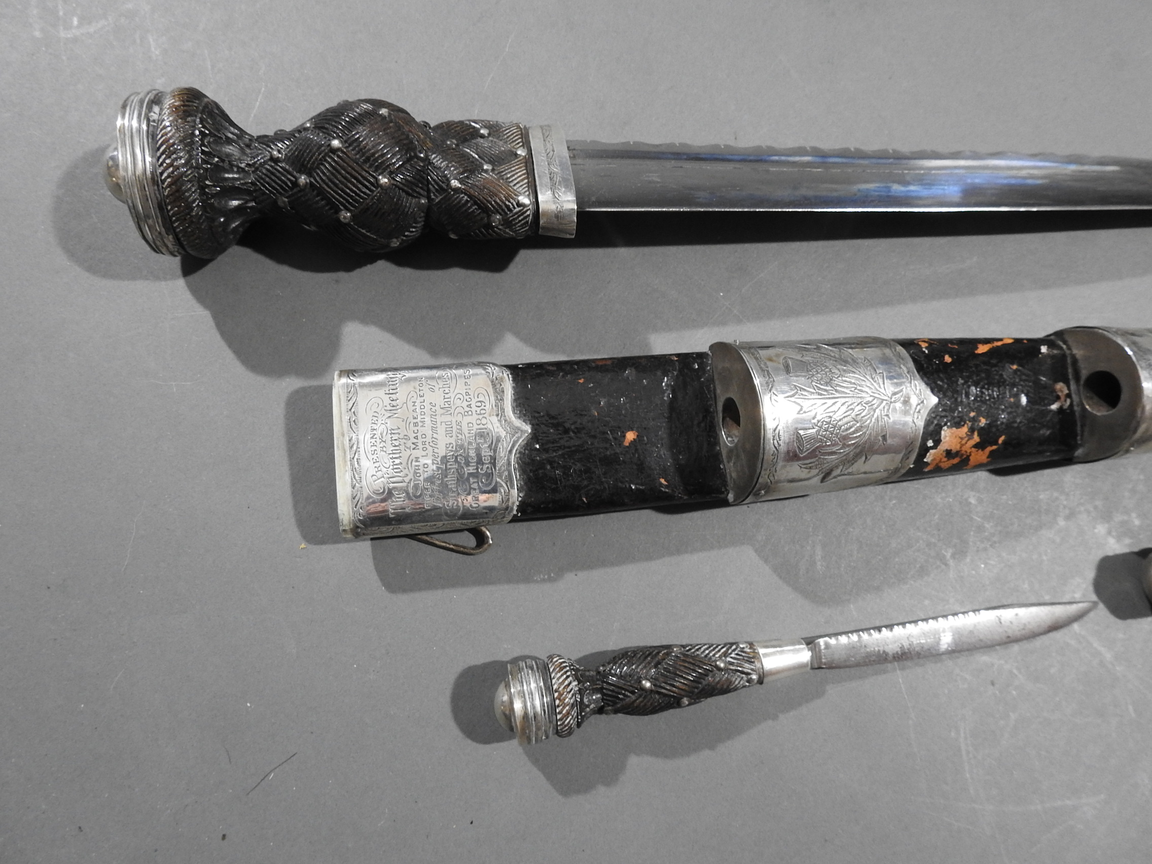 Excellent presentation dirk with the following inscription, Presented by The Northern Meeting to John Macbean Piper to Lord Middleton for best performance of Strathspeys and Marches on the Great Highland Bagpipes Sept 1869. With silver engraved mounts not hallmarked but do test for silver, complete with matching knife and fork, studded curved hilt with silver pommel and contained within velvet linned wooded box with makers label William Ross