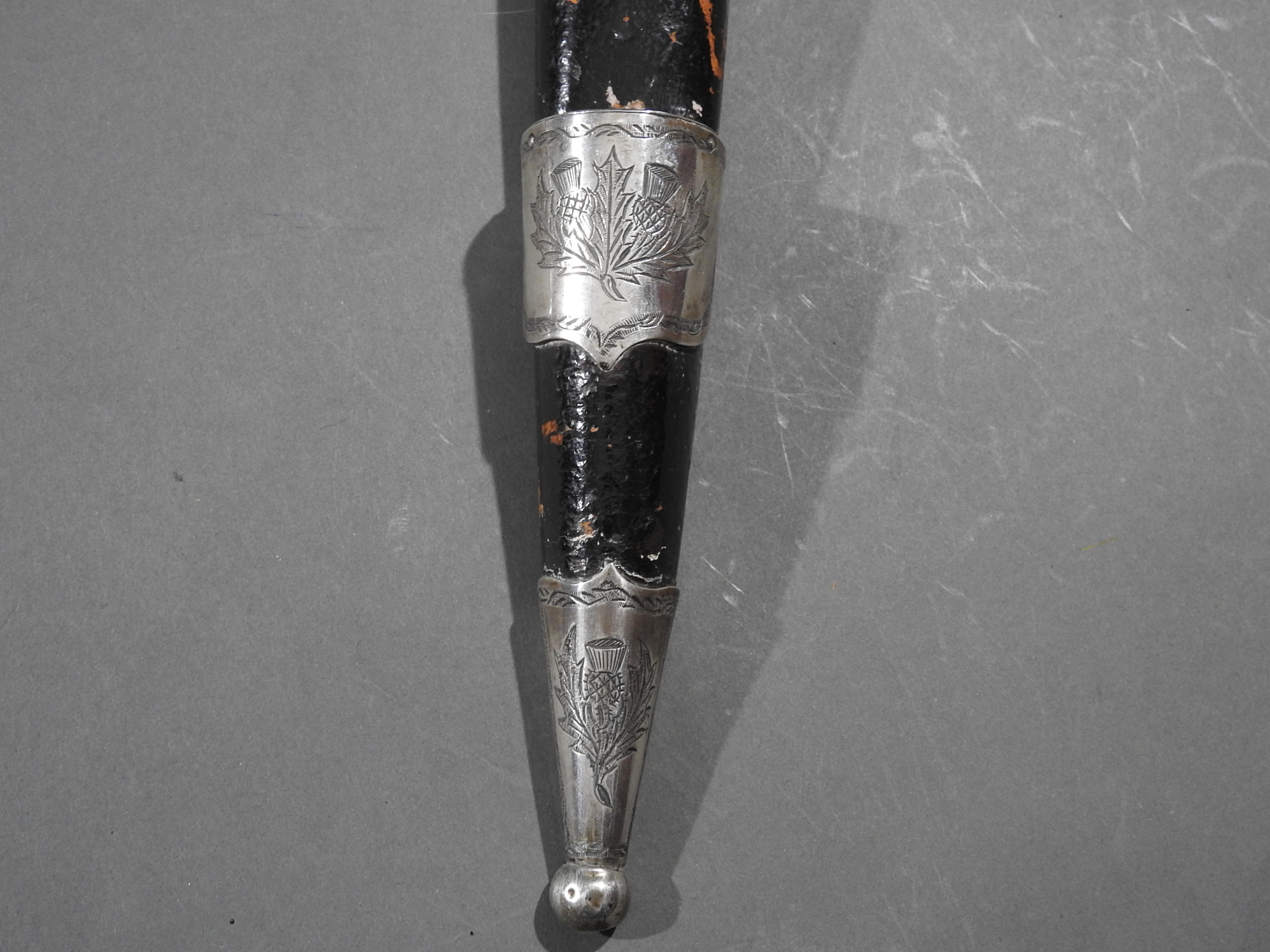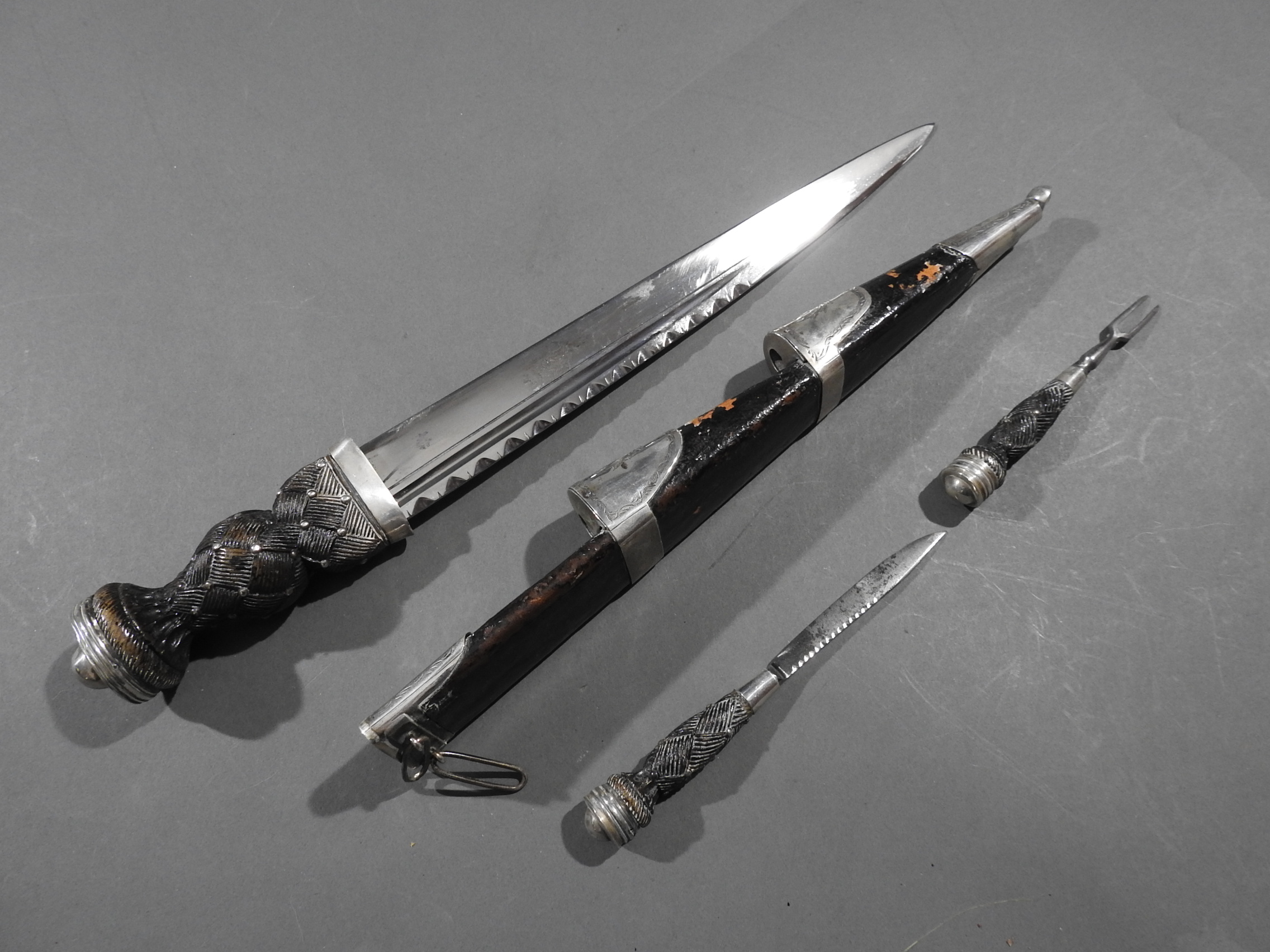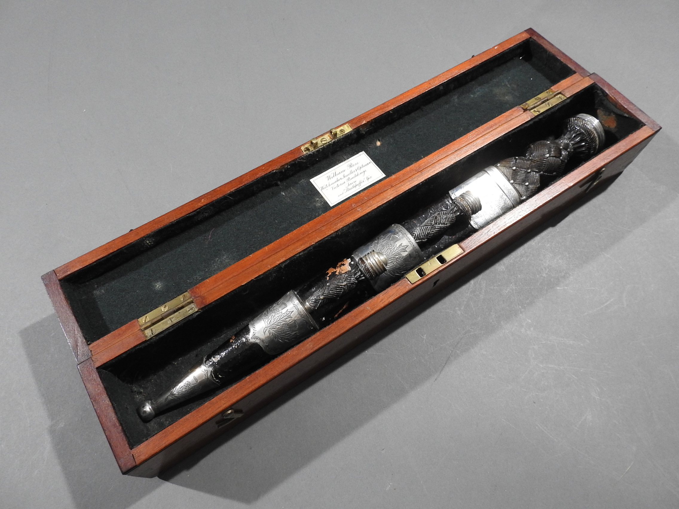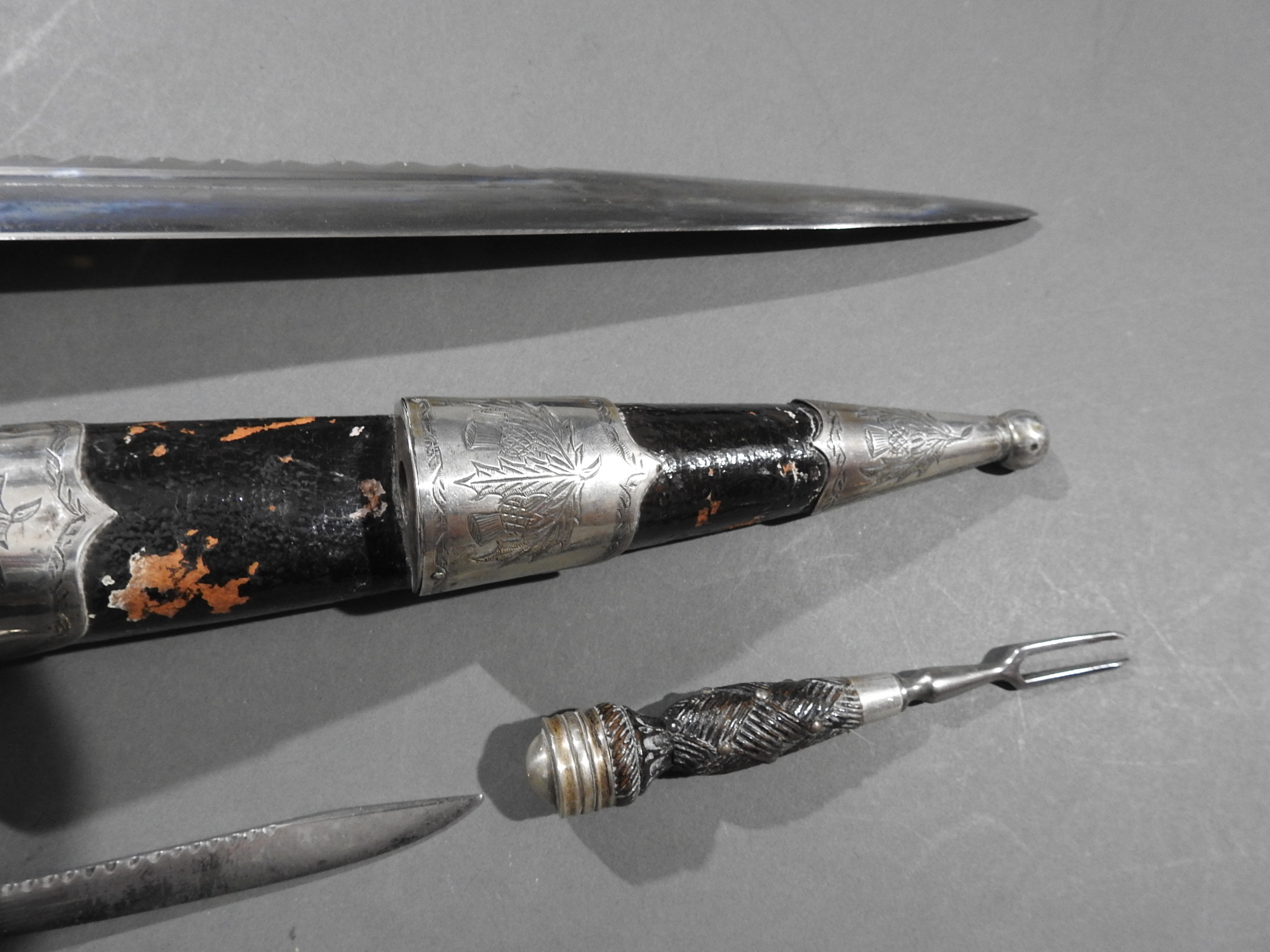 Excellent presentation dirk with the following inscription, Presented by The Northern Meeting to John Macbean Piper to Lord Middleton for best performance of Strathspeys and Marches on the Great Highland Bagpipes Sept 1869. With silver engraved mounts not hallmarked but do test for silver, complete with matching knife and fork, studded curved hilt with silver pommel and contained within velvet linned wooded box with makers label William Ross