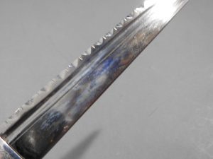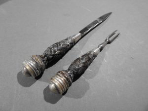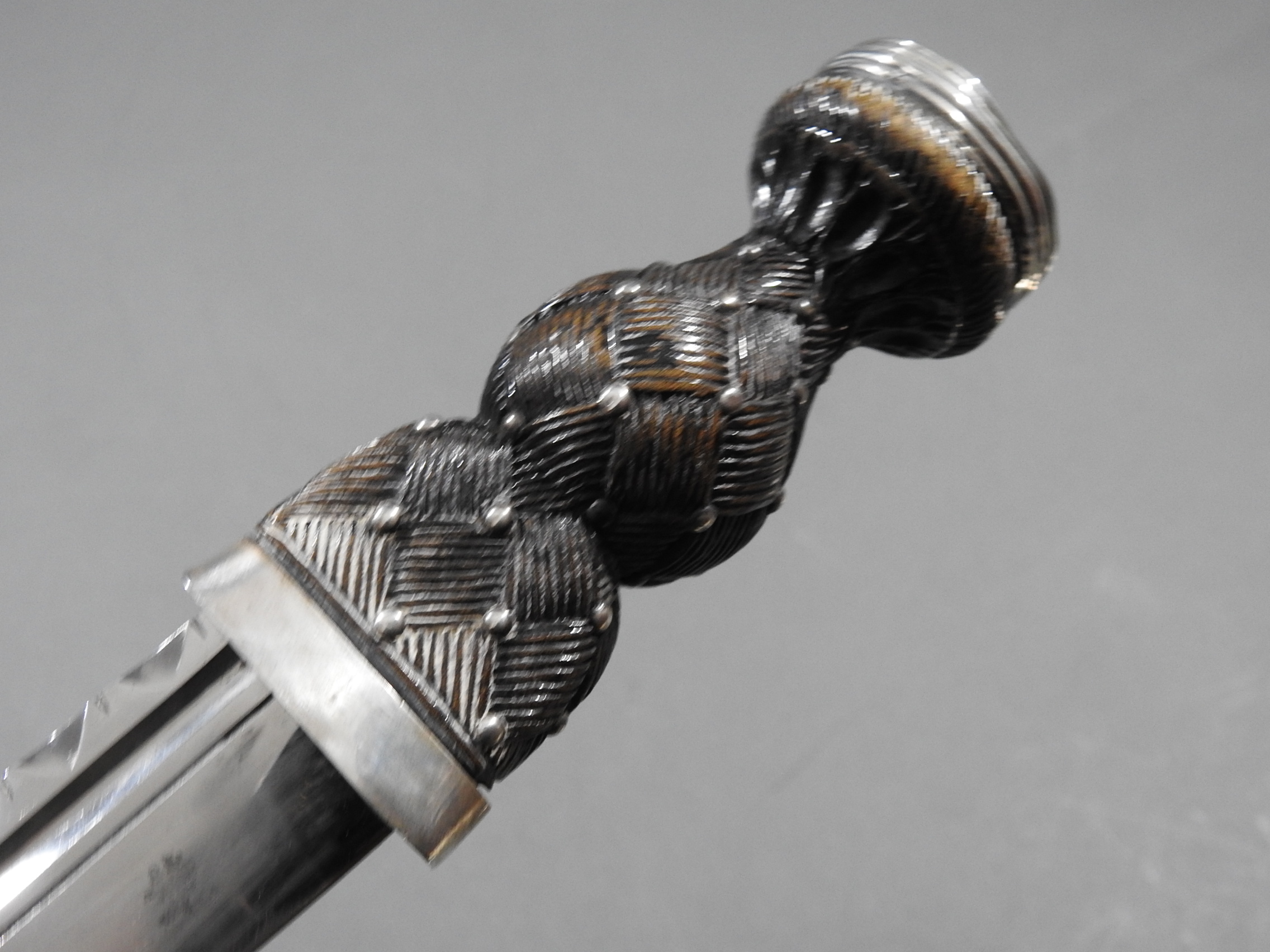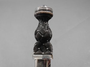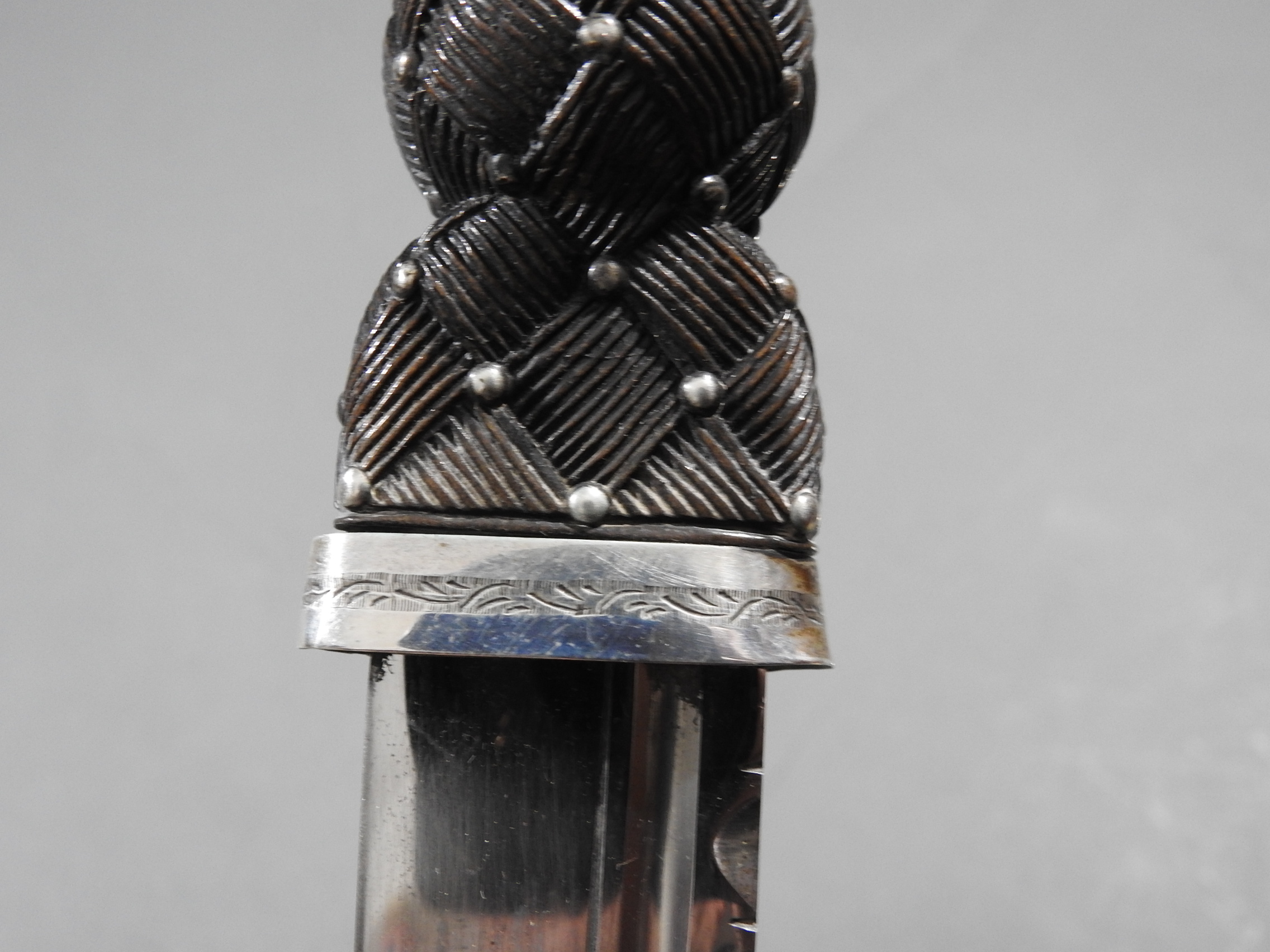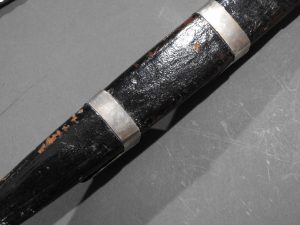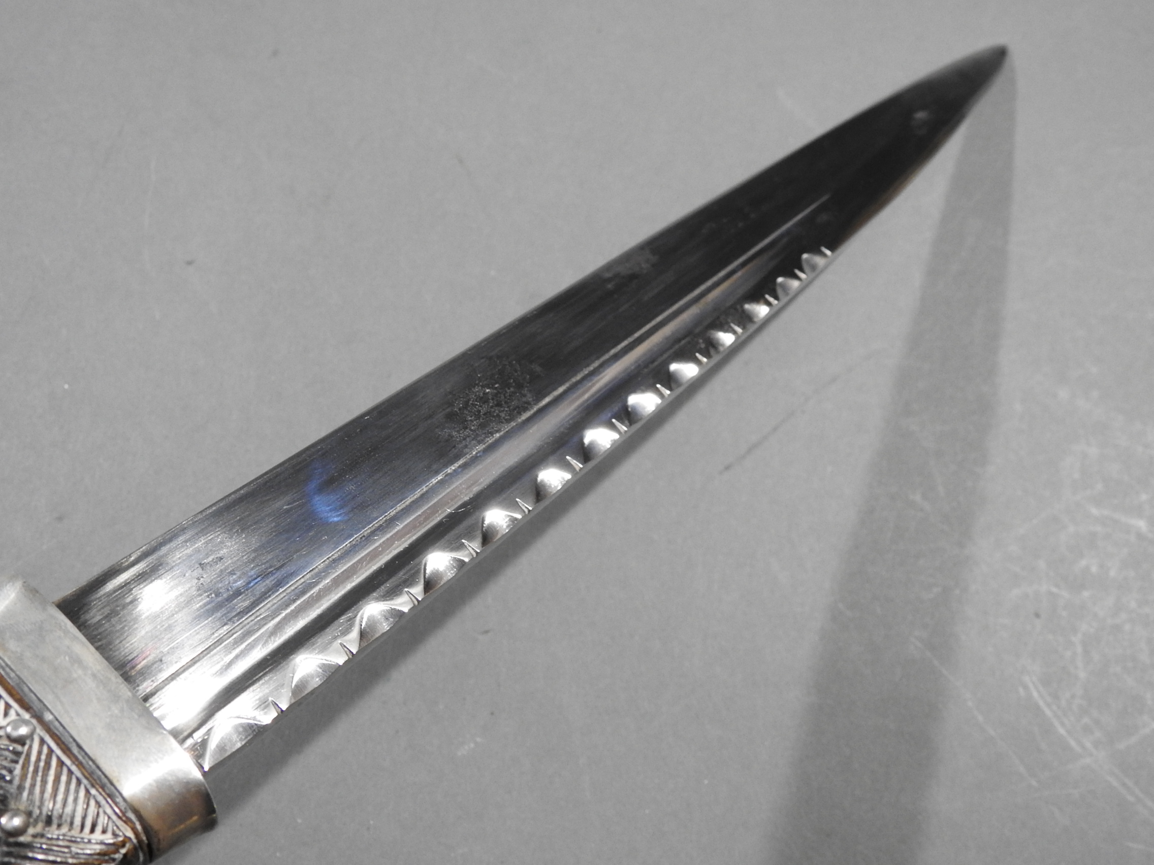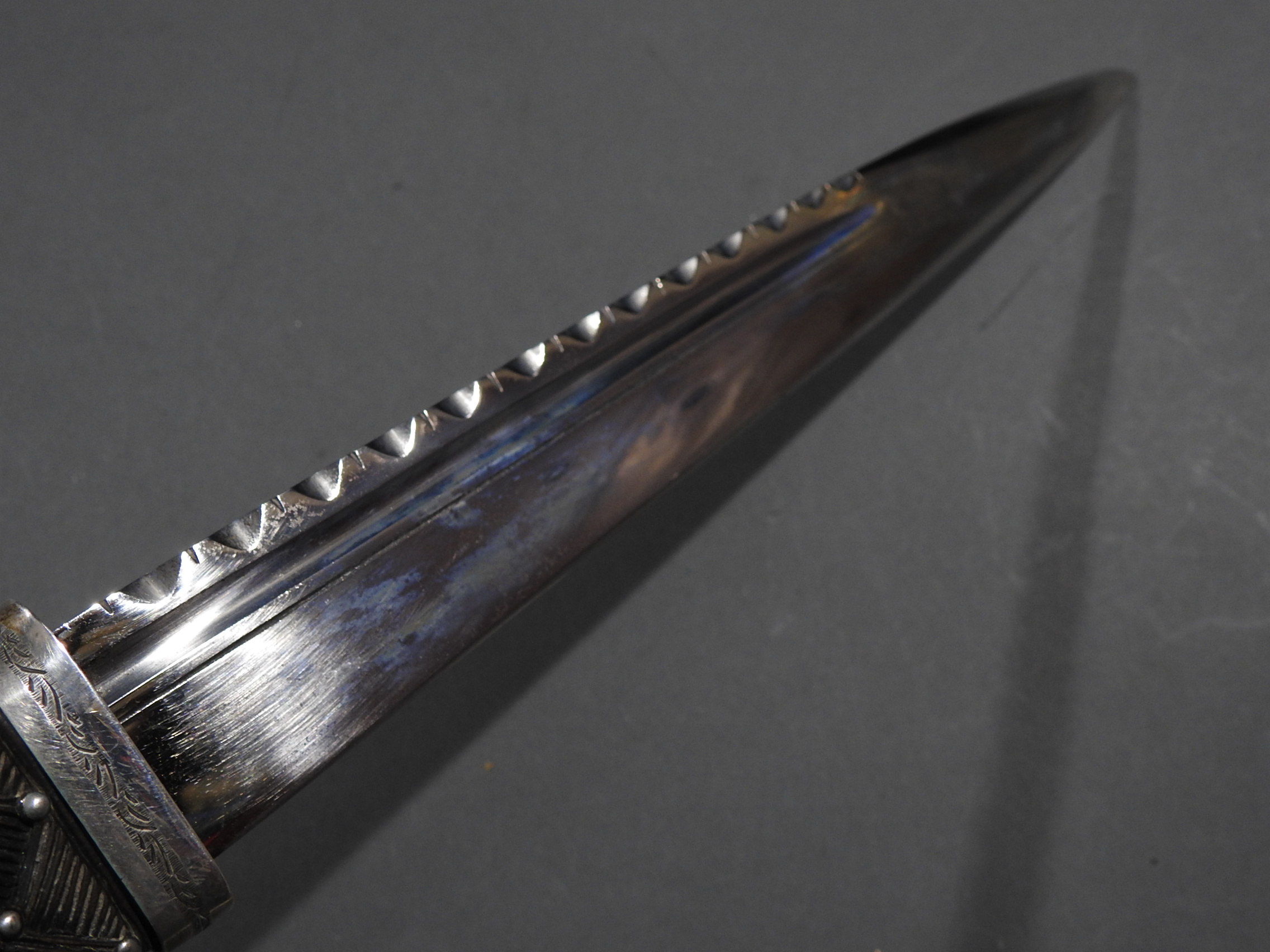 Excellent presentation dirk with the following inscription, Presented by The Northern Meeting to John Macbean Piper to Lord Middleton for best performance of Strathspeys and Marches on the Great Highland Bagpipes Sept 1869. With silver engraved mounts not hallmarked but do test for silver, complete with matching knife and fork, studded curved hilt with silver pommel and contained within velvet linned wooded box with makers label William Ross